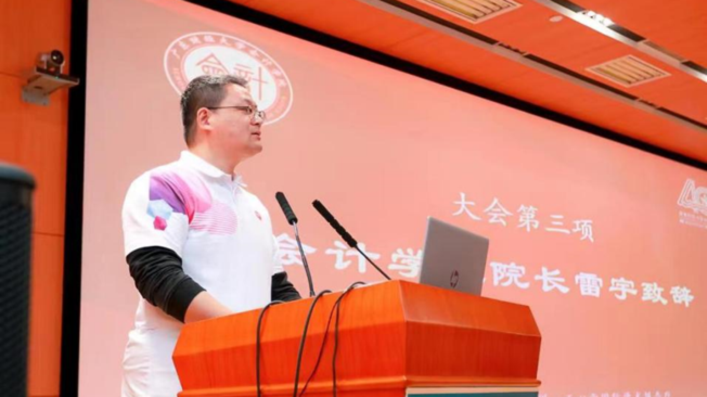 会计学院院长雷宇致辞。他首先感谢为学院发展提供帮助的各位领导、老师、校友以及各界朋友。他表示会计学院的建设和发展与国家的发展紧密相连,学院如今的建树既得益于紧跟党的步伐,又离不开历年教职工的共同努力。值此建院40周年之际,学院明确了 “明德、求是、务实、创新” 的院训,并希望师生、校友们共同努力,赓续接力,共同建设有贡献有情怀有温度的会计学院。