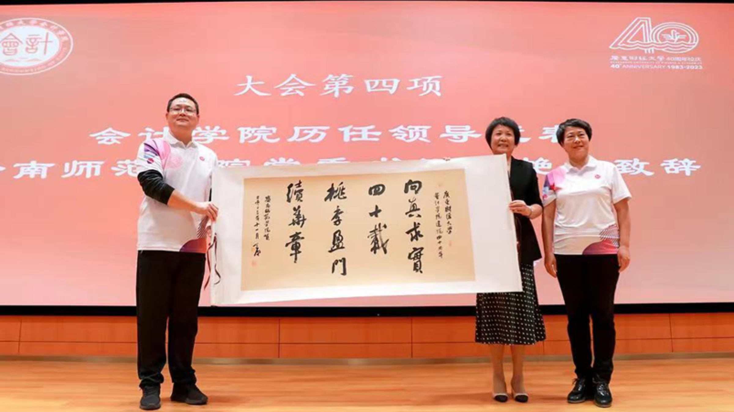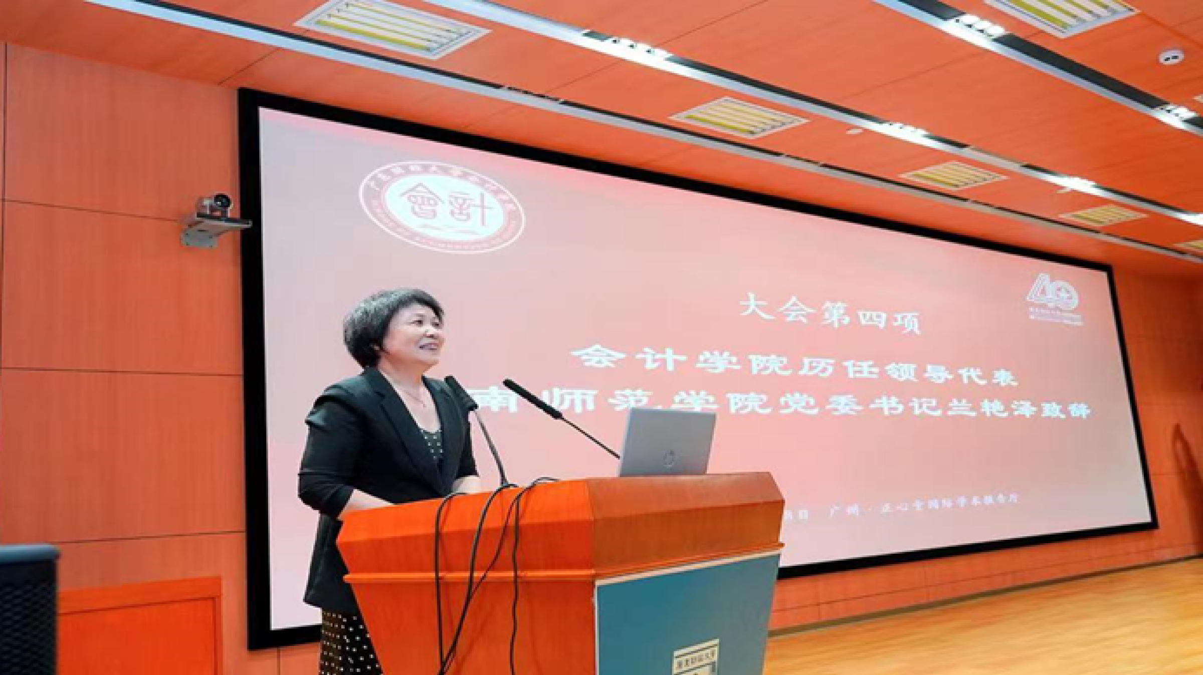 会计学院历任领导代表兰艳泽以“祝贺”、“感谢”和“希望”三个关键词表达了对会计学院的深厚情谊和美好祝愿。 祝贺学院40周年生日快乐,祝愿学院前途无量; 感谢彭翠峰书记、雷宇院长的邀请,感谢王华校长的帮助和支持,以及对会计学院的稳步发展所作的贡献,感恩广大领导、老师和校友们对会计学院一直以来的支持;希望学院发展蒸蒸日上,桃李满天下。兰艳泽赠字:“向真求实四十载,桃李盈门续华章”,这也是她对会计学院最真挚的祝福。