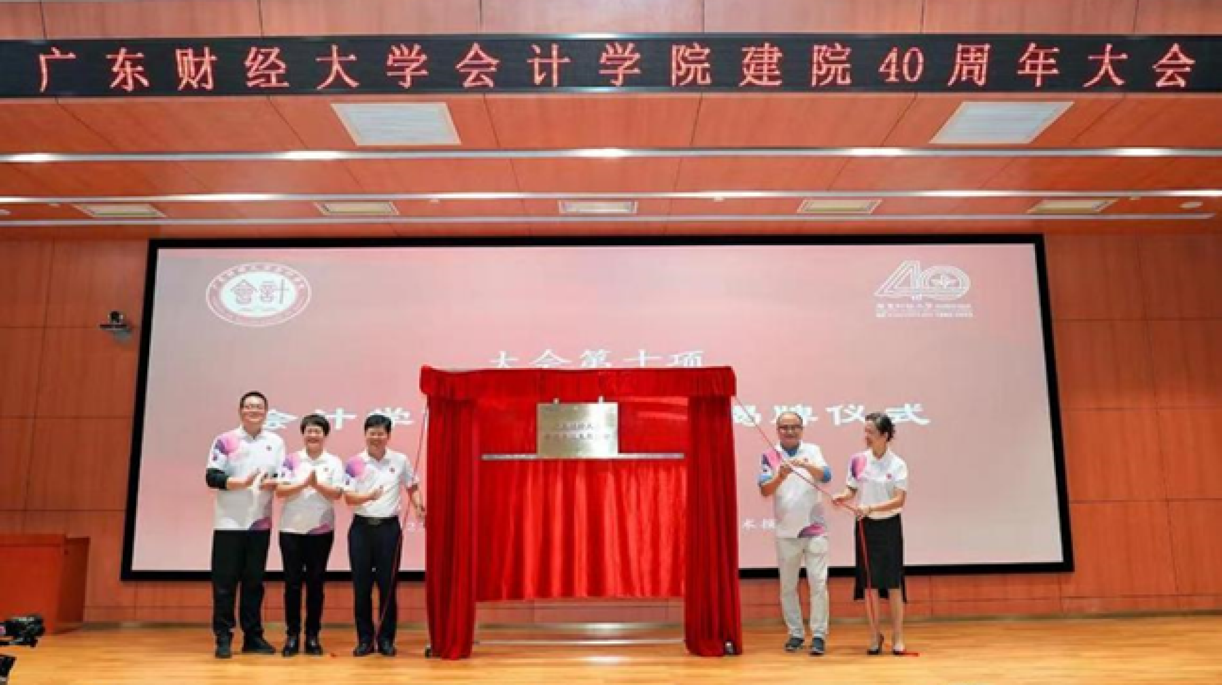 大会举行会计学院发展基金成立仪式。罗贤甲 ,学校校友总会办公室主任段丹, 彭翠峰、院长雷宇, 赖化冰为会计学院发展基金揭牌。