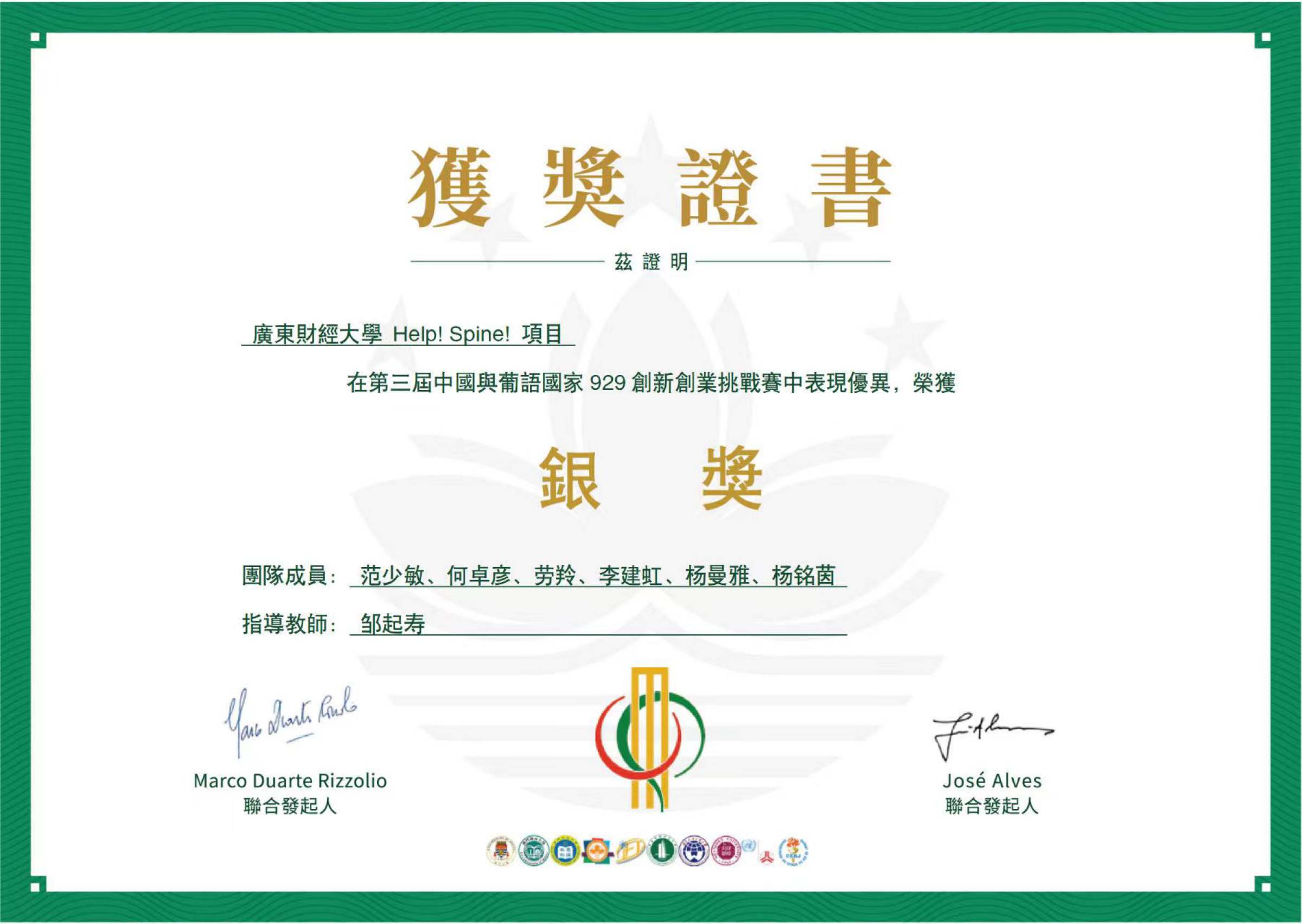 近日,我校工商管理学院/粤商学院/创新创业学院21级市场营销专业劳羚同学带领的“颜于律脊”团队,在“第三届中国与葡语国家929挑战赛”中勇夺银奖,该项目指导教师为学院市场营销系邹起寿老师。