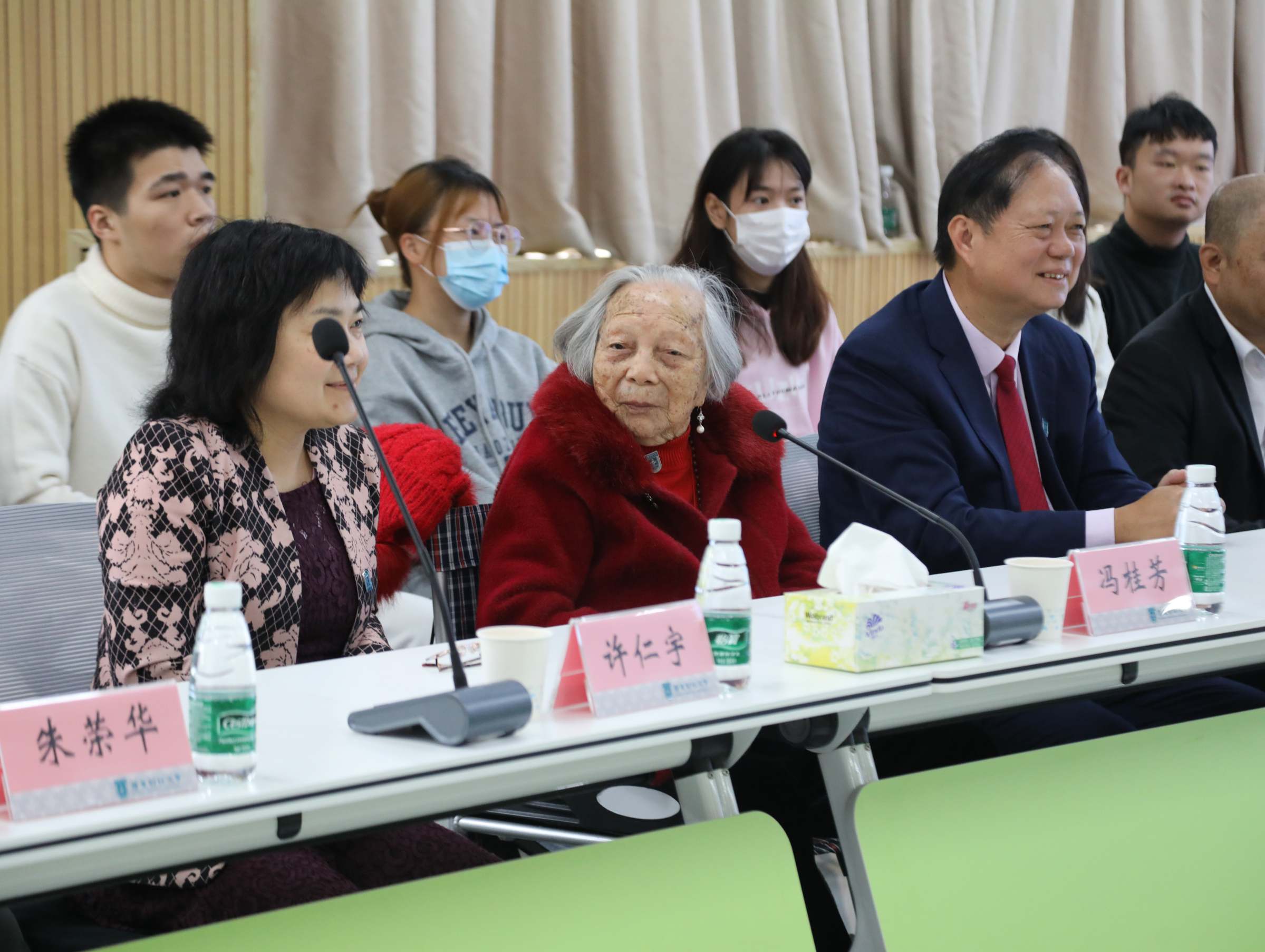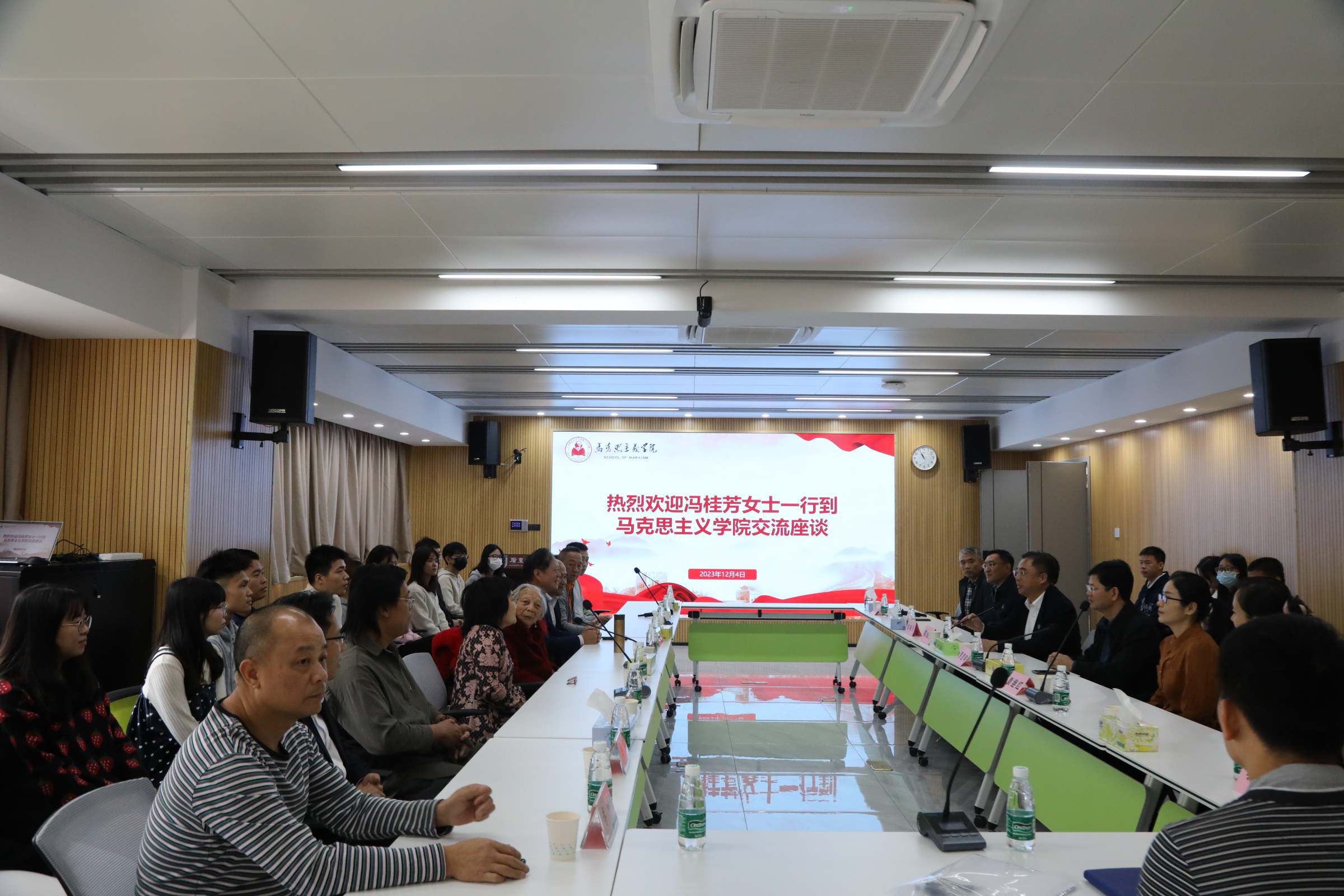 在智慧思政共创中心,梁仲景先生、冯桂芳女士与马克思主义学院师生代表座谈。座谈会上,梁仲景先生讲诉了母亲含辛茹苦育子读书,默默无闻救人助人的行为对自己的影响,鼓励同学们要珍惜学习时光,不仅读课本有字之书,还要读懂无字之书,更要理解读书的归宿——从小爱到大爱,从自我到无我,从个人到社会。老母亲九十八年的人生故事,堪称一堂鲜活生动的思政课。