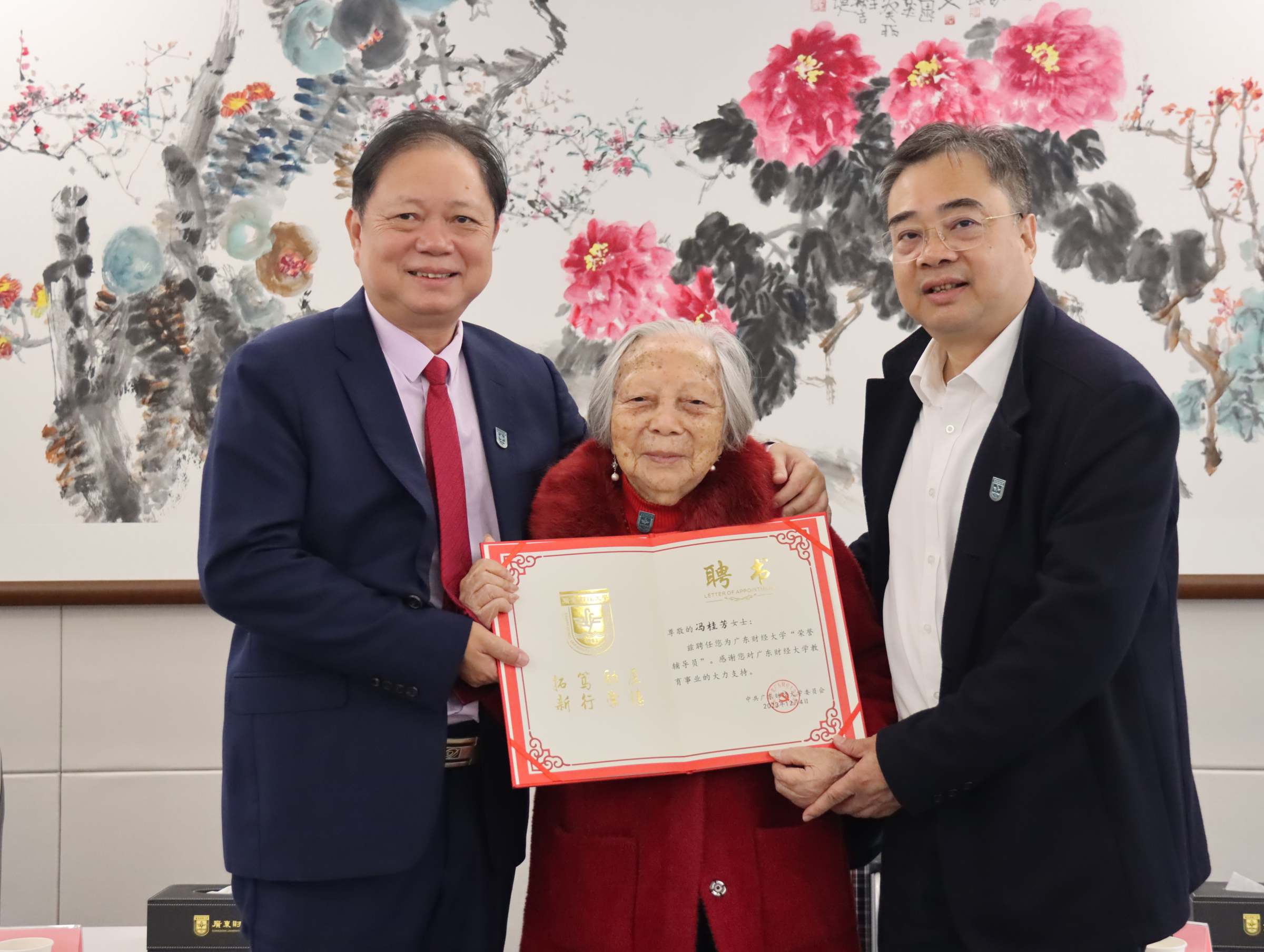 会后,郑贤操书记代表学校党委聘请了冯桂芳女士为学校“荣誉辅导员”,校学生会主席团成员陈依柠同学代表师生向冯桂芳女士献上围巾和鲜花。