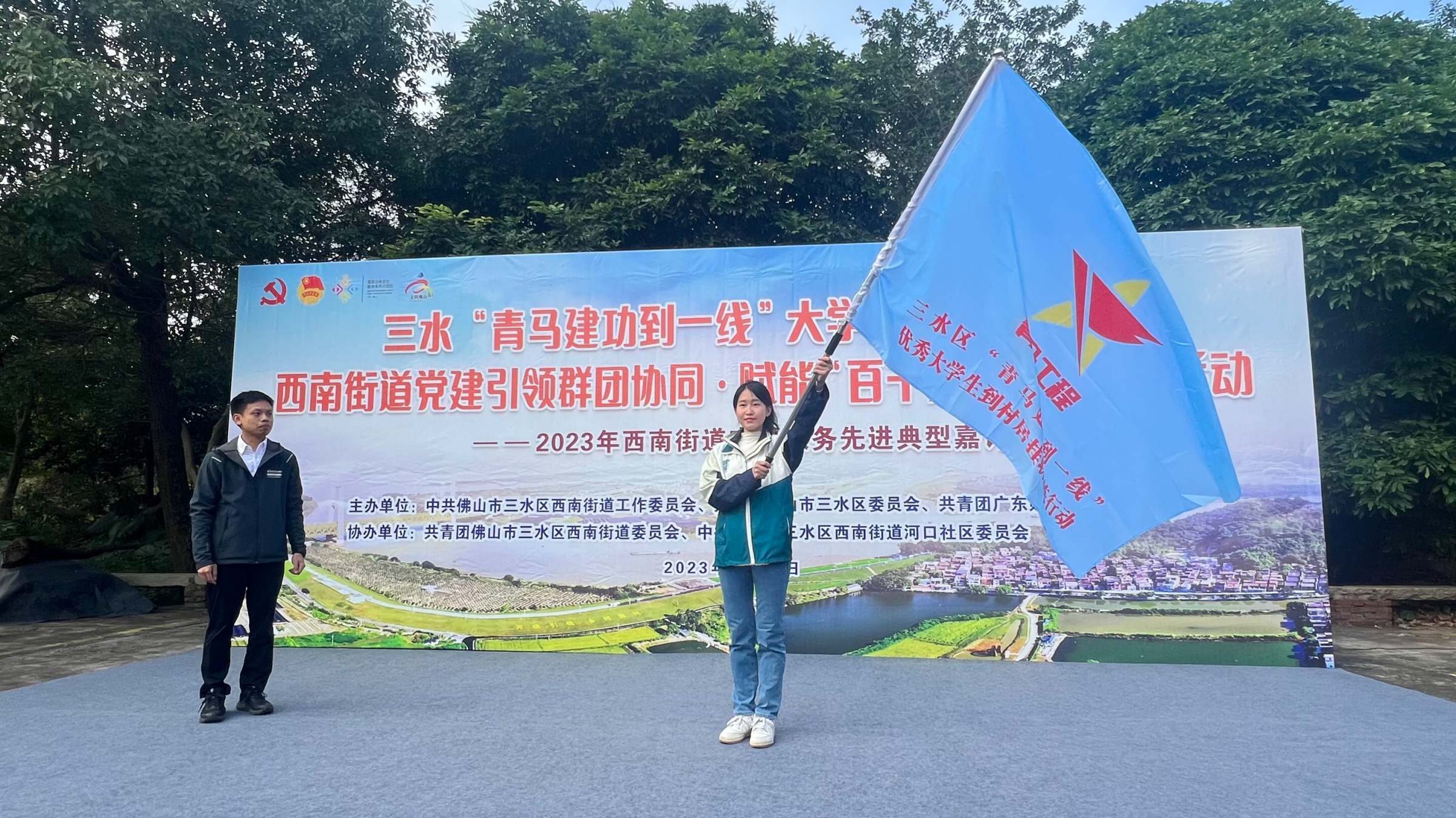 活动现场,共青团三水区委副书记徐绍星为我校获2023年上半年“青马建功到一线”的9名优秀学员颁奖。我校校团委副书记吴宏豪向“青马”学员代表授项目旗。授旗仪式标志着2023年下半年-2024年上半年“青马建功到一线”优秀大学生到村居挂职锻炼行动正式启动,100余名青马学员将奔赴西南和云东海21个村居单位开展常态化结对服务。