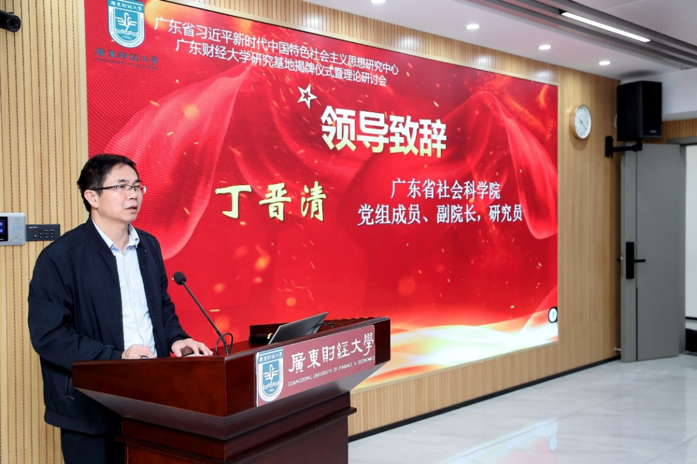 丁晋清致辞,他首先对广东财经大学研究基地的成立表示衷心祝贺。他强调,研究好、宣传好、阐释好习近平新时代中国特色社会主义思想,是宣传战线和哲学社会科学界义不容辞的责任和使命。他对研究基地的建设提出了“三高三力”的要求,要坚持高起点谋划、高标准要求、高质量建设,不断提高研究基地的社会影响力、学术影响力和决策影响力。努力将研究基地打造成研究习近平新时代中国特色社会主义思想的全省高水平基地,建设成高校主流意识形态工作的坚强阵地和思想政治教育的重要平台。
