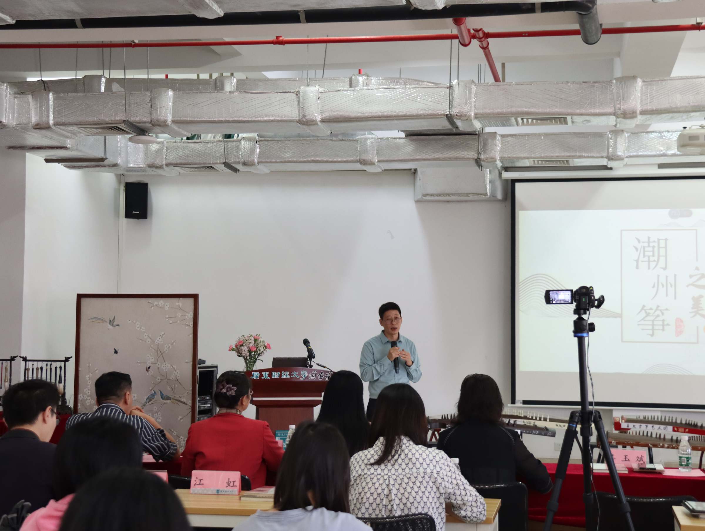 随后,辜玉斌给大家作了题为《潮州筝之美》的讲座,向大家介绍了潮州筝的由来及其地位,并从潮州筝的器之美、谱之美、律之美、儒之美、调之美入手,讲演结合,全方位地展示了潮州的筝之美。期间,辜先生还用百年潮州筝为大家演绎了潮州名曲《出水莲》和《柳青娘》。或悠扬清丽,或哀怨缠绵,辜先生深情投入、娴熟高超的演奏把现场气氛带入了高潮。