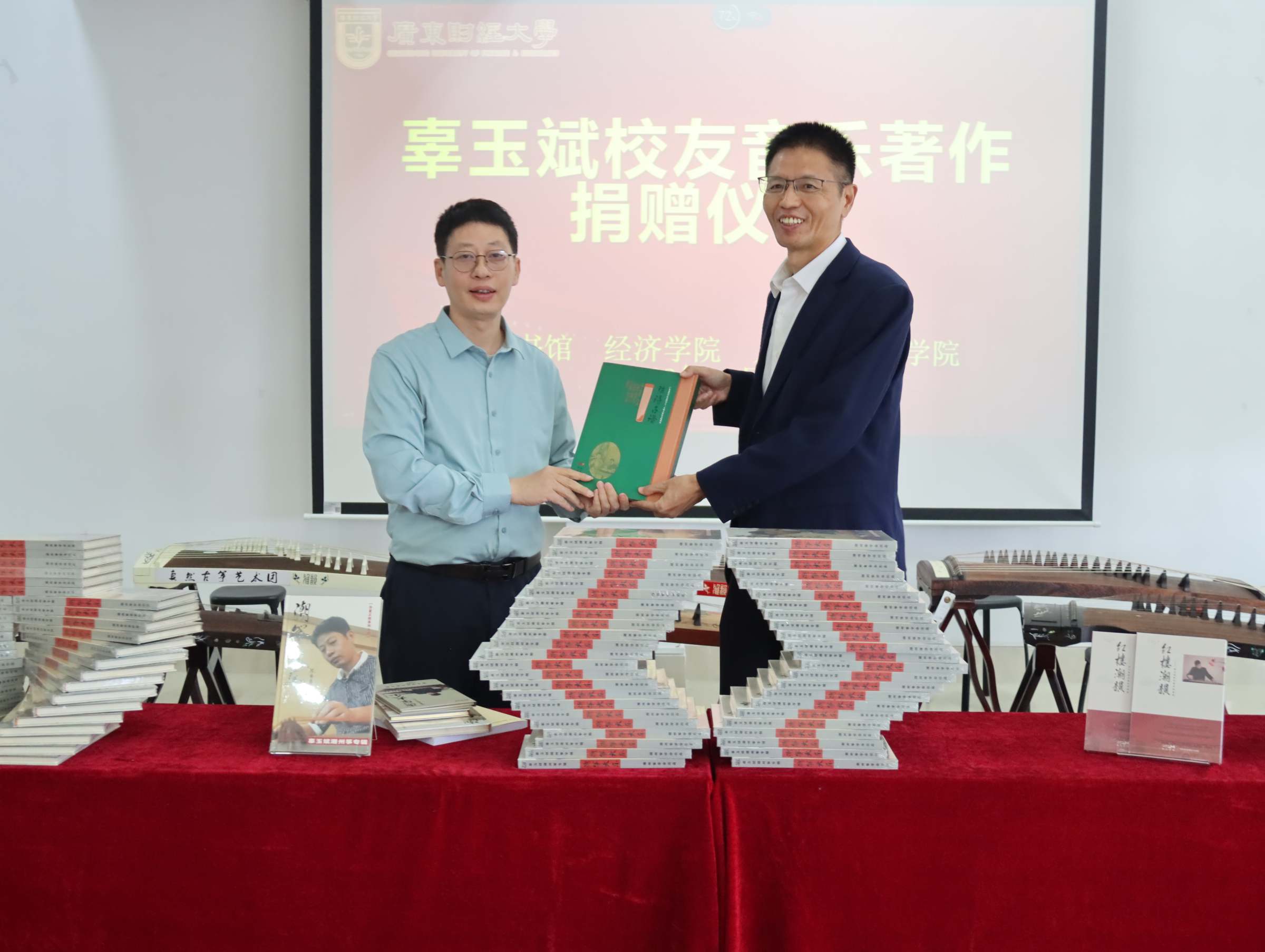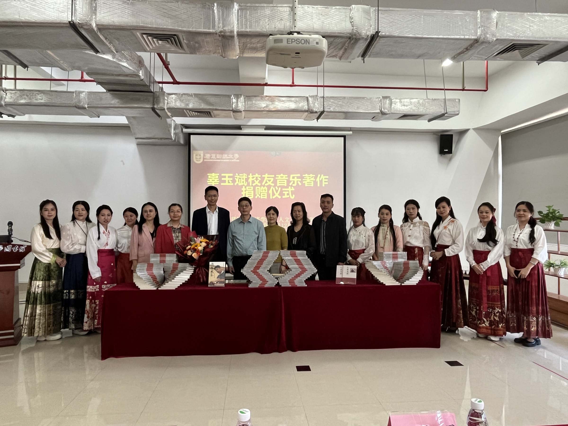 捐赠仪式由王忠政主持。辜玉斌将其已出版发行的音乐著作、原创潮筝曲集《潮筝大乐》和《红楼潮韵》以及长达14米的珍藏乐谱捐赠给母校图书馆。王忠政代表学校接收,并向其颁发捐赠证书。王忠政代表母校肯定了辜先生取得的成绩,并指出辜先生是爱好和专业结合的模范,值得大家学习。