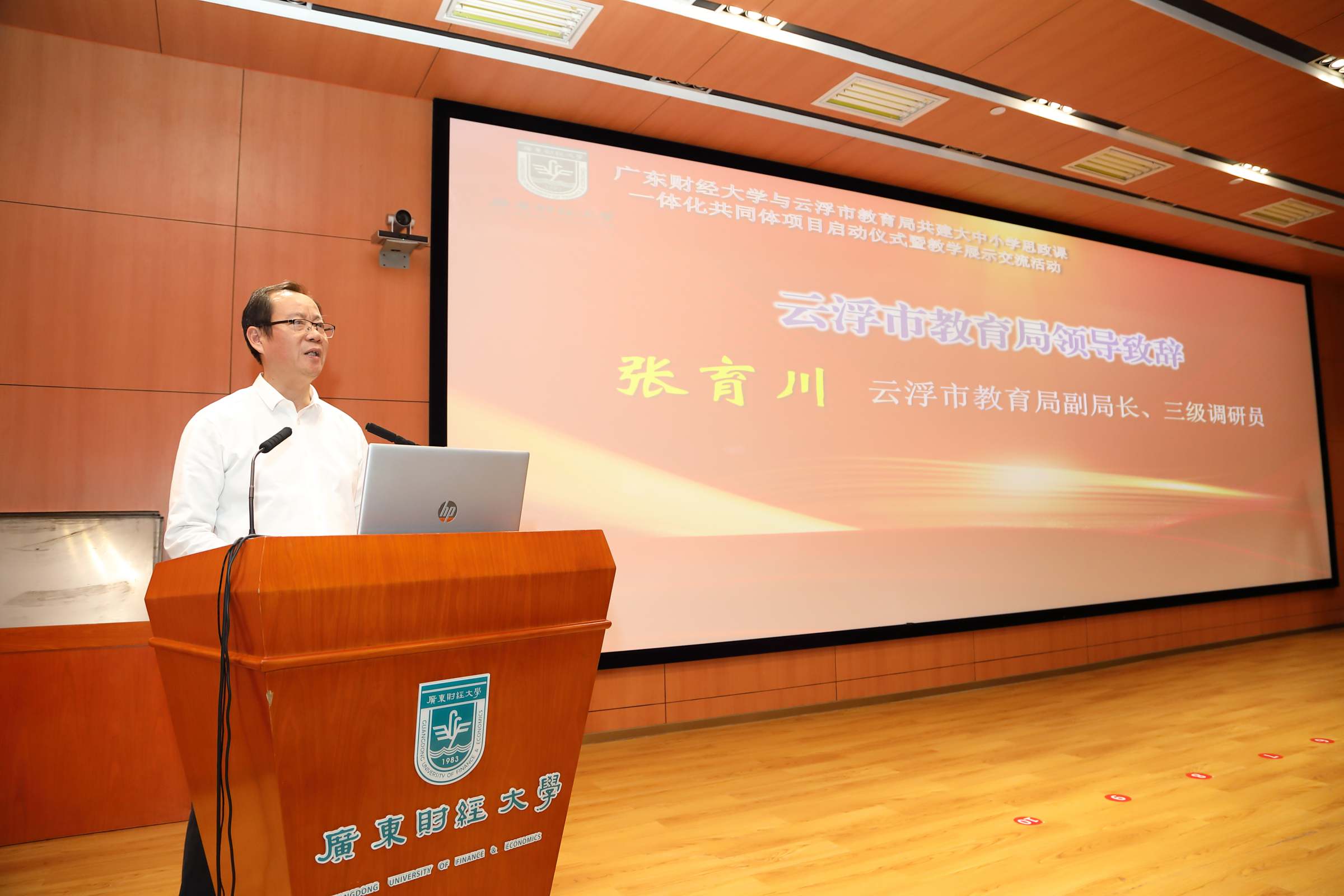 张育川代表云浮市教育局祝贺广东财经大学与云浮市教育局共建大中小学思政课一体化共同体项目成功结对,并感谢广东财经大学对云浮市思政课建设的大力支持。他对校地双方共建大中小学思政课一体化共同体项目提出三点建议:一是凝聚共识,把准大中小学思政课一体化建设战略要求;二是锚定目标,明确大中小学思政课一体化建设目标任务,既要提高政治站位,明确思政课落实立德树人根本任务、培养时代新人的战略目标,又要设定大中小学思政课建设的阶段性目标;三是校地合作,打造大中小学思政课一体化建设示范项目,双方在教学教研、资源共享、师资培训、项目研究等方面形成良性互动机制,实现不同学段思政课有效衔接,整体推进,螺旋上升,增强育人成效。加快我们形成具有云浮特色、省级影响的工作机制、品牌活动、示范“金课”、优秀师资队伍等成效。