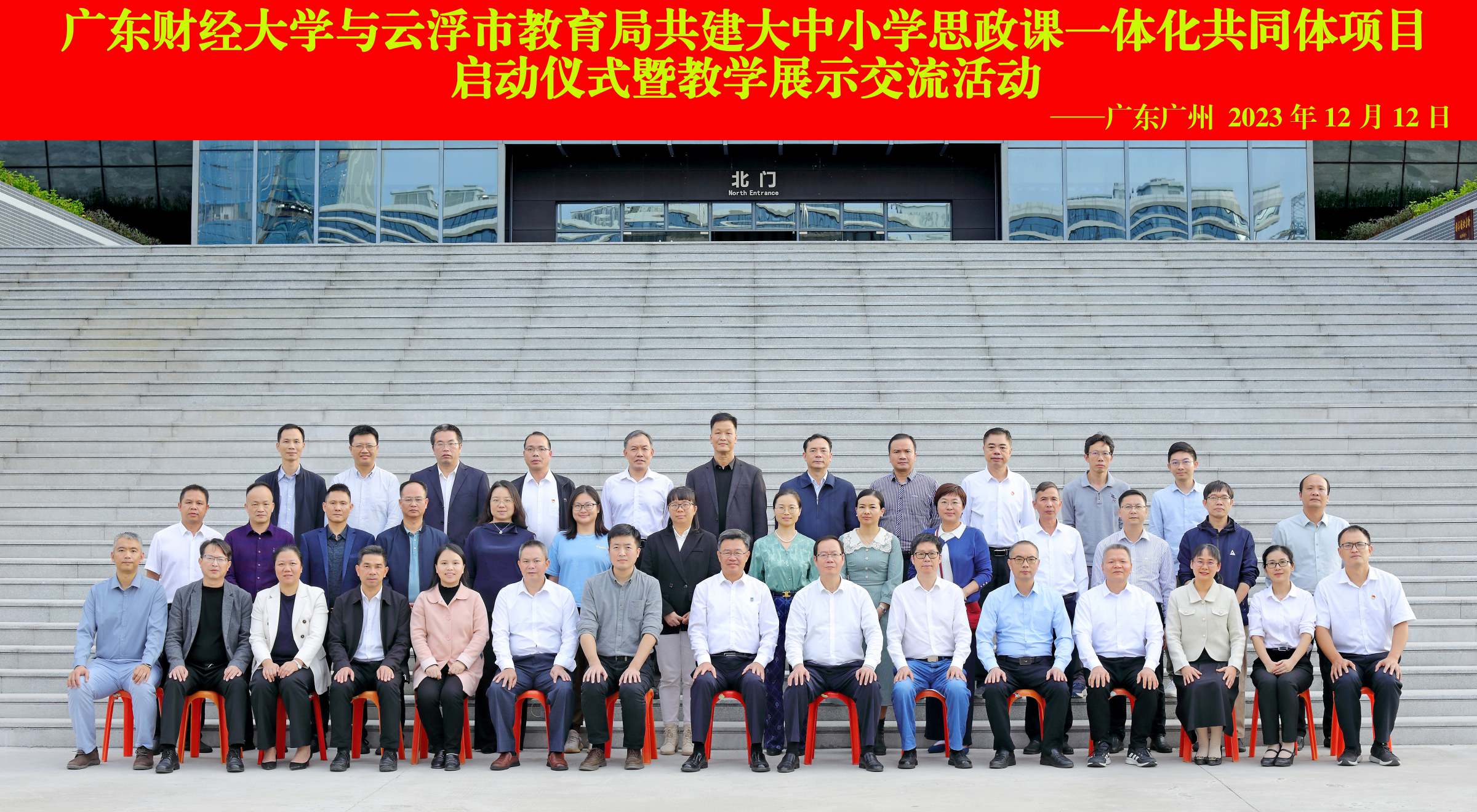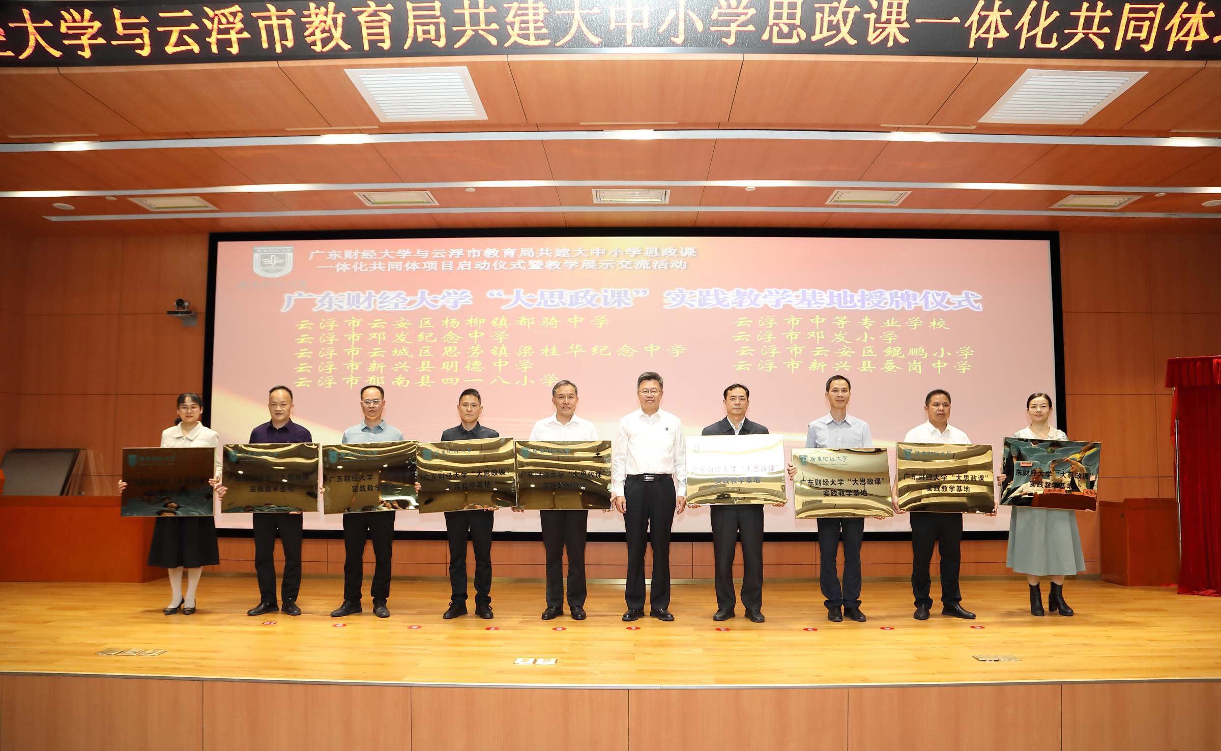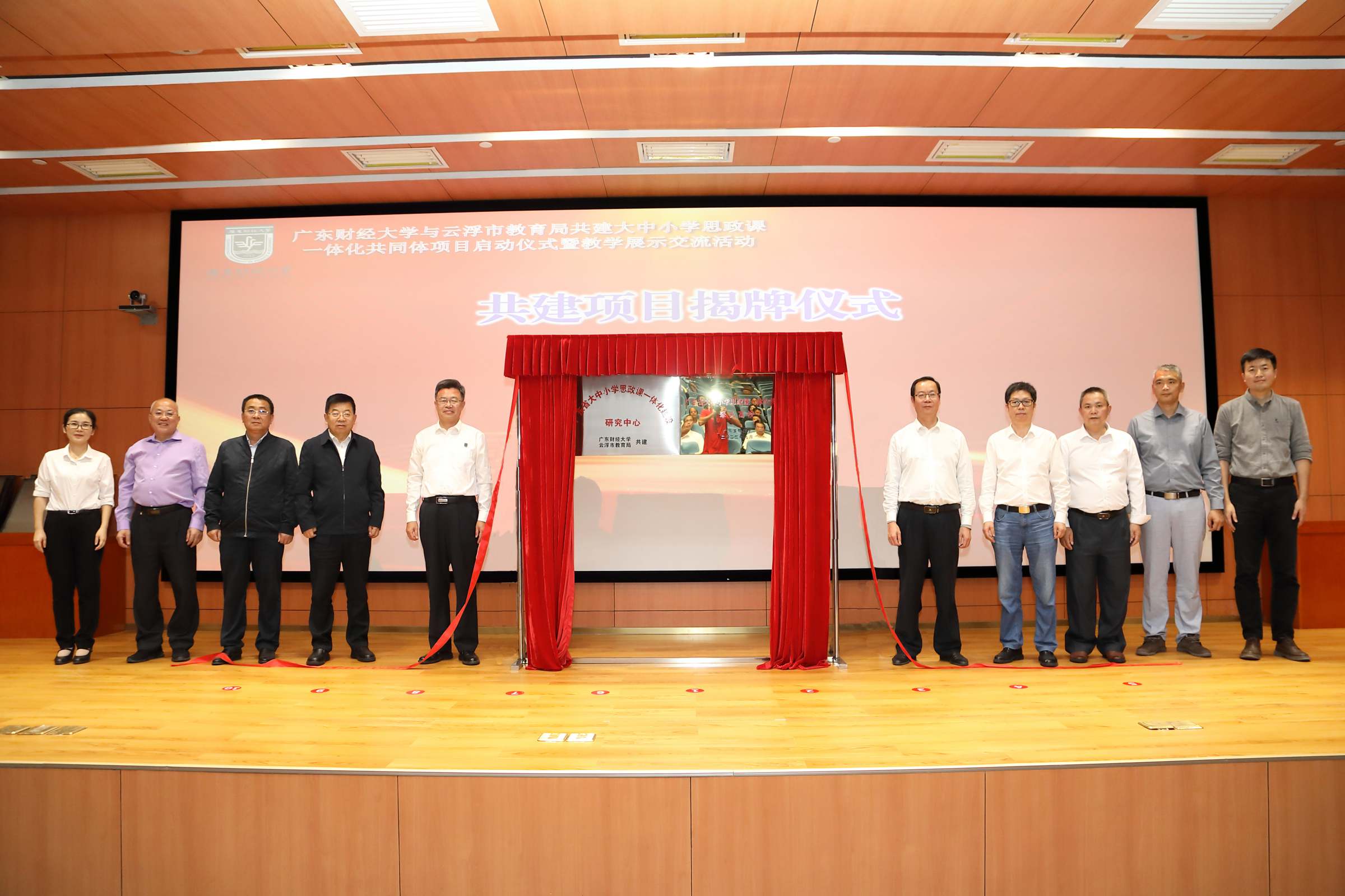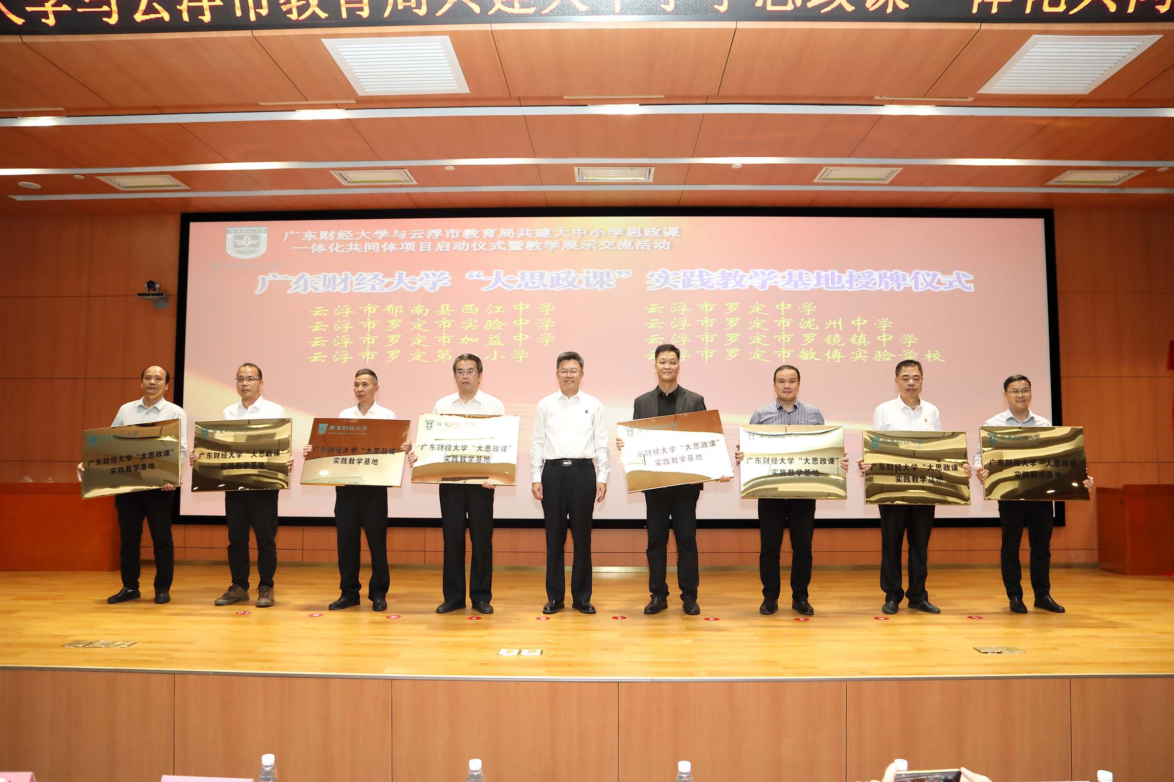 随后,陈国栋,张育川,兰州大学刘先春教授,校党委宣传部、统战部部长陈光团 ,教务处处长张军、社会合作处处长黎友焕处长、校团委书记张鹏程、马克思主义学院党委书记张小洁、 袁继红等一起为广东财经大学与云浮市教育局共建大中小学思政课一体化共同体项目启动揭牌。