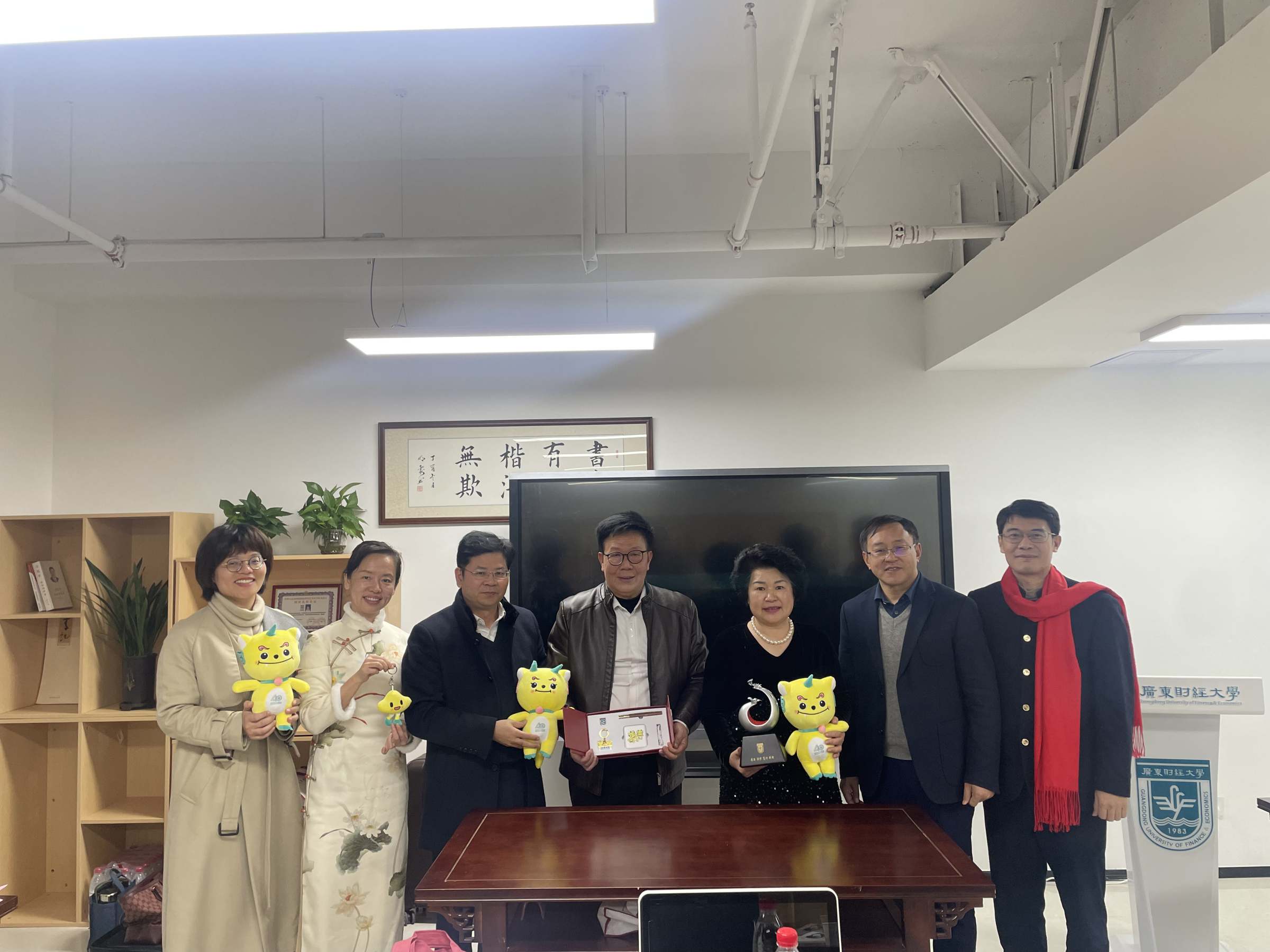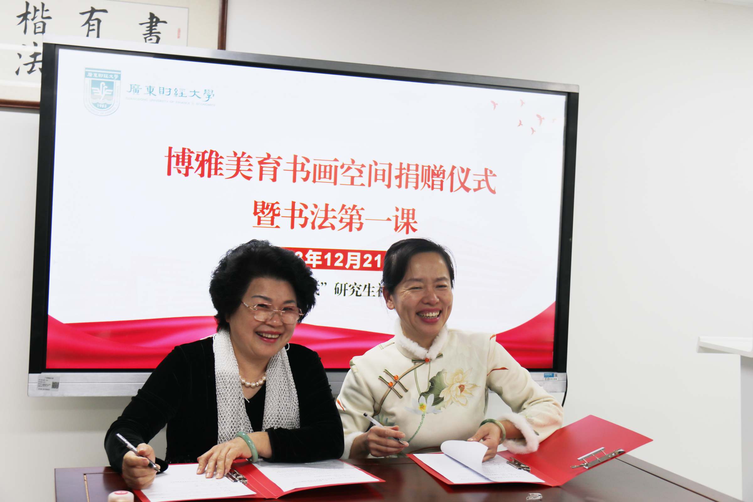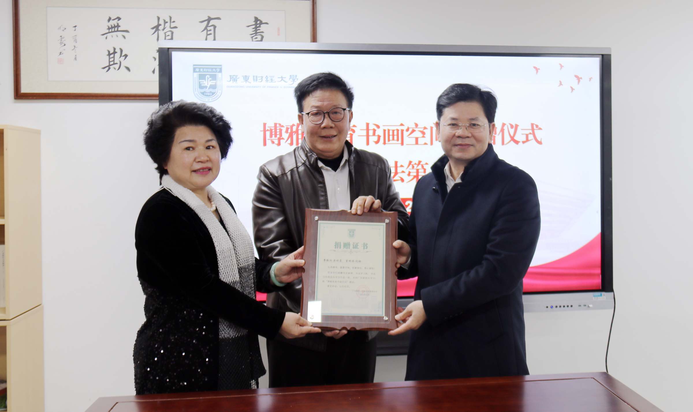 仪式上,广东财经大学教育发展基金会秘书长段丹与梁明霞伉俪签订捐赠协议,并由罗贤甲向梁明霞伉俪颁发捐赠证书和纪念品。“博雅美育书画空间”在与会人员的见证下正式揭牌。