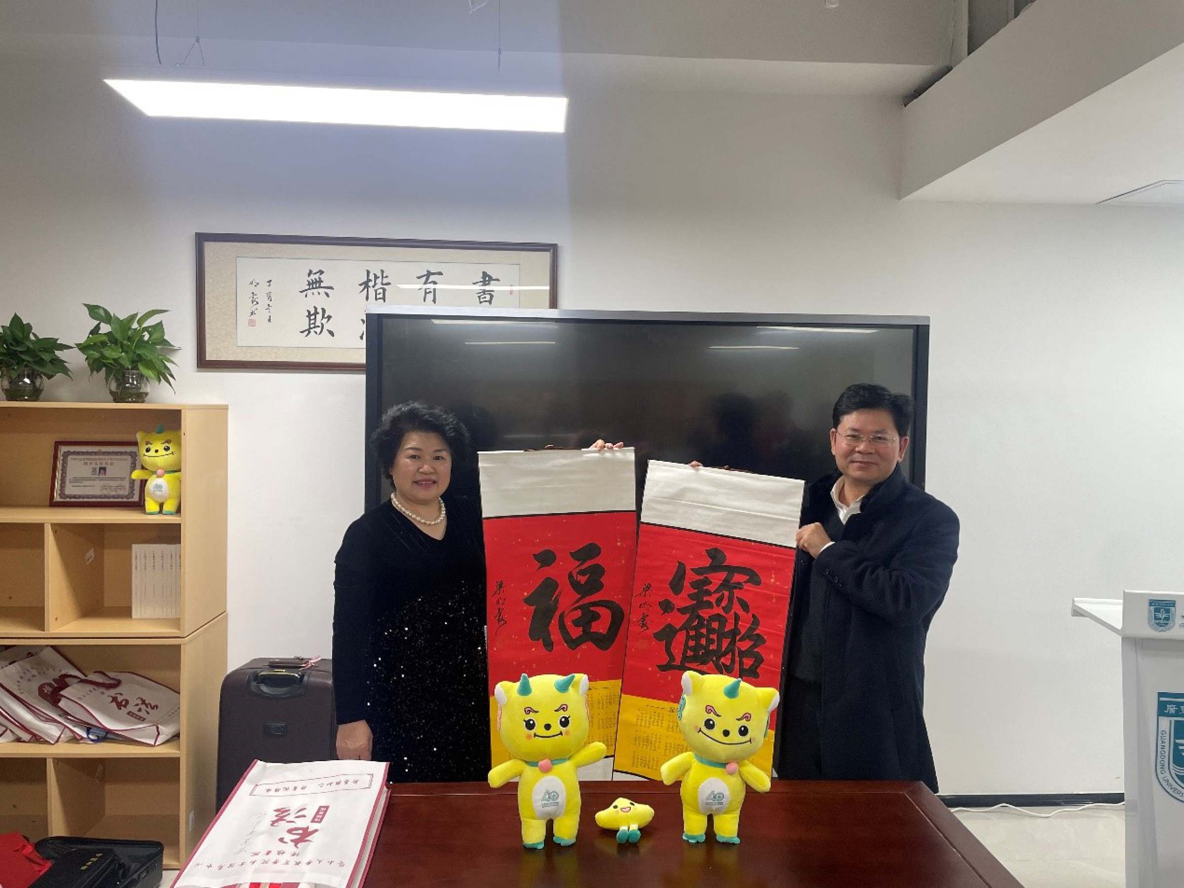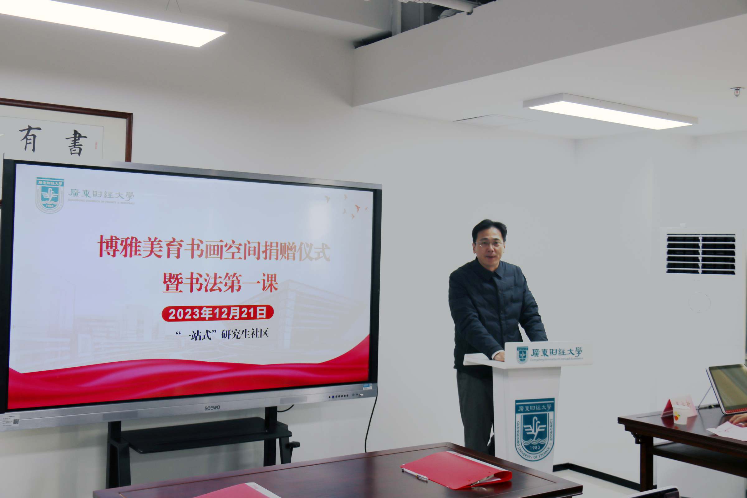 张凯在致辞中首先对梁明霞女士一行社会贤达和校友对博雅美育书画空间设施设备的捐赠表示衷心的感谢。经罗定和宋军牵线搭桥,梁明霞女士、曾明添先生伉俪向学校捐赠一间博雅美育书画空间设施设备(含18套红木书法桌椅、18套书法学习机与教学视频及36套笔墨纸帖)。他指出,在建校40周年之际,博雅美育书画空间的设立,是学校精心打造“一站式”研究生社区综合服务中心,推动全员全过程全方位“三全育人”,推进“美育”进社区做出的重要举措。对此他提出了三点希望:一是珍惜享用,力求学有所获;二是打造社区美育品牌,提升美育质量和成效;三是深植感恩情怀,爱校荣校、笃志前行,为粤港澳大湾区一流财经大学建设贡献力量和智慧。