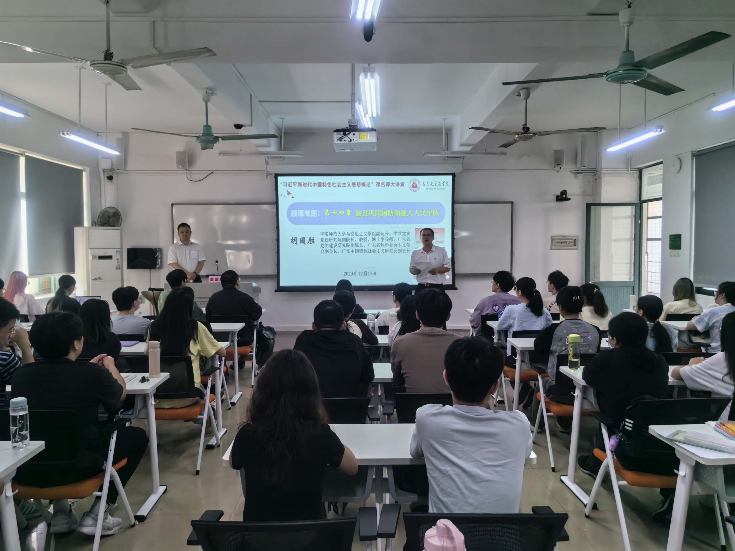 12月15日下午,《习近平新时代中国特色社会主义思想概论》课名师大讲堂邀请到华南师范大学马克思主义学院副院长、中共党史党建研究院副院长胡国胜教授专题讲授第十四章“建设巩固国防和强大人民军队”,其他同时段上课的两校区同学以现场直播的方式参与学习。马克思主义学院副院长孙晓晖教授主持,党委书记张小洁及带班老师参加。