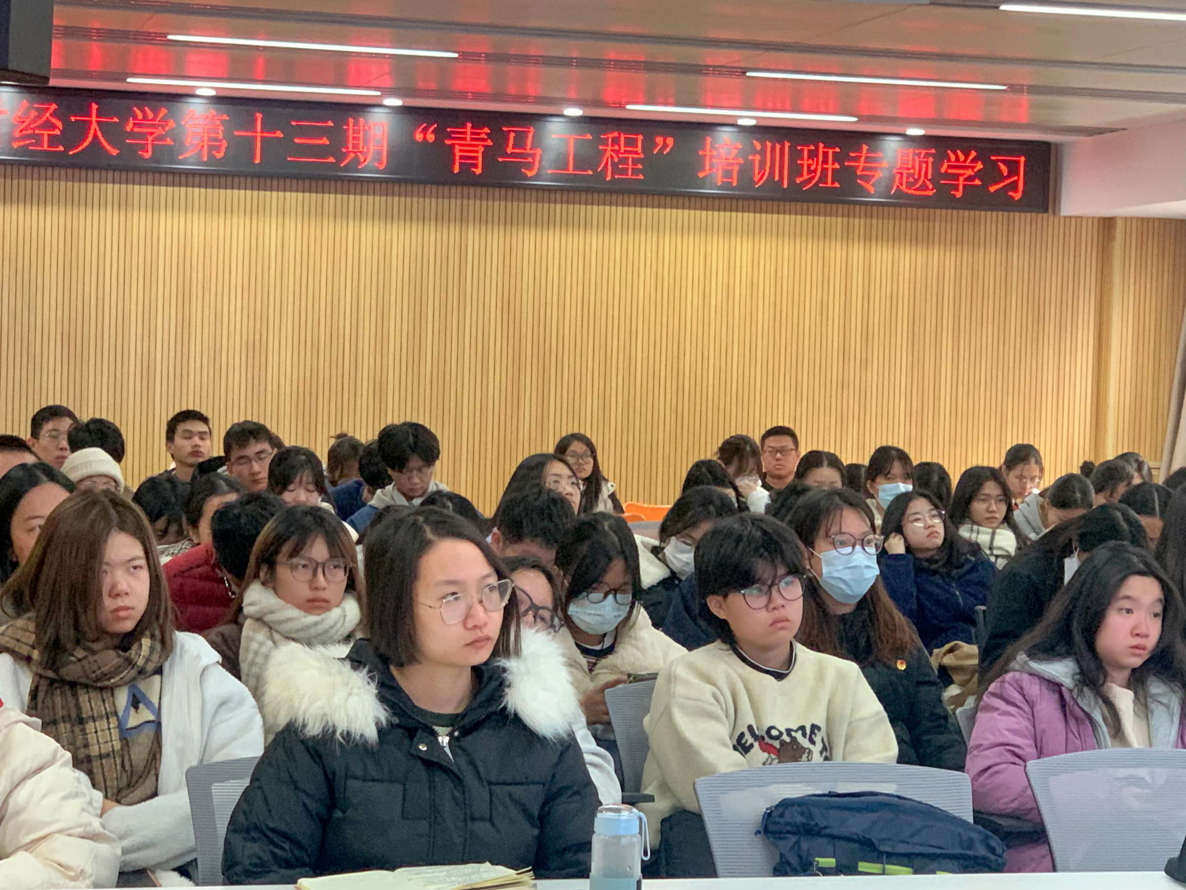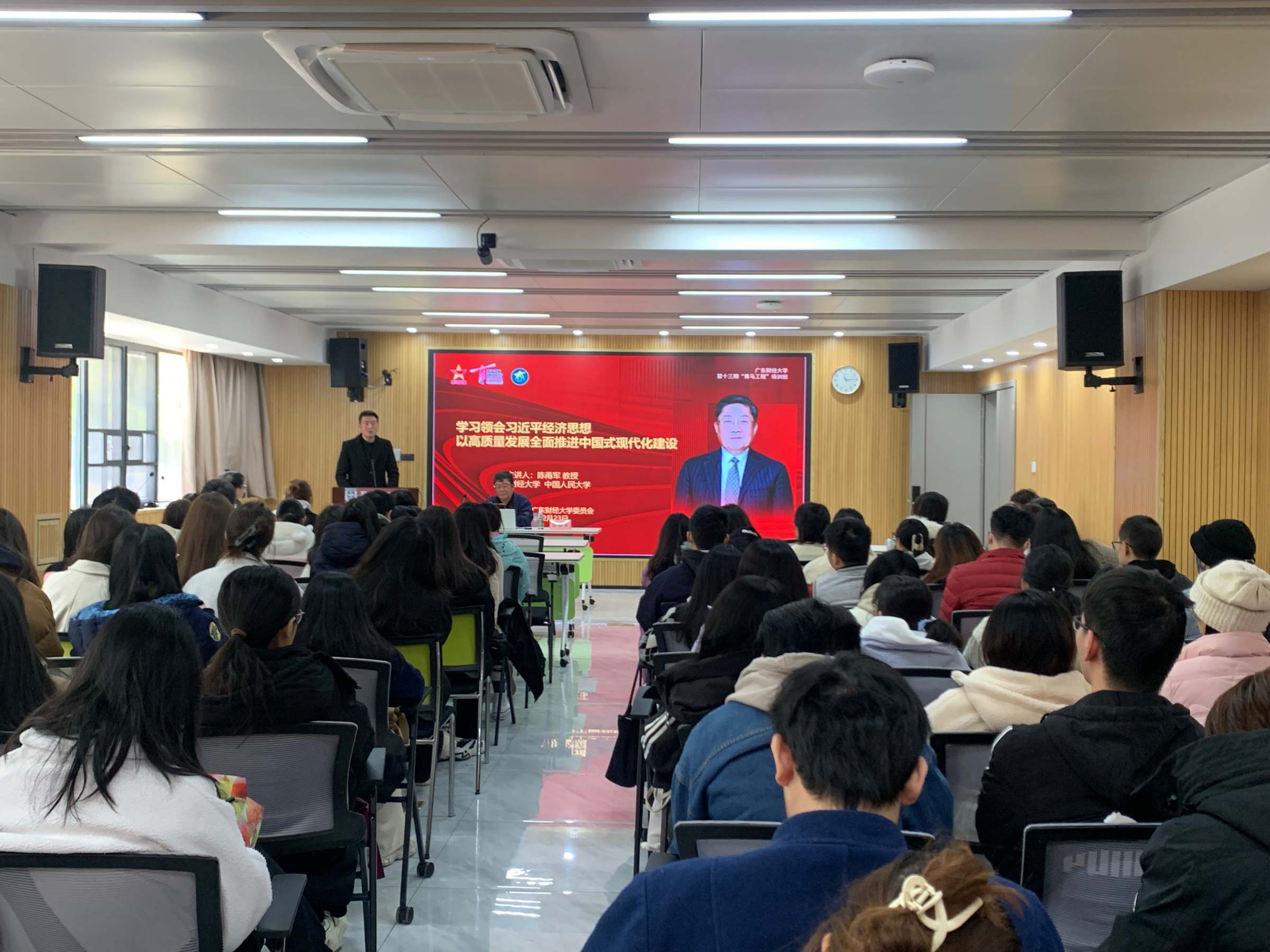 12月23日上午,校第十三期“青马工程”培训班开讲第二课,邀请我校特聘教授、大湾区双循环发展研究院院长陈甬军教授作《学习领会习近平经济思想,以高质量发展全面推进中国式现代化建设》的专题辅导。陈甬军从习近平经济思想的根本保证、根本立场、“三新一高”(新发展阶段、新发展理念、新发展格局、高质量发展)、重要抓手、重要保障和策略方法等六个方面的基本内容进行了详细阐述,并结合中国共产党确立和推进中国式现代化的理论与实践、中国式现代化进程中的高质量发展、促进粤港澳大湾区成为新发展格局的战略支点、《习近平谈“一带一路”》战略创新特点与理论基点等4个案例对习近平经济思想的内涵、特点和中国式现代化实现路径进行了深入分析,鼓励同学们练就过硬本领,在中国式现代化的广东实践新征程中大胆探索、勇于创新,展现广财担当、广财作为。