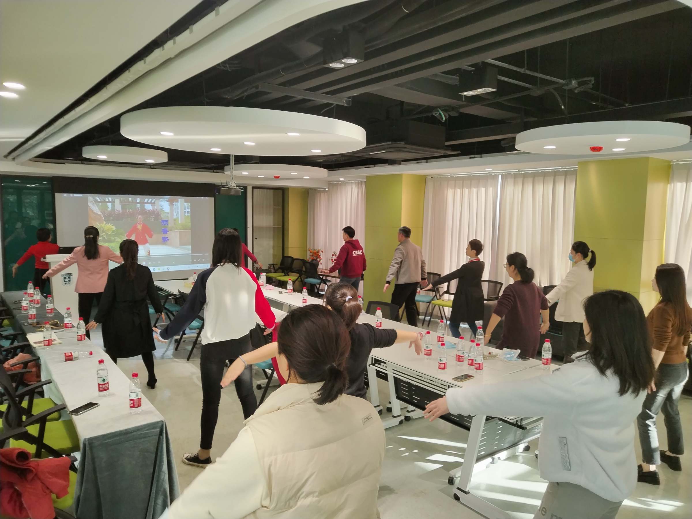 广州中医药大学附属第一院副主任医师、工会专职副主席姚丽芬作“养生功法习练”主题分享和辅导。她首先从邓铁涛、施明德两位百岁大师坚持习练养生功法的实例入手,阐释了养生功法习练对促进健康的重大作用;接着介绍了八段锦、五禽戏、易筋经、六字诀、意拳养生桩等多种养生功法并结合自身多年行医和推广经验,重点讲解了八段锦。她指出,八段锦因简单易学、易于坚持、习练效果好而广受欢迎,正确习练八段锦是个人主动干预自我保健的好方法;姚丽芬现场示范指导参加活动的机关干部习练八段锦和意拳养生桩。