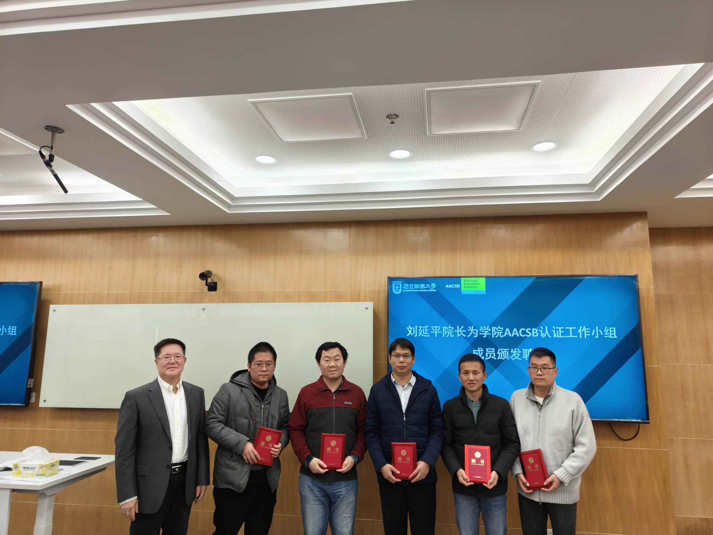 刘延平表示,学院将共同努力,齐心协力,高效推动AACSB认证工作。他提出两点要求:思想要统一,全员要参与;分工要明确,行动要迅速,按照路线图、时间表责任到人,深入落实各项工作。最后,刘延平为学院AACSB工作小组成员代表颁发聘书。