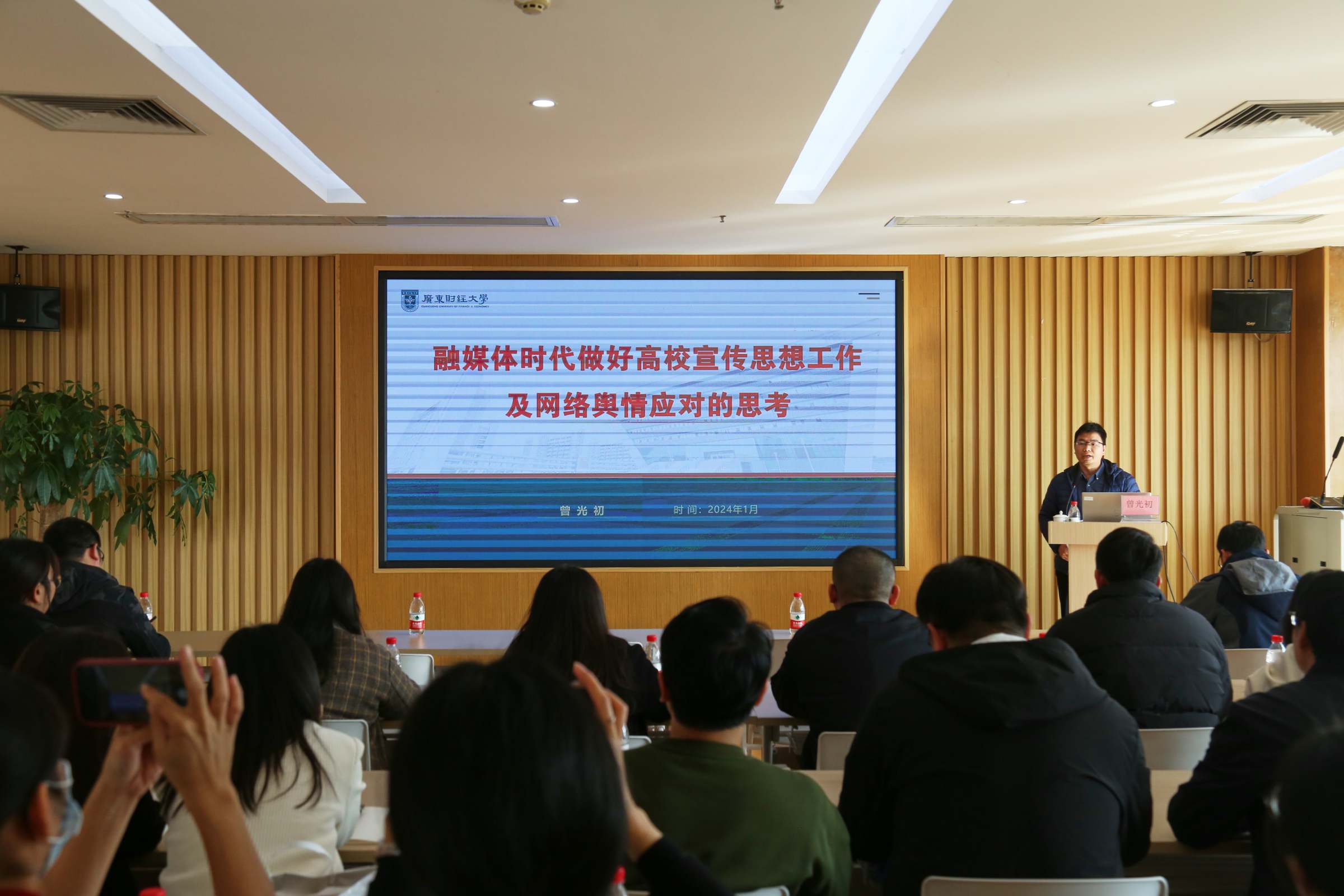 在经验分享会上,我校党委宣传部理论与思政科科长曾光初结合理论和具体案例,从习近平文化思想是做好融媒体时代高校宣传思想文化工作的指南、融媒体时代宣传思想工作面临的挑战、融媒体时代的高校舆情应对与引导三方面作经验分享,为参会人员如何处置学校突发事件,防范化解舆情危机,做好舆情应对与引导提供了宝贵的经验借鉴。