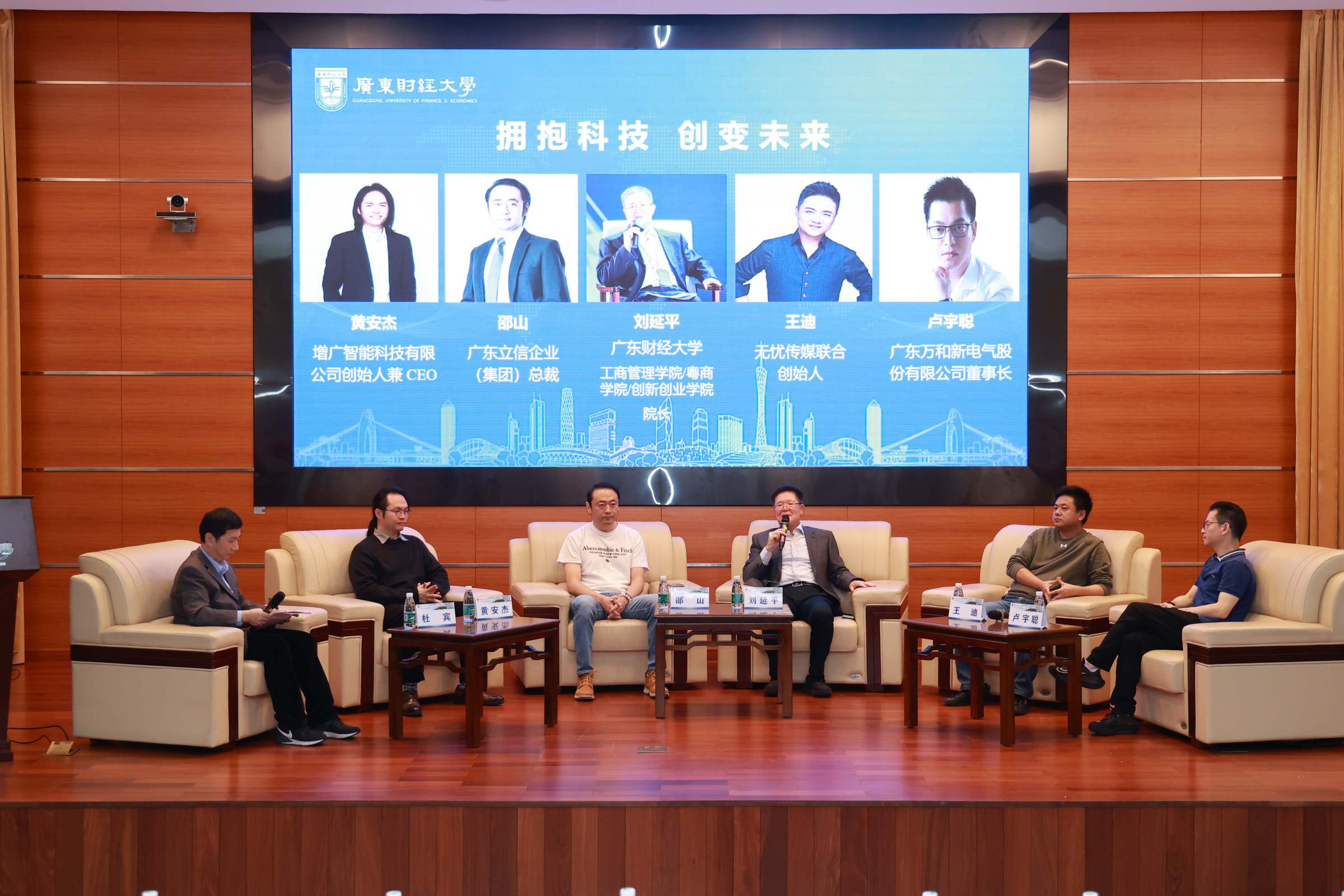 在圆桌对话环节,刘延平与四位青年企业家围绕“拥抱科技 创变未来”这一主题,共同探讨了科技创新的前沿趋势、产业融合发展、科技人才培养等问题。现场气氛热烈、互动频繁,学生们积极提问,与嘉宾们展开深入交流与热烈讨论。