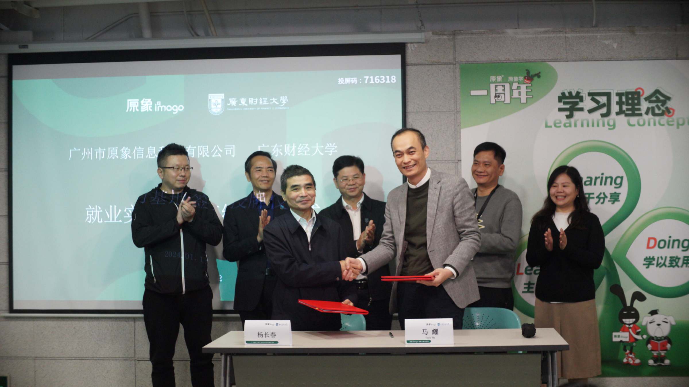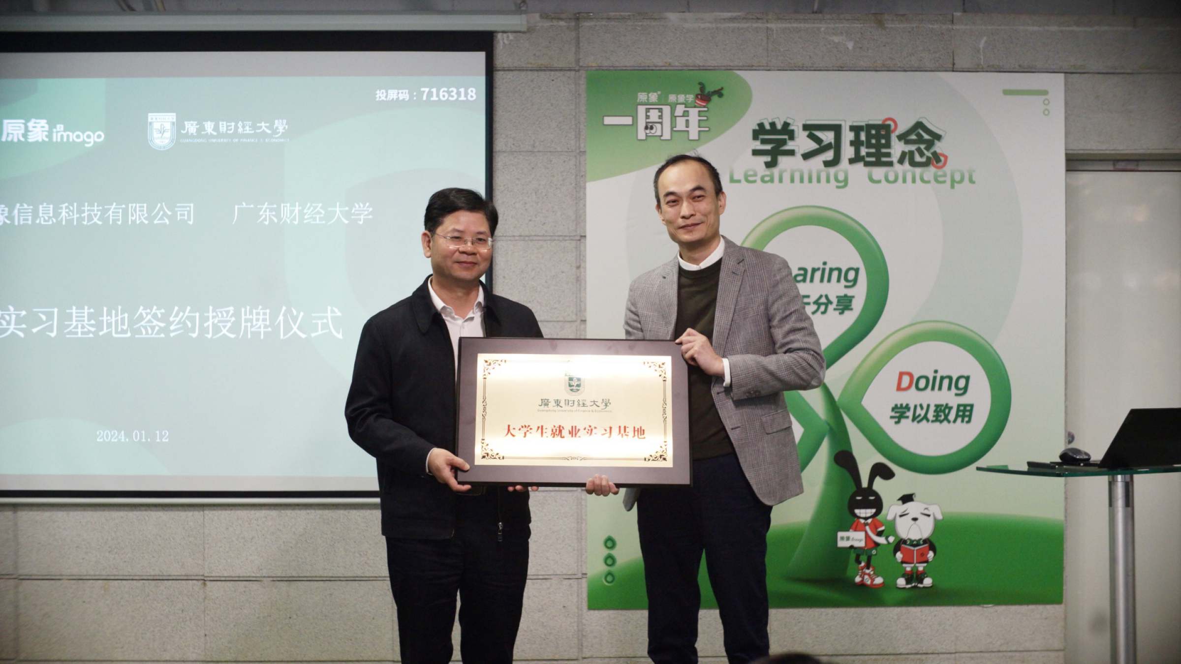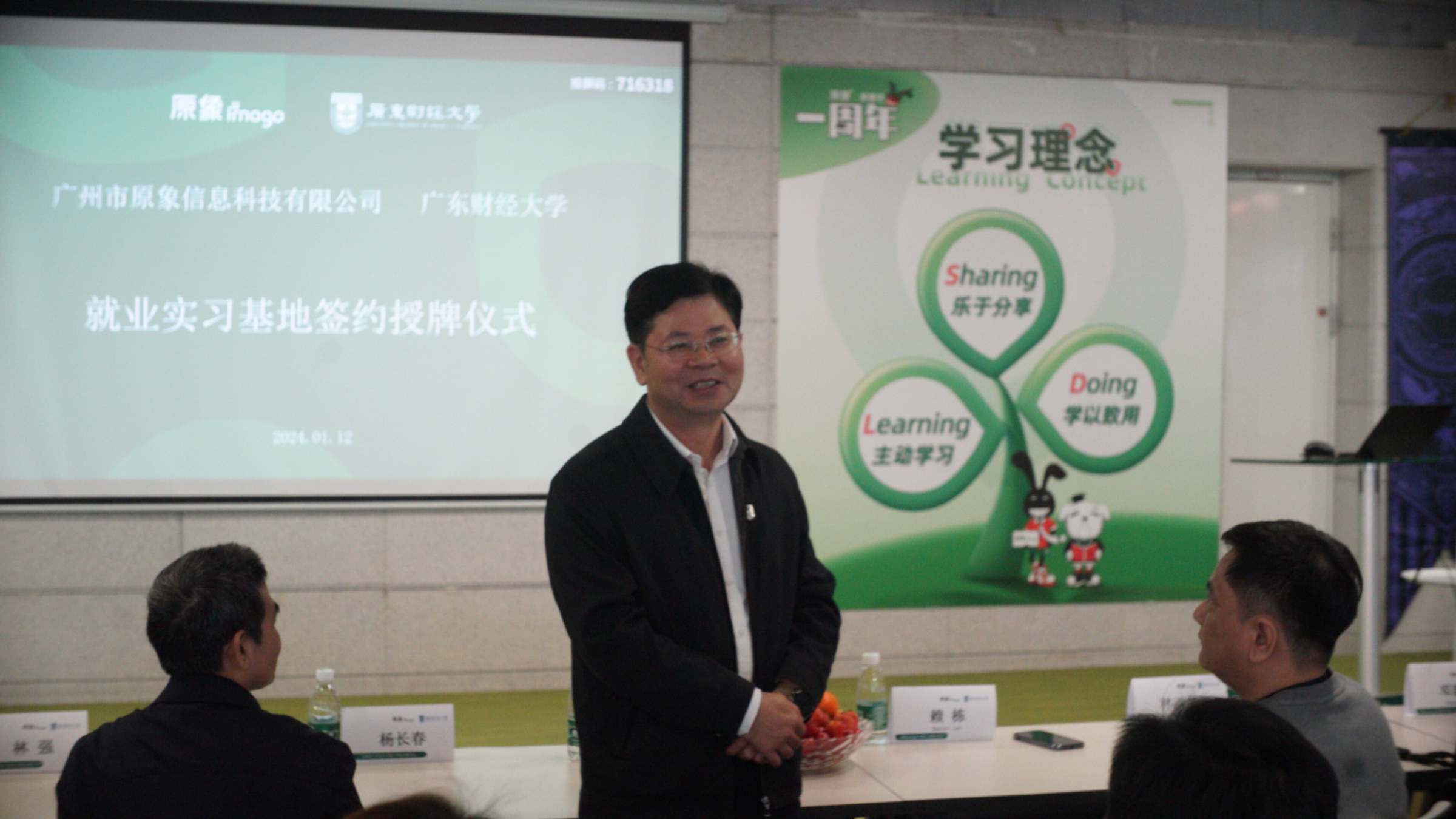 校企双方进行广东财经大学就业实习基地签约仪式。 杨长春和马耀分签订就业实习基地建设协议。罗贤甲为原象授予“广东财经大学大学生就业实习基地”牌匾。 林强为企业高管人力行政部总监邓素颜、创意部资深设计总监邓新利颁发校外实习导师聘书。