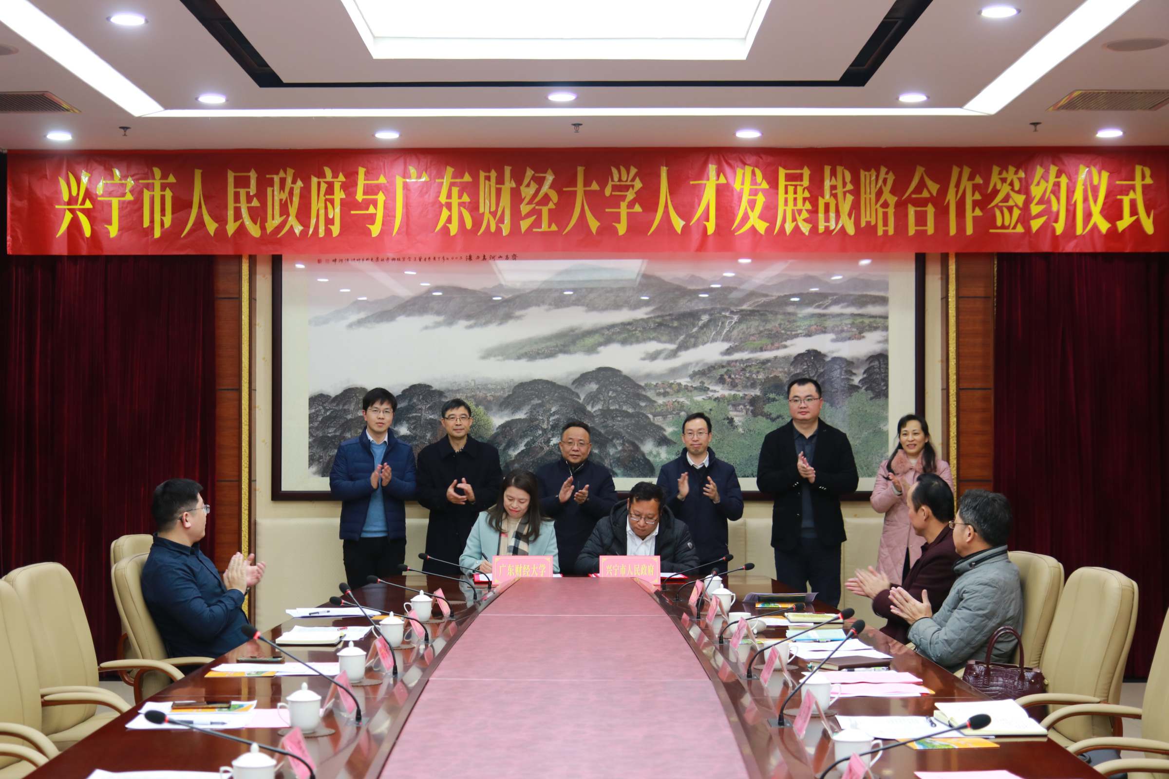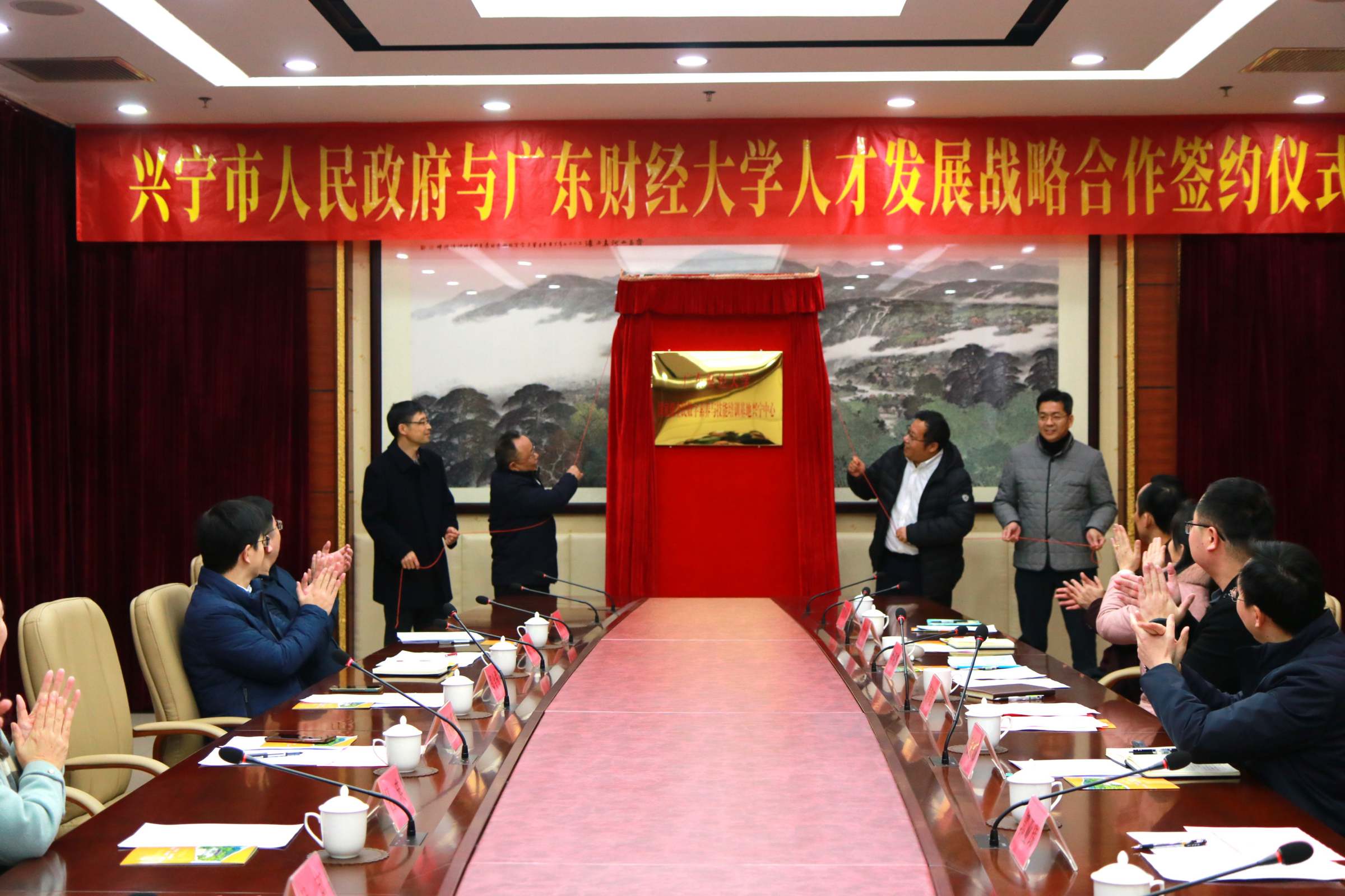 在领导嘉宾共同见证下,吕瑛与郭亚玮代表双方签订《兴宁市人民政府与广东财经大学人才发展战略合作框架协议》,于海峰、郑金栈、郭亚玮、郭远林等共同为广东财经大学国家级全民数字素养与技能培训基地兴宁中心揭牌。