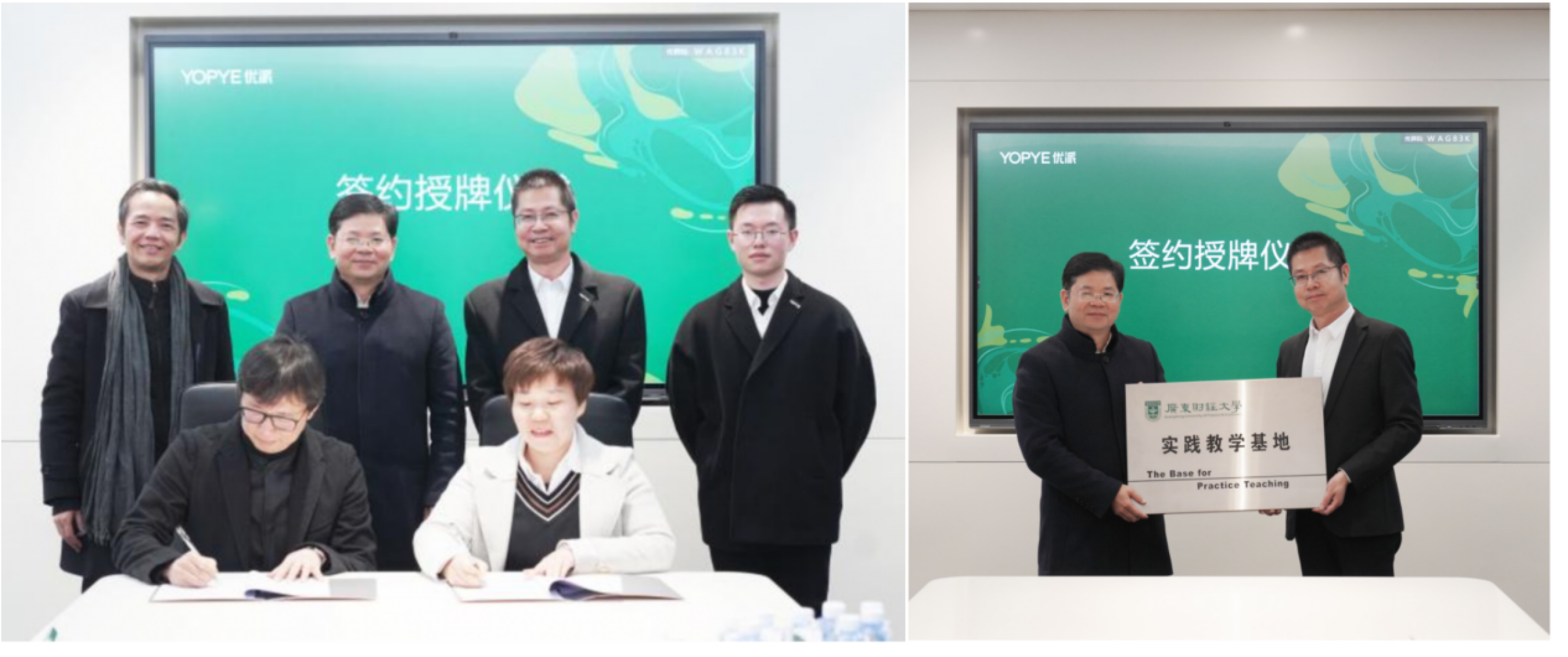 王少斌、刘峥嵘代表校企双方进行实践教学基地签约仪式,罗贤甲为企业代表肖晓明执行总裁授牌。