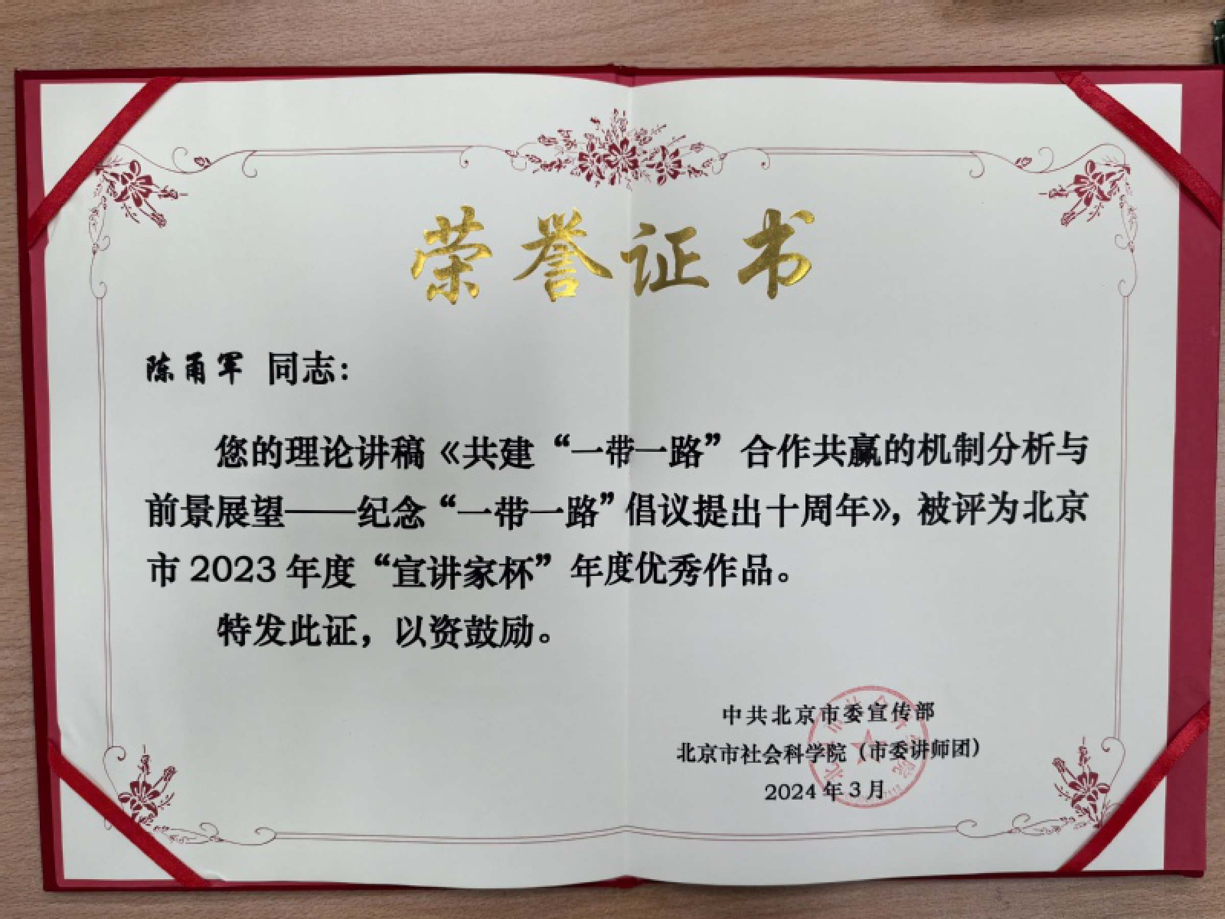 由北京市委宣传部等主办组织的2023年北京市“宣传家杯”优秀报告(党课)征集和表彰活动日前结束。由中国人民大学推荐、北京市教育工委报送的陈甬军教授的理论讲稿《共建“一带一路”合作共赢的机制分析与前景展望——纪念“一带一路”倡议提出十周年》,被评为2023年度北京市"宣讲家杯”年度优秀作品。