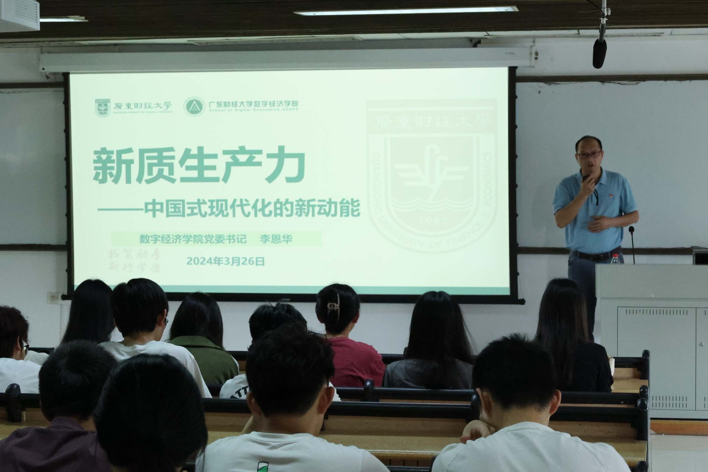 李恩华详细阐述了新质生产力理论的创立形成过程,从“新质生产力的内涵、新质生产力对产业的影响、新质生产力赋能高质量发展的深层逻辑、培育新质生产力赋能高质量发展的实践路径”等四个方面系统讲述了新质生产力通过强化关键核心技术攻坚、推进数据等新生产要素的融合渗透,将发展壮大战略性新兴产业、前瞻性布局未来产业、持续推进传统产业转型升级,为高质量发展提供主体支撑,是中国式现代化的新动能。新质生产力以全要素生产率大幅提升为核心标志,特点是创新,关键在质优,本质是先进生产力,核心要素在于新模式、新业态、新动能。李恩华指出,数字经济是推动新质生产力发展的重要引擎,他希望数字经济学子多关注国家的战略部署,多关注产业发展,不断明晰自己未来职业发展的方向。