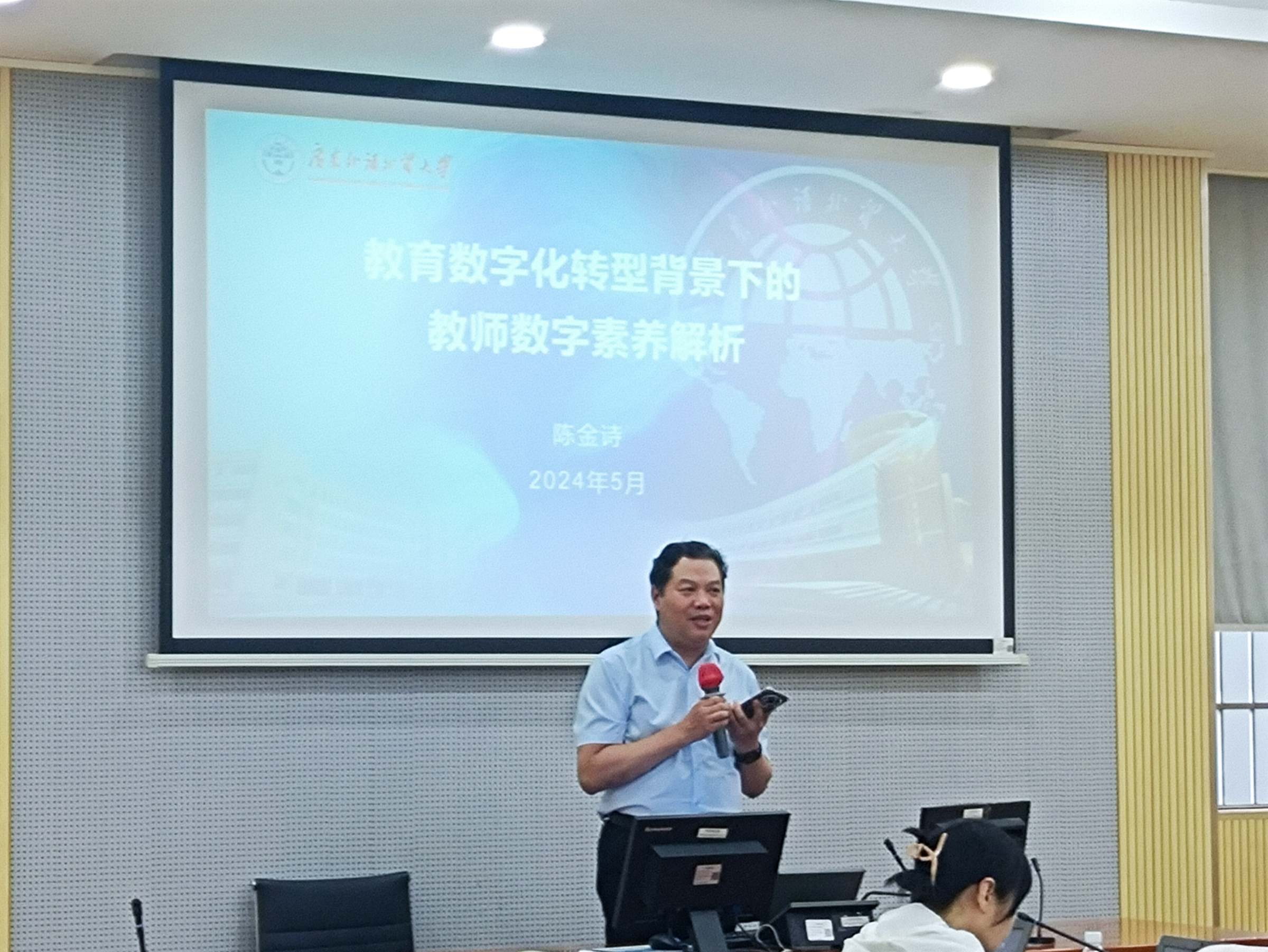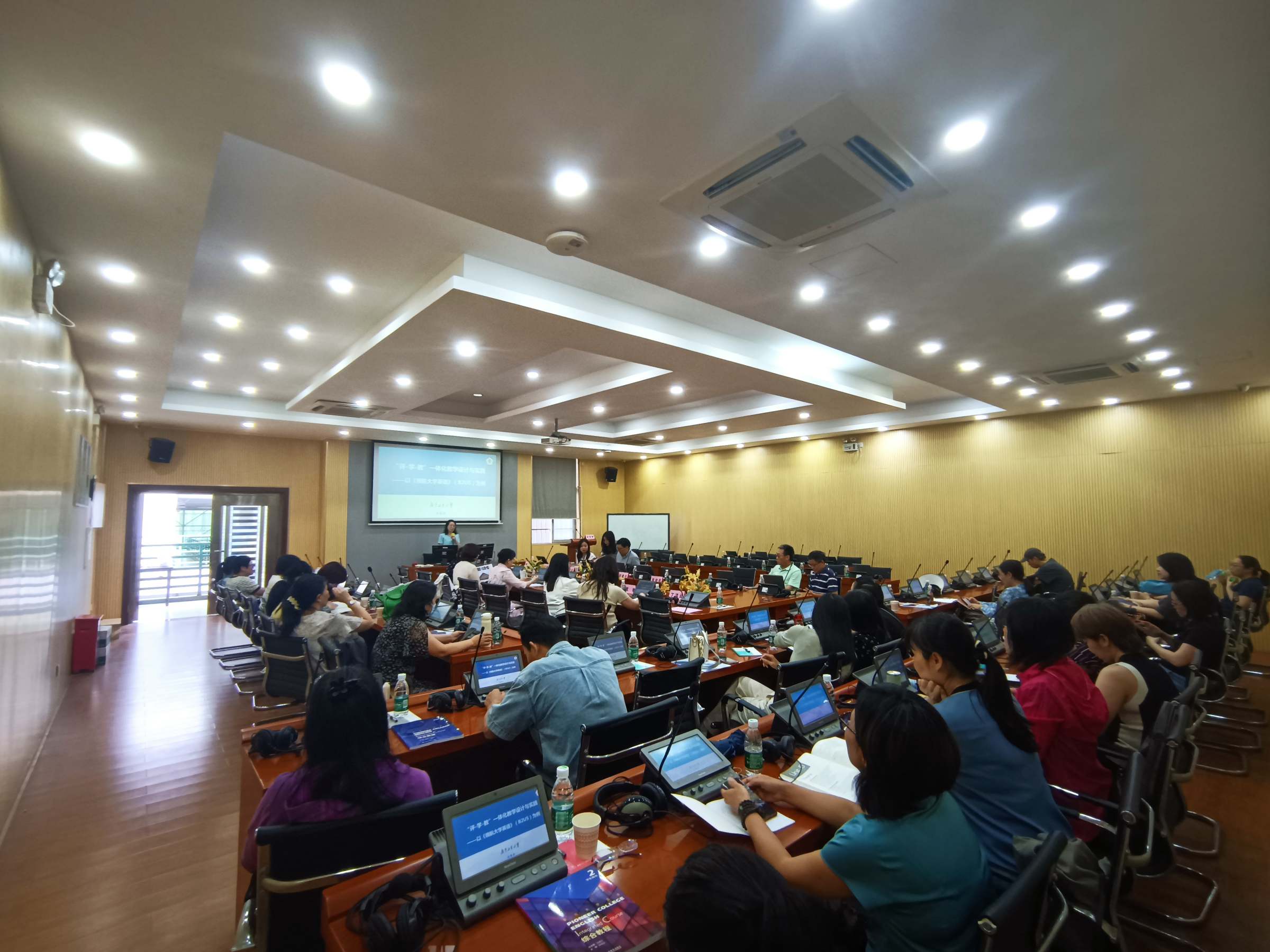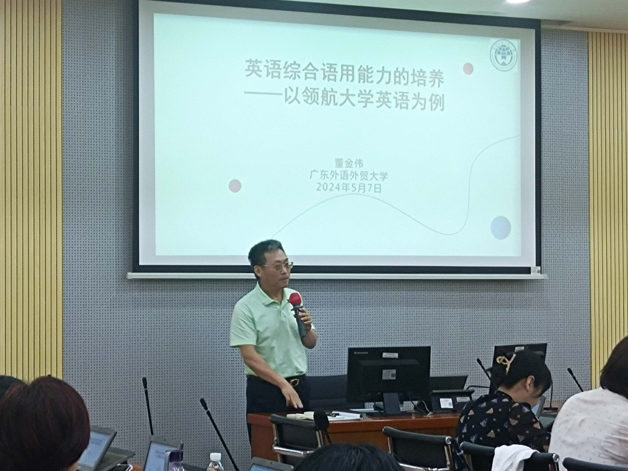 5月7日下午,外国语学院在实验楼308同声传译实验室举办“新理念•新模式•新形态——高质量外语教学师资培训会”。会议邀请广东外语外贸大学副校长刘建达教授、广东外语外贸大学教务部部长陈金诗教授、华南理工大学韩金龙教授、广东工业大学陈晓茹教授、广东外语外贸大学董金伟教授等专家做主旨发言。外国语学院院长陈冬纯,副院长武敏及公共外语教学中心全体教师参加会议。