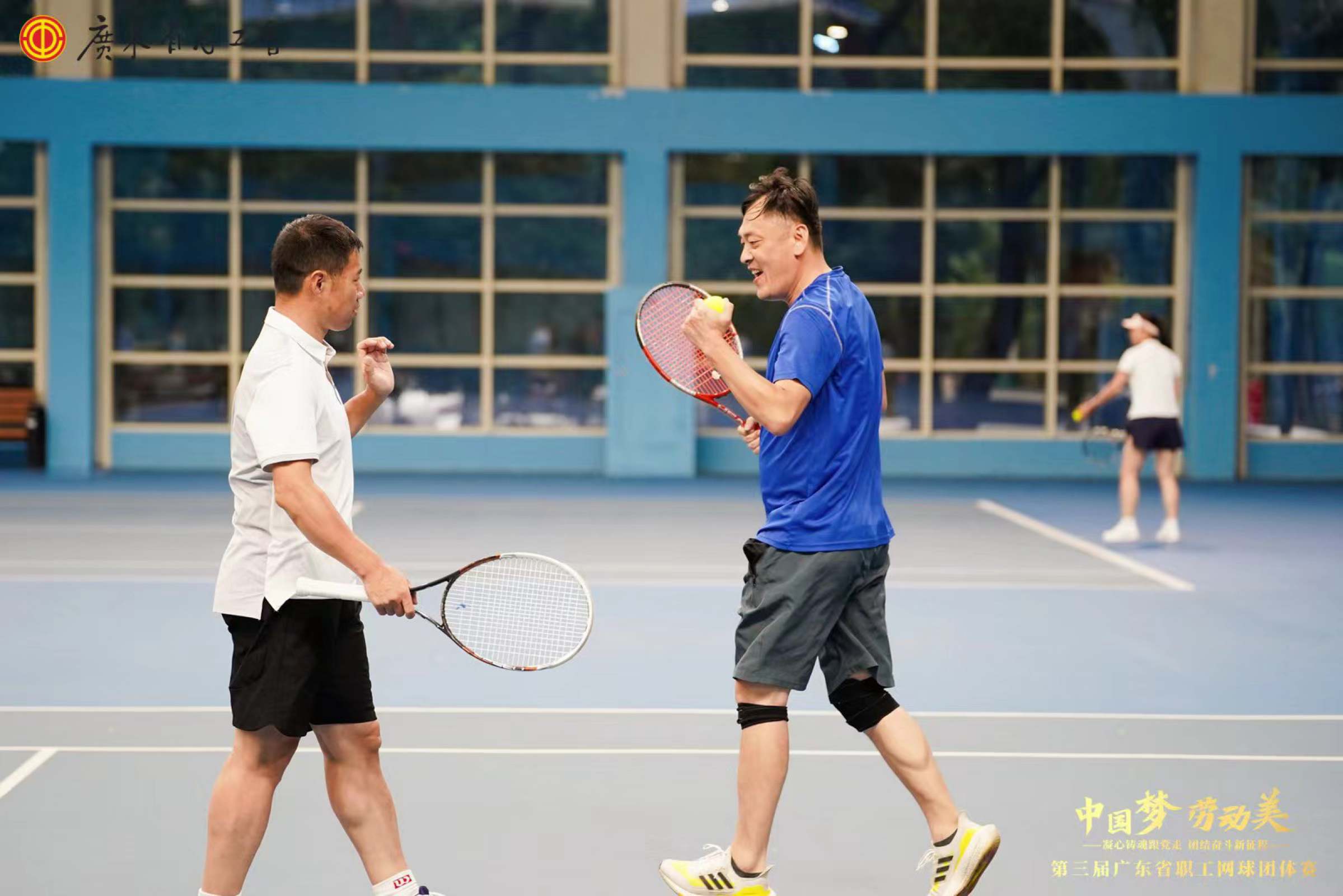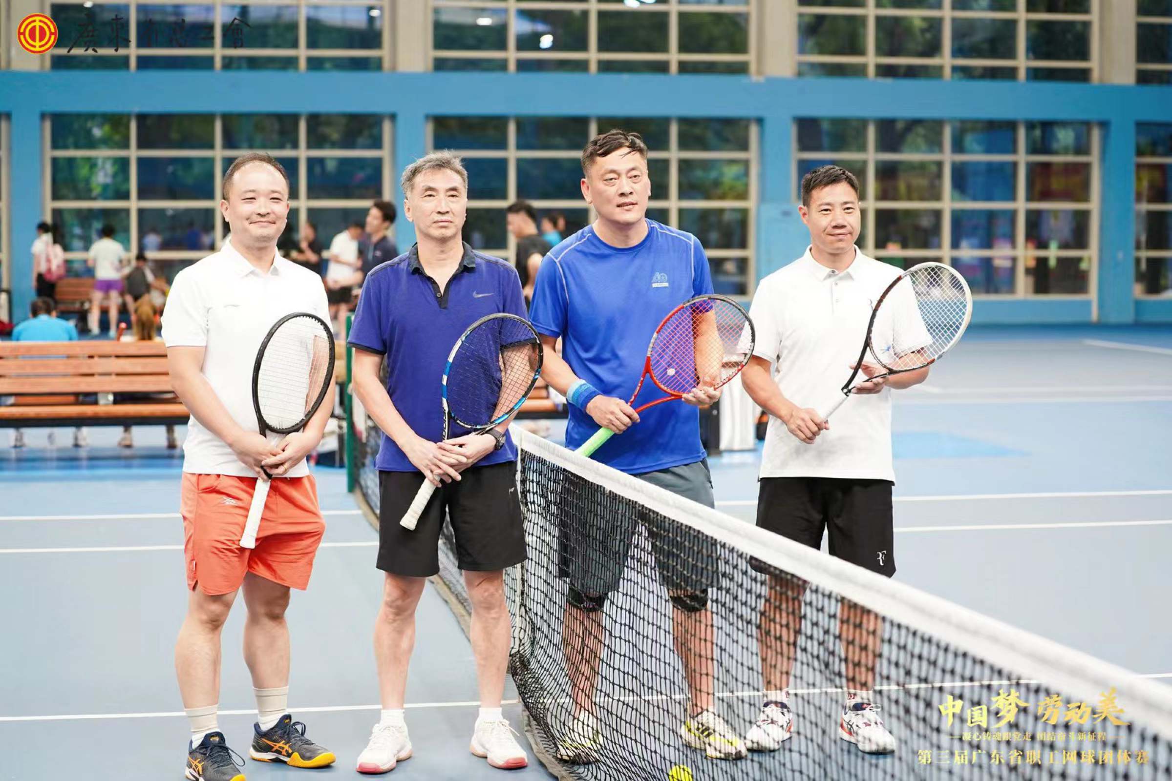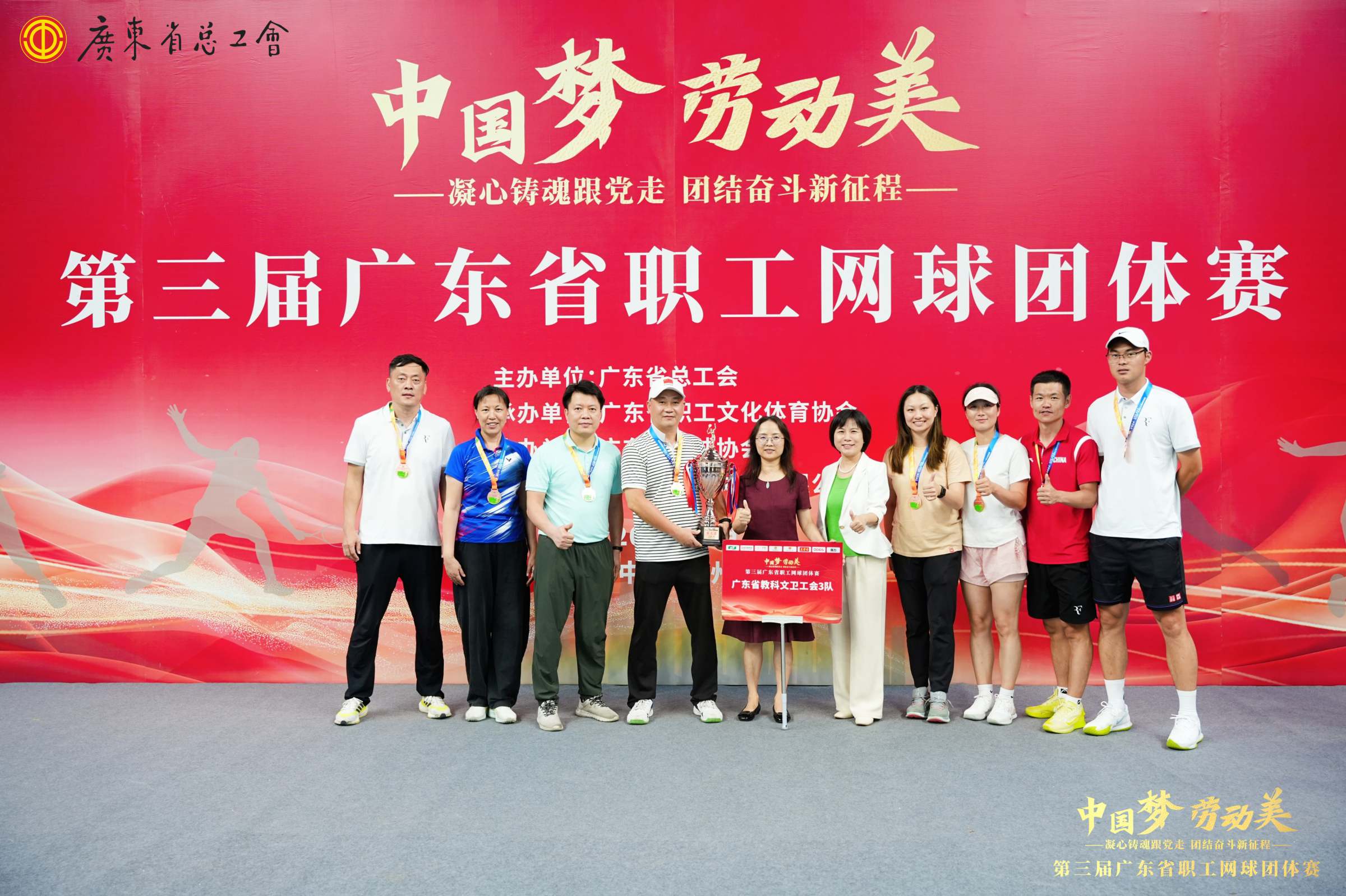 5月6日至10日,“中国梦·劳动美——凝心铸魂跟党走,团结奋斗新征程”第三届广东省职工网球团体赛开幕式在广州开发区国际网球学校举行。省教科文卫工会遴选我校教工网球队代表省教科文卫工会3队参赛。网球队领队由教工网球协会会长方彤彤担任,队员有袁宾峰、李海波、徐梅煌、吴恒星、王建国、郑红艳、史满满、张煜堃等8名队员组成。经过4天的多轮角逐,我校教工网球队充分发挥团队精神,以扎实的技术、随机应变的战术和强大的心理素质在本次赛事上脱颖而出,喜获省直组第三名的优异成绩。