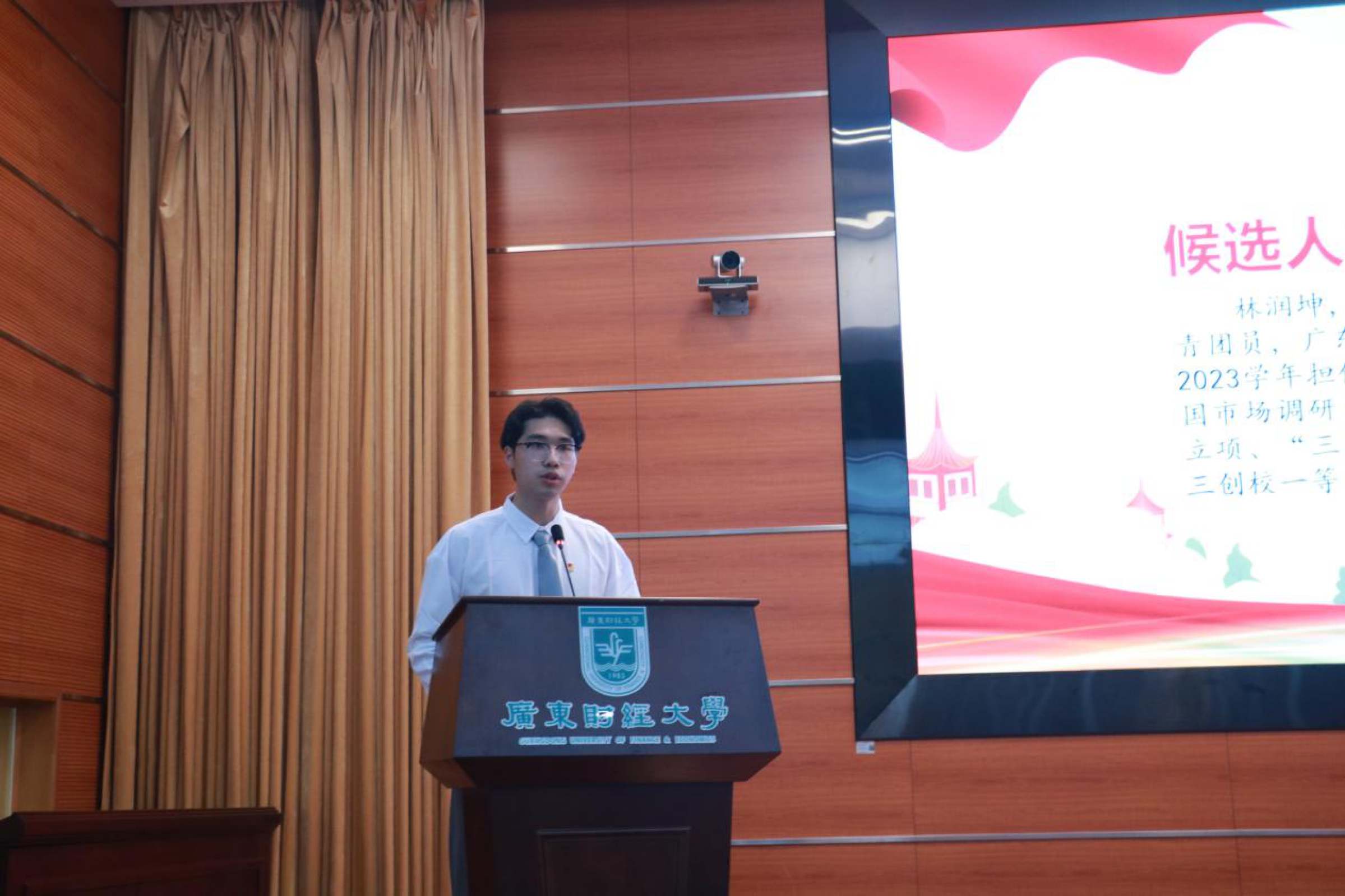 接着,四位学生会主席团候选人依次上台发表竞选演讲,每一位候选人都坚定自信地讲述了自己的优势以及竞选成功后为同学们服务的预期展望,并表示,如若竞选成功,将秉承“服务同学,追求卓越”的宗旨,全心全意为同学们服务。随后,参会代表有序投票,经过公开、公正、公平的选举,蔡旭南、梁书瑜、林润坤当选金融学院新一届学生会主席团成员。