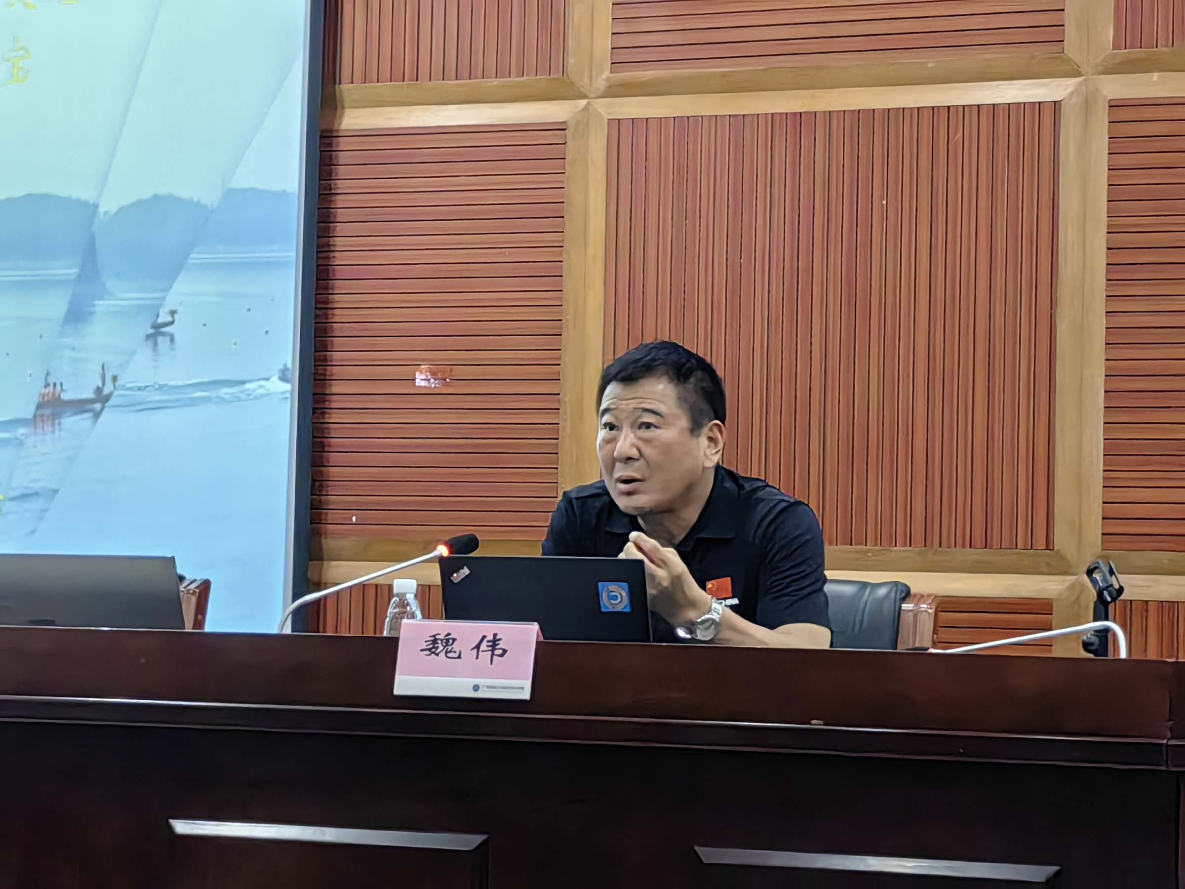 魏伟从龙舟起源、龙舟训练、龙舟比赛规程以及龙舟入奥等四个方面对龙舟运动的发展进行了具体阐述和分享。他指出龙舟运动是最有代表性的民俗体育活动,是中国唯一有可能进入奥运会的传统特色项目,是在国际舞台上打响“龙”的民族——中华民族的重要运动。他从屈原等多个历史人物讲述了龙舟运动的起源,并通过视频对龙舟训练以及创新性比赛项目进行了生动详细的解读,从奥运会比赛项目的标准提出龙舟运动加入奥运会的发展空间,肯定了龙舟运动未来的发展潜力,并为我校成立龙舟队,发展龙舟运动提出了具有建设性的意见和建议。