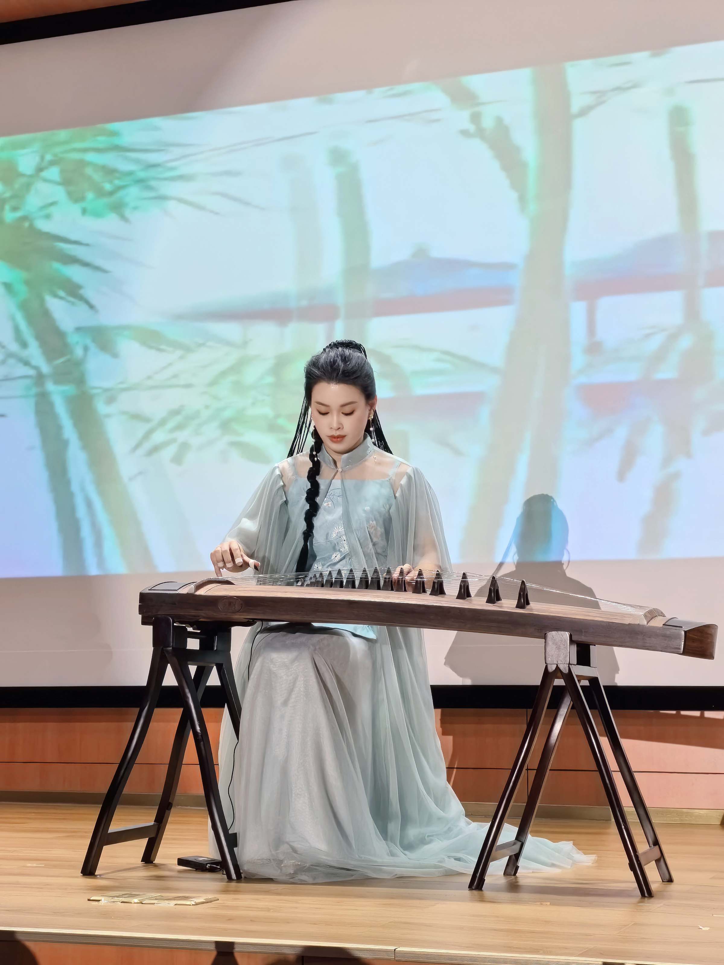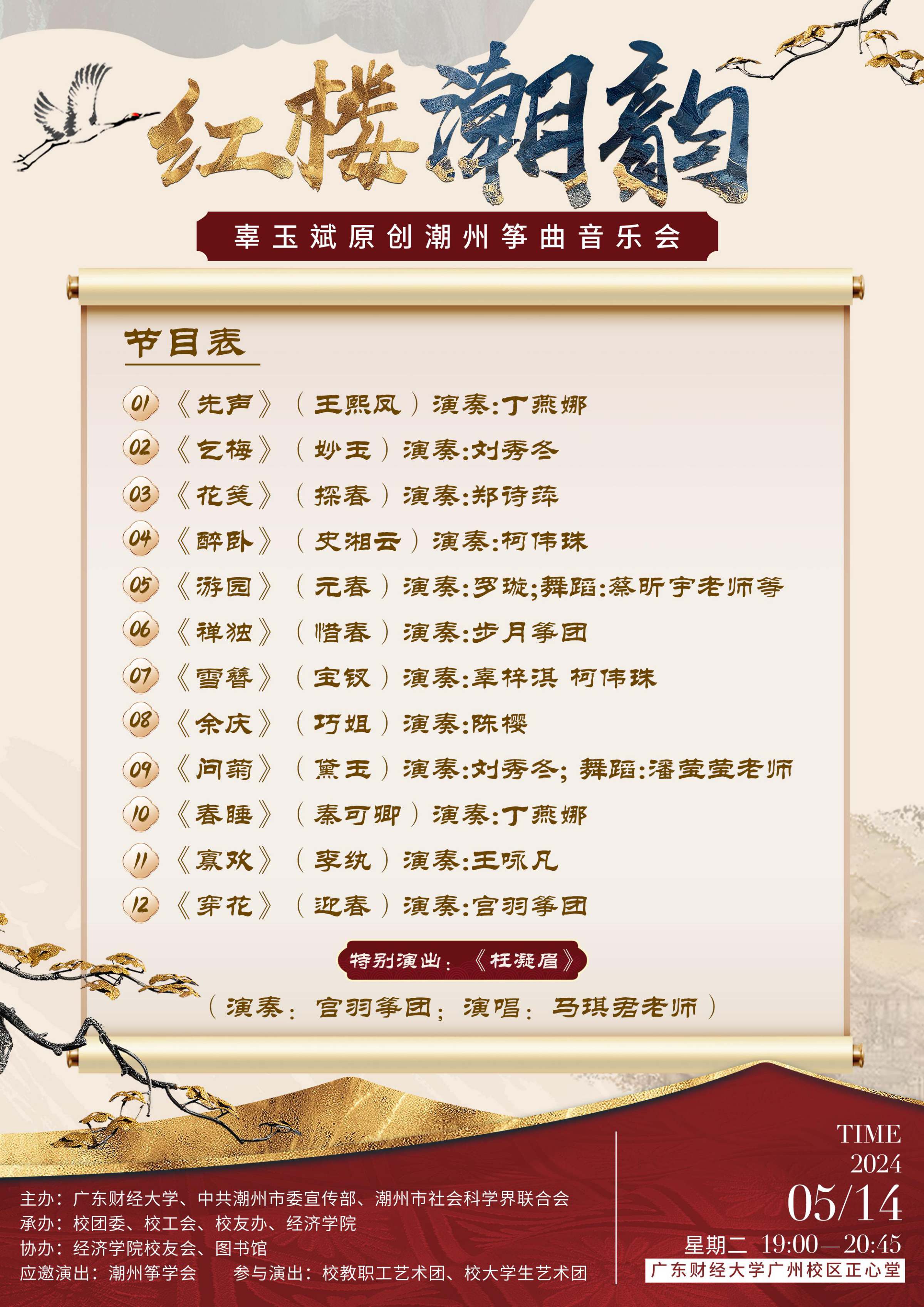 音乐会上,潮州筝学会副会长兼秘书长丁燕娜、步月琴坊创始人刘秀冬、返璞归筝学苑创始人罗璇,潮州筝学会郑诗萍、柯伟珠、辜梓淇、陈樱、王咏凡和步月筝团、宫羽筝团等演奏了潮州筝《春睡》《醉卧》《禅独》等十二个曲目。我校艺术与设计学院蔡昕宇老师及相关同学和潘莹莹老师分别在曲目《游园》和《问菊》中进行了舞蹈表演。在特别演出环节,湾区影视产业学院马琪君副教授和宫羽筝团共同演绎了《枉凝眉》(电视剧《红楼梦》插曲)。暖场环节由校大学生艺术团成员、法学院2022级学生黄兰惠进行了二胡演奏。