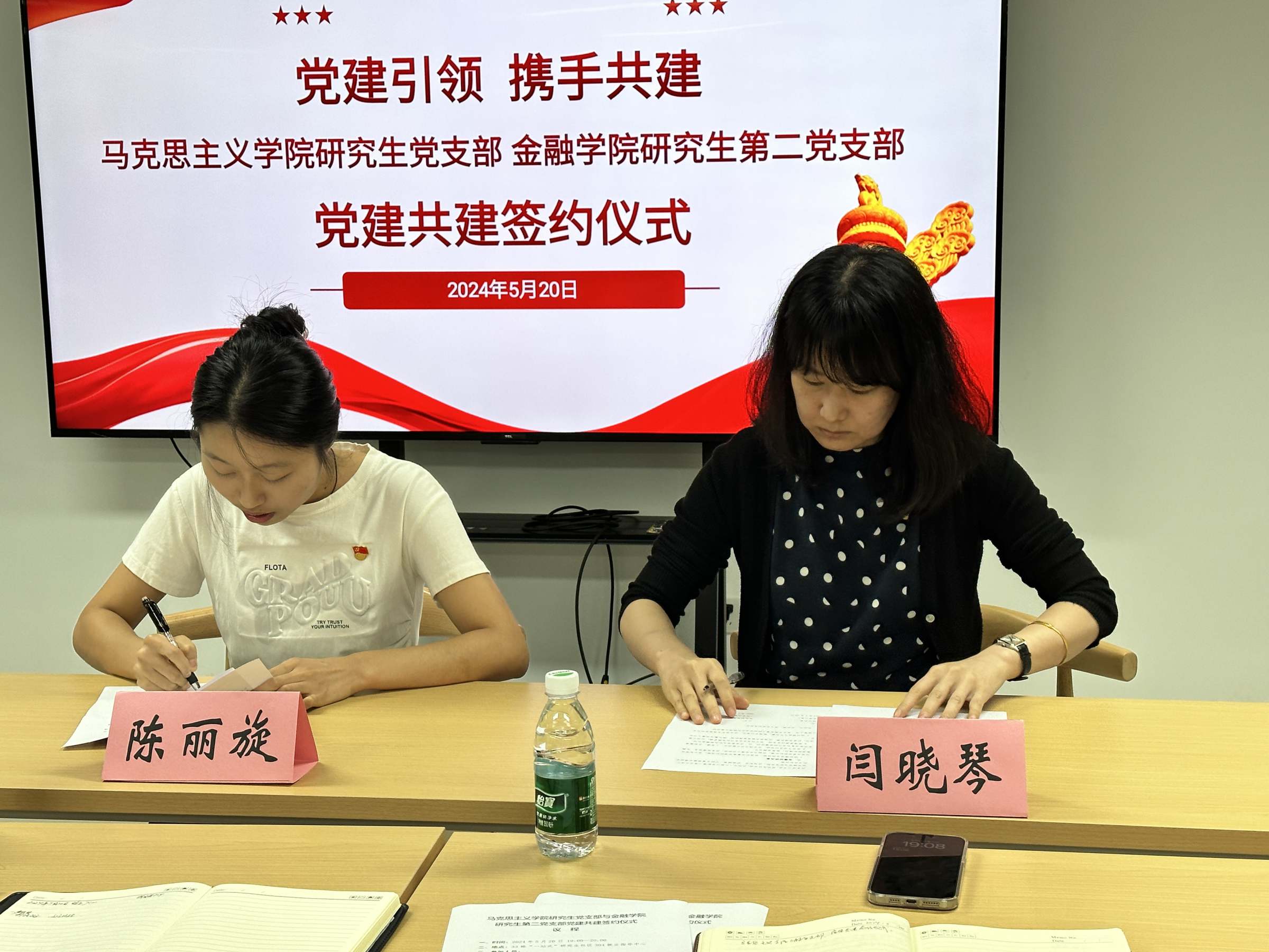 紧接着,在全体党员的共同见证下,马克思主义学院研究生党支部书记陈丽旋与金融学院研究生第二党支部书记闫晓琴正式签定《党组织结对共建协议书》。根据协议,双方党支部将在党内政治生活、组织生活、理论学习、社会实践、志愿服务等方面开展深度合作。