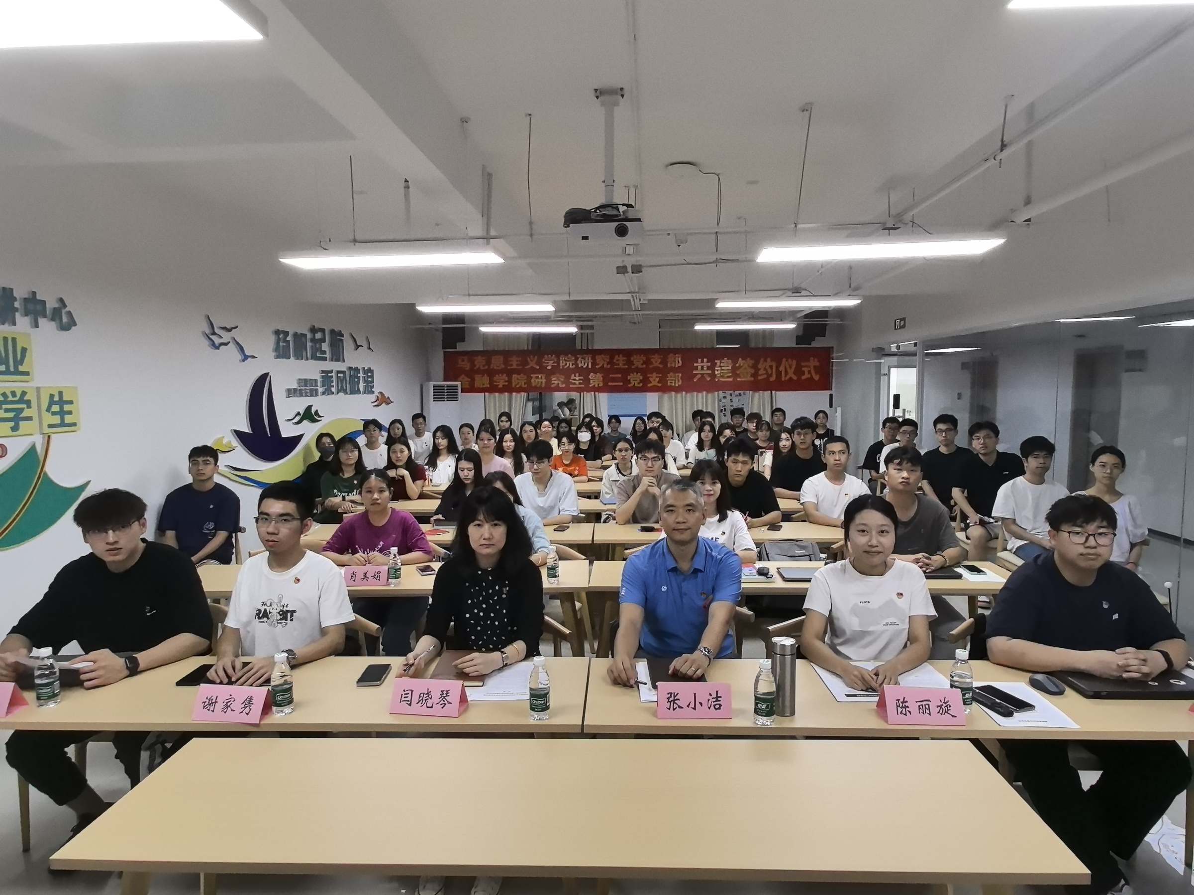 5月20日晚上,马克思主义学院研究生党支部与金融学院研究生第二党支部在33栋“一站式”研究生社区304活动室举行党建共建协议签约仪式。签约仪式由金融学院研究生第二党支部副书记刘缘主持,马克思主义学院党委书记张小洁、金融学院研究生第二党支部书记闫晓琴老师、马克思主义学院研究生党支部书记陈丽旋和全体党员研究生共50多人参加。