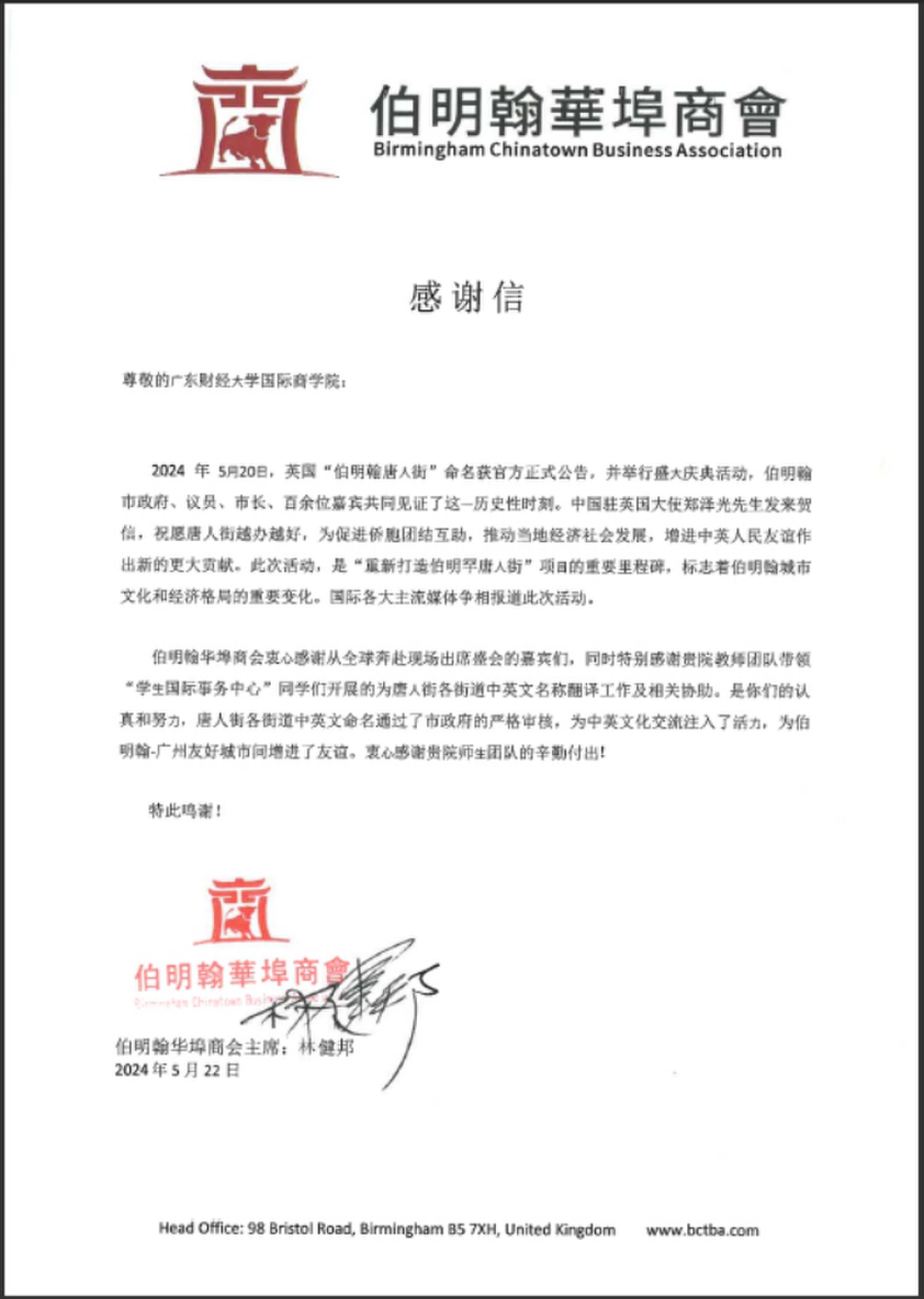 近日,国际商学院收到英国伯明翰华埠商会林健邦主席发来的感谢信,感谢国际商学院教师团队带领学⽣国际事务中心同学们为伯明翰唐⼈街各街道中英文名称翻译所做的工作及提供的相关协助。今年一月份学⽣国际事务中心接到翻译工作协助请求后,迅速组织师生团队,在短时间内完成任务并提交初稿,由伯明翰华埠商会综合多方建议提交市政府审议后确定颁布。