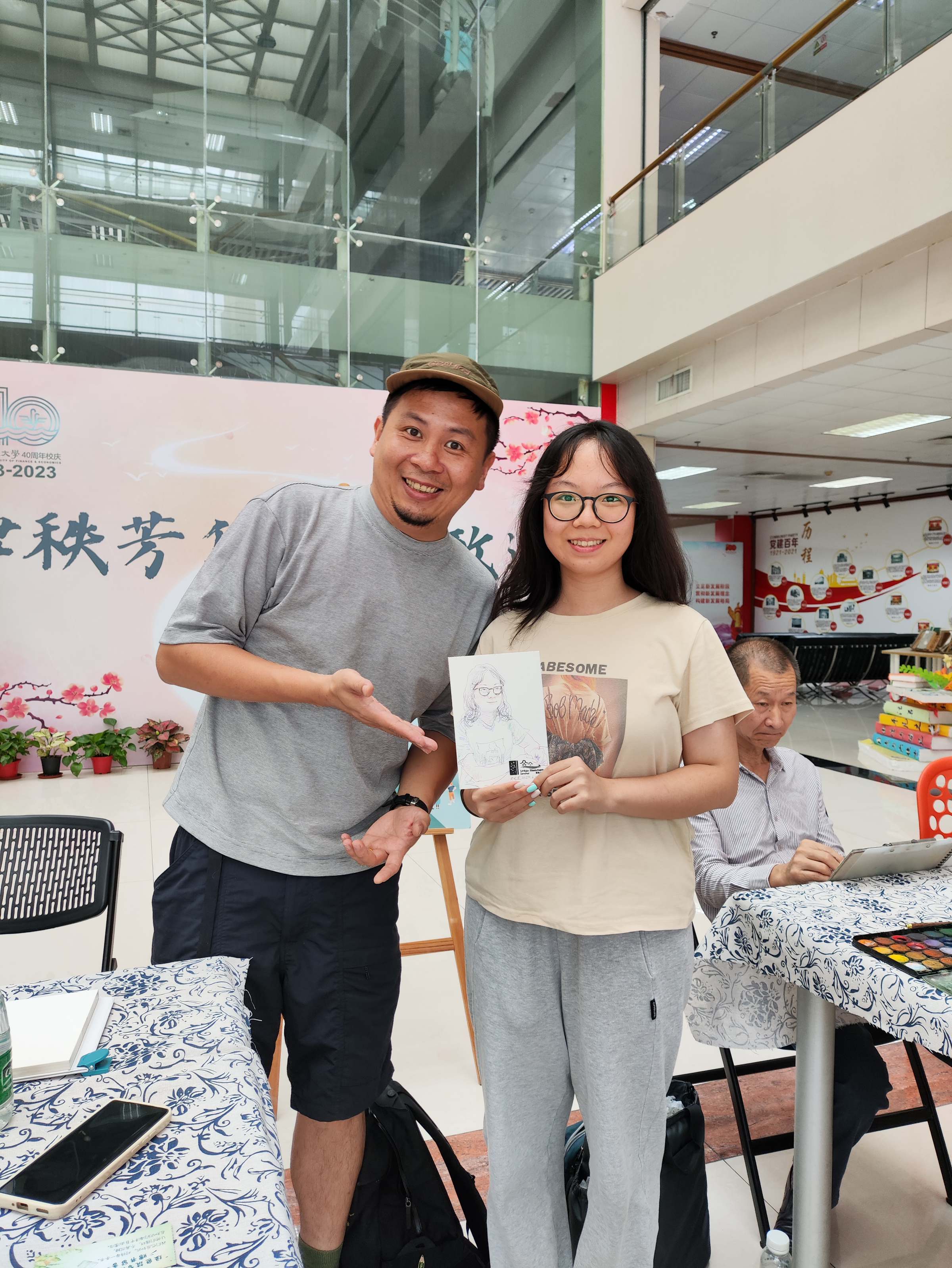 此次图书集市活动现场设共有换书摊位、文创摊位、绿色摊位、志愿者招募摊位,以及人物速写摊位五个摊位,活动现场吸引了众多师生参与。换书摊位围着一圈的同学,同学们有的拿着三五本书,有的抱着十几本书,还有的拖着箱子装着三四十本书前来捐赠或兑换。为了增加同学们对佛山文化和三水区地方文化的了解,三水区图书馆提供了《石湾陶》《佛山市三水区革命老区发展史》《恋上淼城》《遇见淼城》《云上东海》等地方文献。文创摊位提供了我校图书馆和三水区图书馆设计制作的文创笔记本、亚麻环保袋、金属书签等文创产品。绿色摊位提供了种子盆栽盲盒、种子卡片和少量水果,目的是宣传绿色环保理念,引导同学们积极参与书籍循环活动,共同建设绿色图书馆。志愿者招募摊位提供了三水区图书馆志愿服务岗位,是同学们走向社会难得的实习锻炼岗位。人气最旺的是人物速写摊位,从活动开始至结束,始终有同学在排队等着。只见老师们一边欢声笑语地与同学们聊天,一边不停地划动着手中的笔,不一会儿,同学们一张张可爱的脸便跃然纸上。