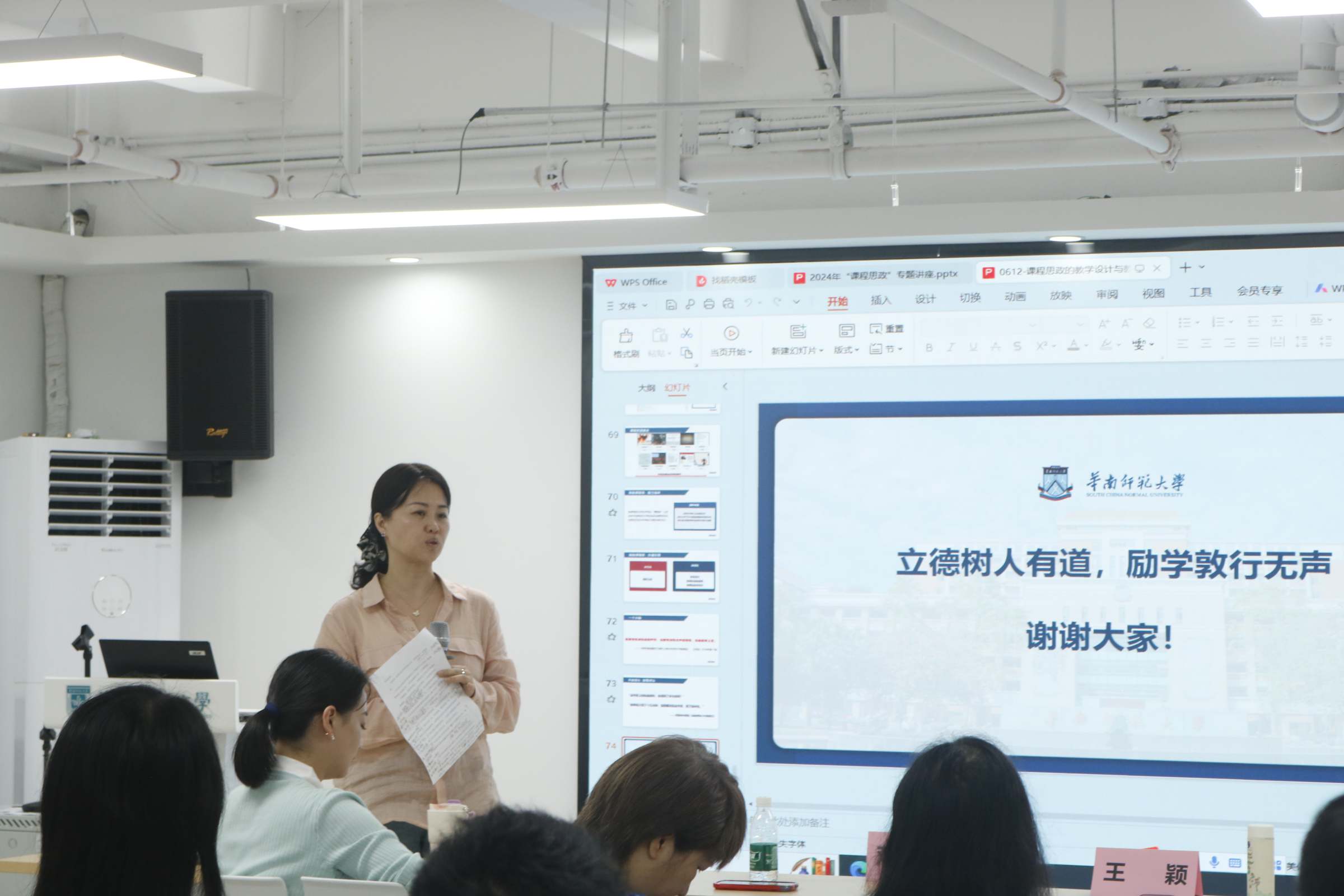 王颖从对课程思政的理解、课程思政的教学设计和课程思政的教学实践三个方面进行了分享。首先,她通过一些鲜活的课程思政“硬融入”案例,对老师们在实施课程思政时普遍存在的误区进行了深入剖析。针对融入过程中的痛点和难点问题,讲授了如何通过优化教学设计、创新教学方法等方式,将知识传授、能力提升和价值引领等育人目标有机融为一体,使课程思政融入达到“如盐化水”的效果,实现立德树人的根本任务。