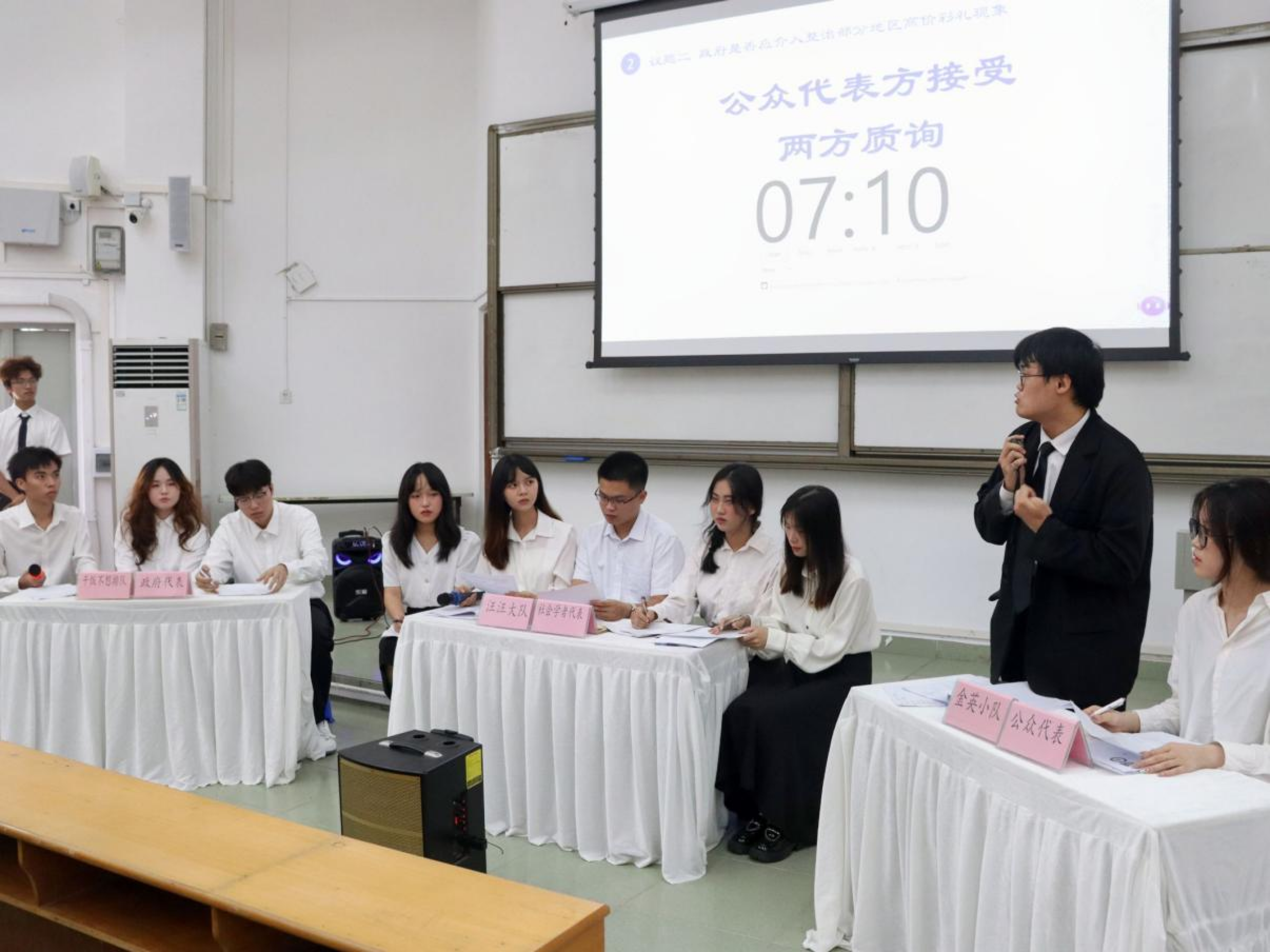 共有六支参赛队伍进入到决赛环节。决赛分为两个阶段,第一阶段参赛队伍围绕议题“是否应该取消节假日高速免费政策?”进行了观点陈述、互相质询。第二阶段,三支参赛队伍围绕议题“政府是否应该介入整治部分地区高价彩礼现象?”进行观点陈述、相质询。在队伍互相质询的环节,各方队伍根据他方陈述中的漏洞,相继提出质询。在此期间,队员们展现出了冷静和从容的状态,他们思路明确,有条有理,用事实案例进行论证,有力地回应了质询方,进一步巩固了己方立场。比赛间隙,赛事主持人通过联系听证会制度,向现场观众提出了与近期社会热点相关的问题,与观众进行了积极的互动讨论。经过精彩的角逐和评委的点评与评分,此次模拟听证会决赛决出了获奖队伍,一等奖“汪汪大”队,二等奖“听民者明”队,三等奖“金英小”队以及部分优胜奖。