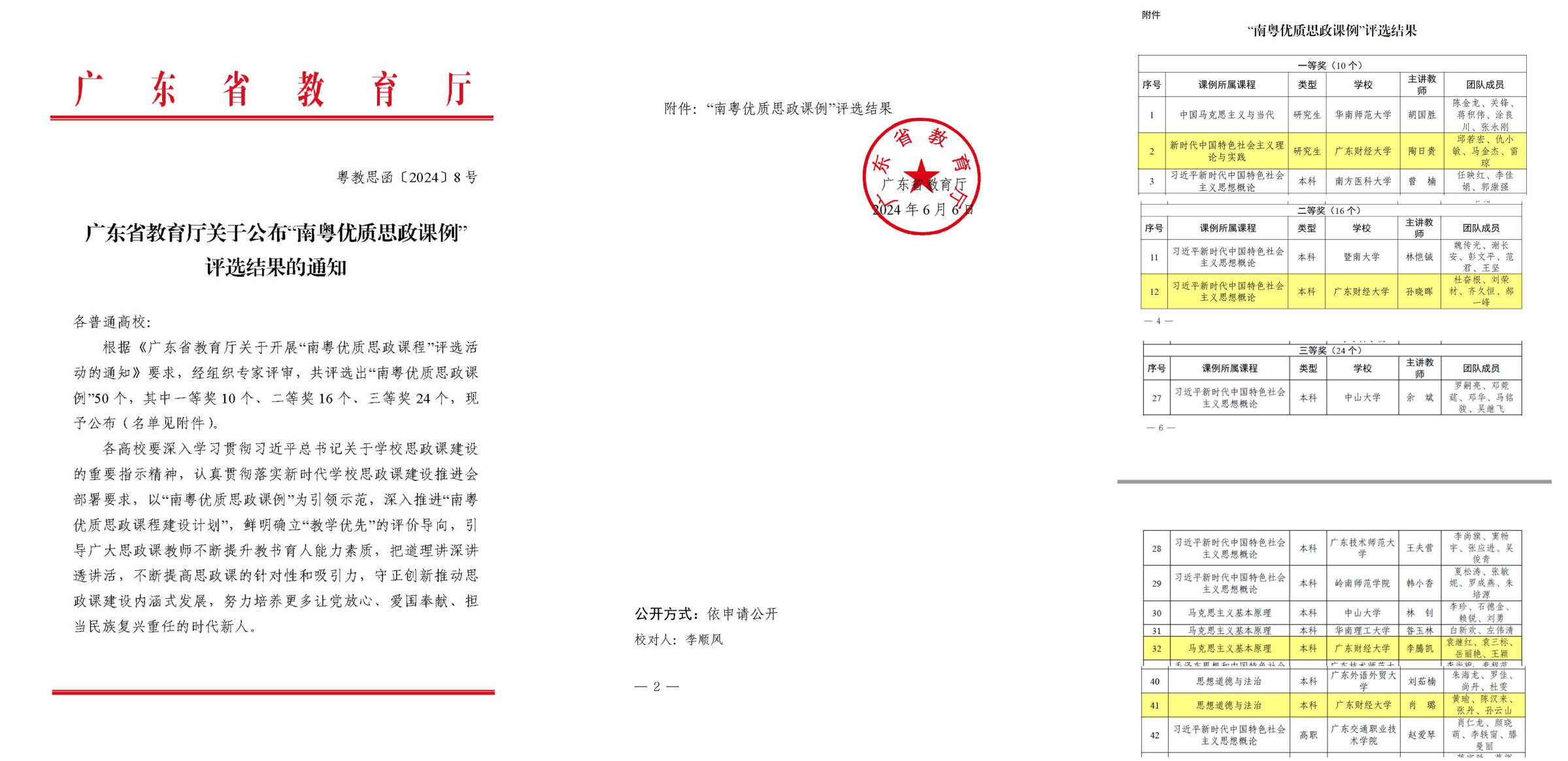据悉,根据《广东省教育厅关于开展“南粤优质思政课程”评选活 动的通知》要求,经组织专家评审,共评选出“南粤优质思政课例”50 个,其中一等奖 10 个、二等奖 16 个、三等奖 24 个。