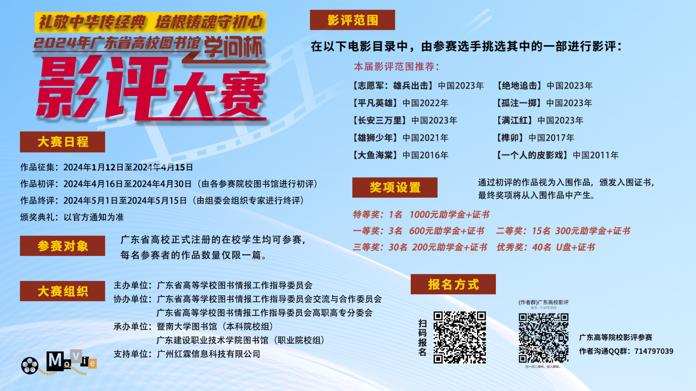 广东省高校图书馆“学问杯”影评大赛自2017年起举办,分各参赛高校初评和全省高校终评两个阶段,今年共吸引了省内122所高校近1万名大学生参与。我校图书馆将赛事纳入读书文化节,同时通过分享影评知识、举办电影展映周、指导修改作品等方式,帮助学生深入理解电影作品,提高鉴赏和写作能力,提升参赛作品的质量。