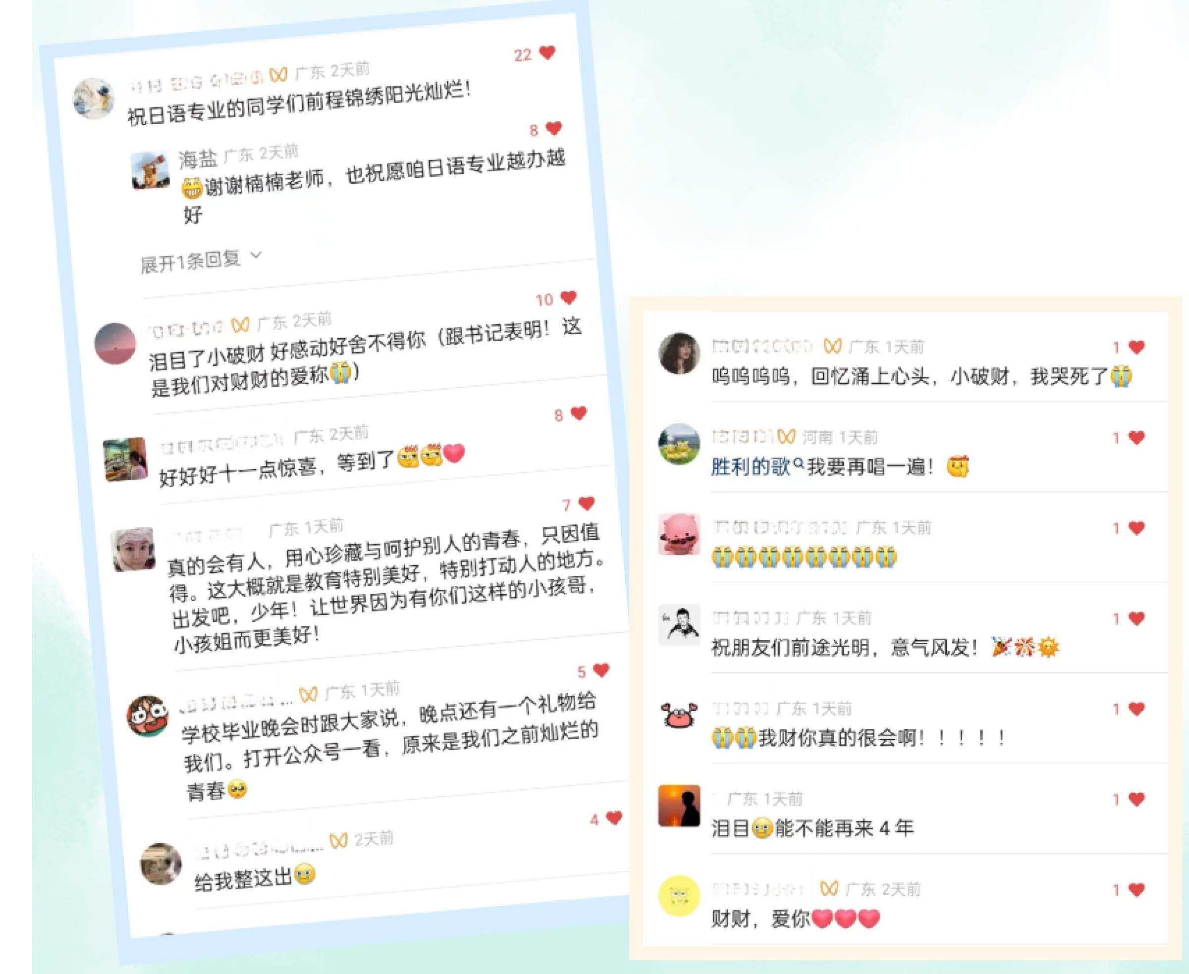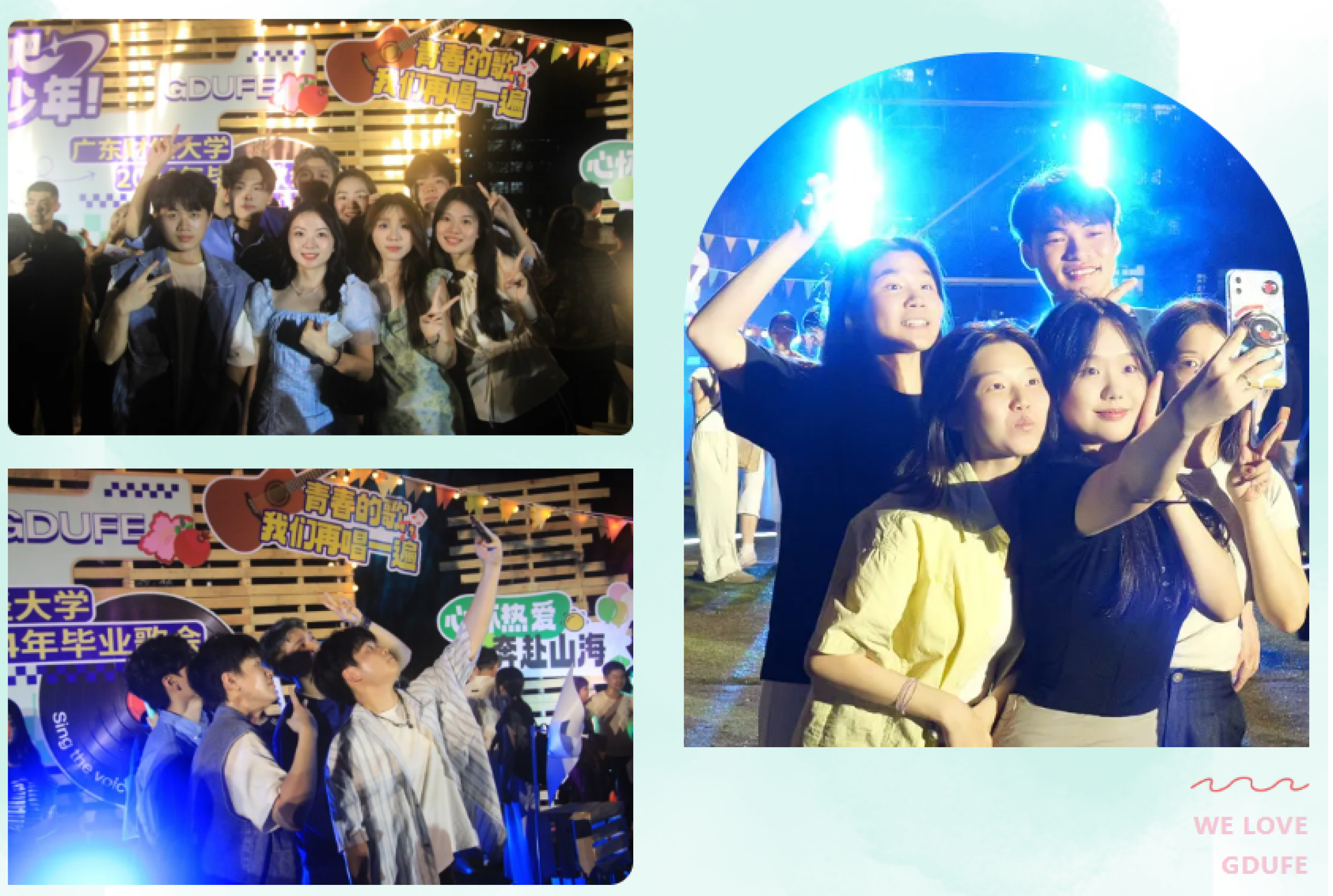 "青春散场,我们等待下一场开幕,等待我们在前面的旅途里迎着阳光,勇敢地飞向心里的梦想。等待我们在前面的故事里就着星光,回忆这生命中最美好的四年盛开过的花!"