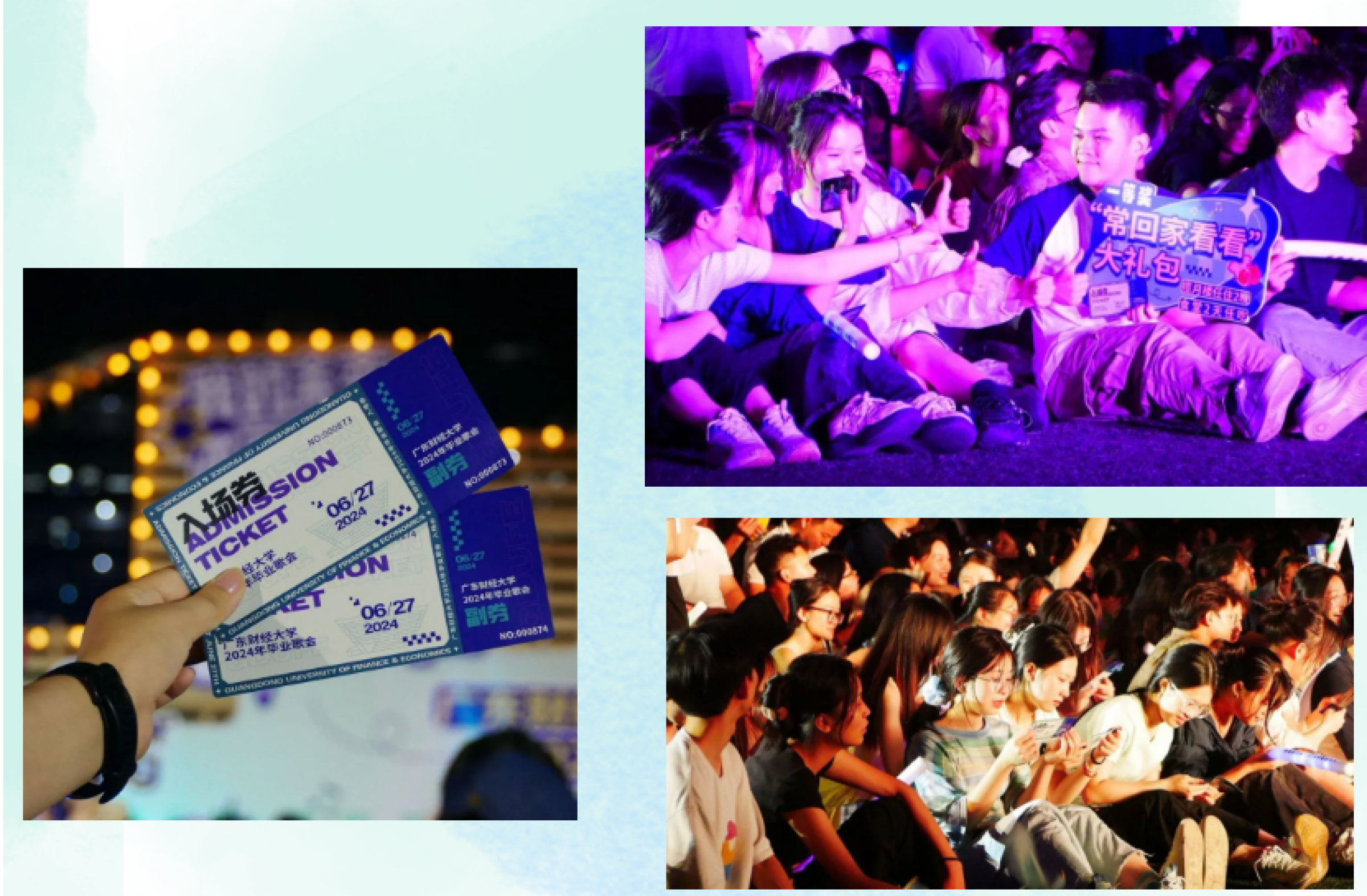 歌会精心设计了中奖规则,所有等次的奖品的获奖线索,都暗置在了一张小小的入场券上。编号1983、2024的入场券,可以换取学校餐厅的套餐,歌会后就可以约着小伙伴们再来一次夜宵。而30张印有“石榴果”底纹、20张印有“钟楼”水印的入场券,则对应着设计精美的原创托特包和学校40周年校庆礼盒。当晚一等奖,是爱意满满的“常回家看看”套餐,获奖者毕业后返校时,可以免费入住揽月楼公寓2天,在校内饭堂任吃两天,再感受一次母校的温暖。而最终的获奖线索,则是印在入场券回字纹上的一句祝福的诗“于道各努力,千里共同风!”。