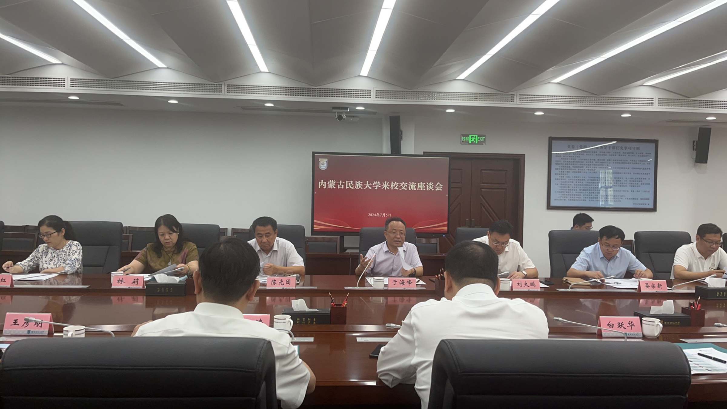 于海峰对内蒙古民族大学调研组一行的到来表示热烈欢迎,详细介绍了我校的发展历史和概况,并用鱼和羊字合二为鲜字的例子形象地比喻了两校的亲密关系。我校各参会单位分别介绍了部门业务工作、创新举措及发展成果。