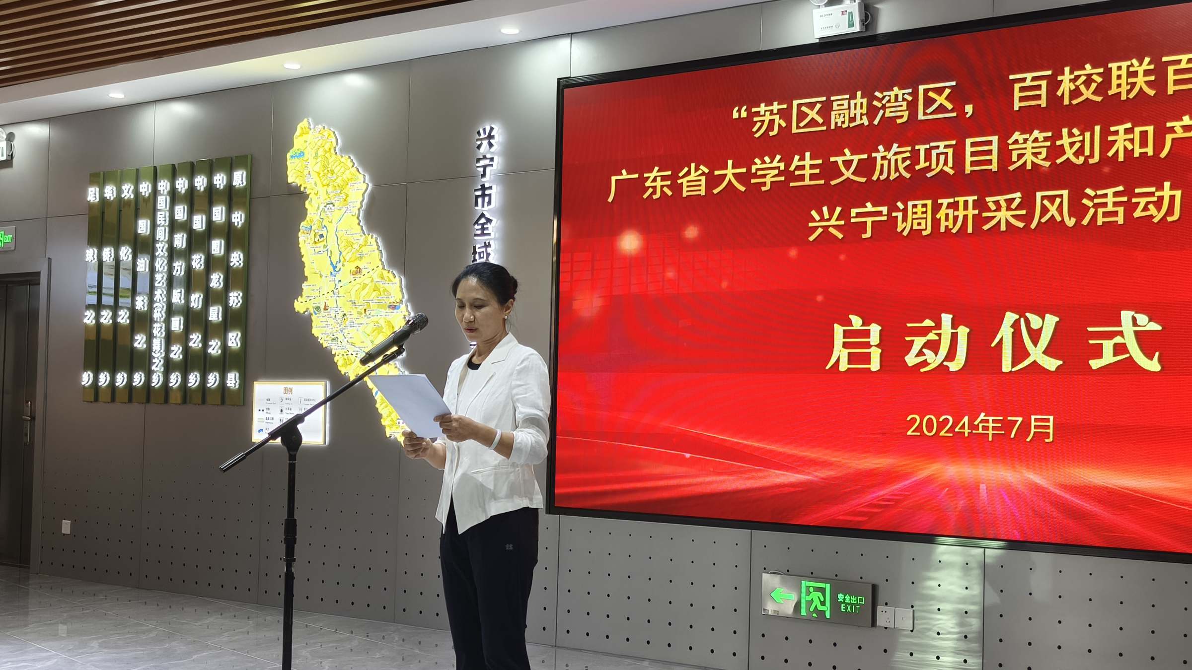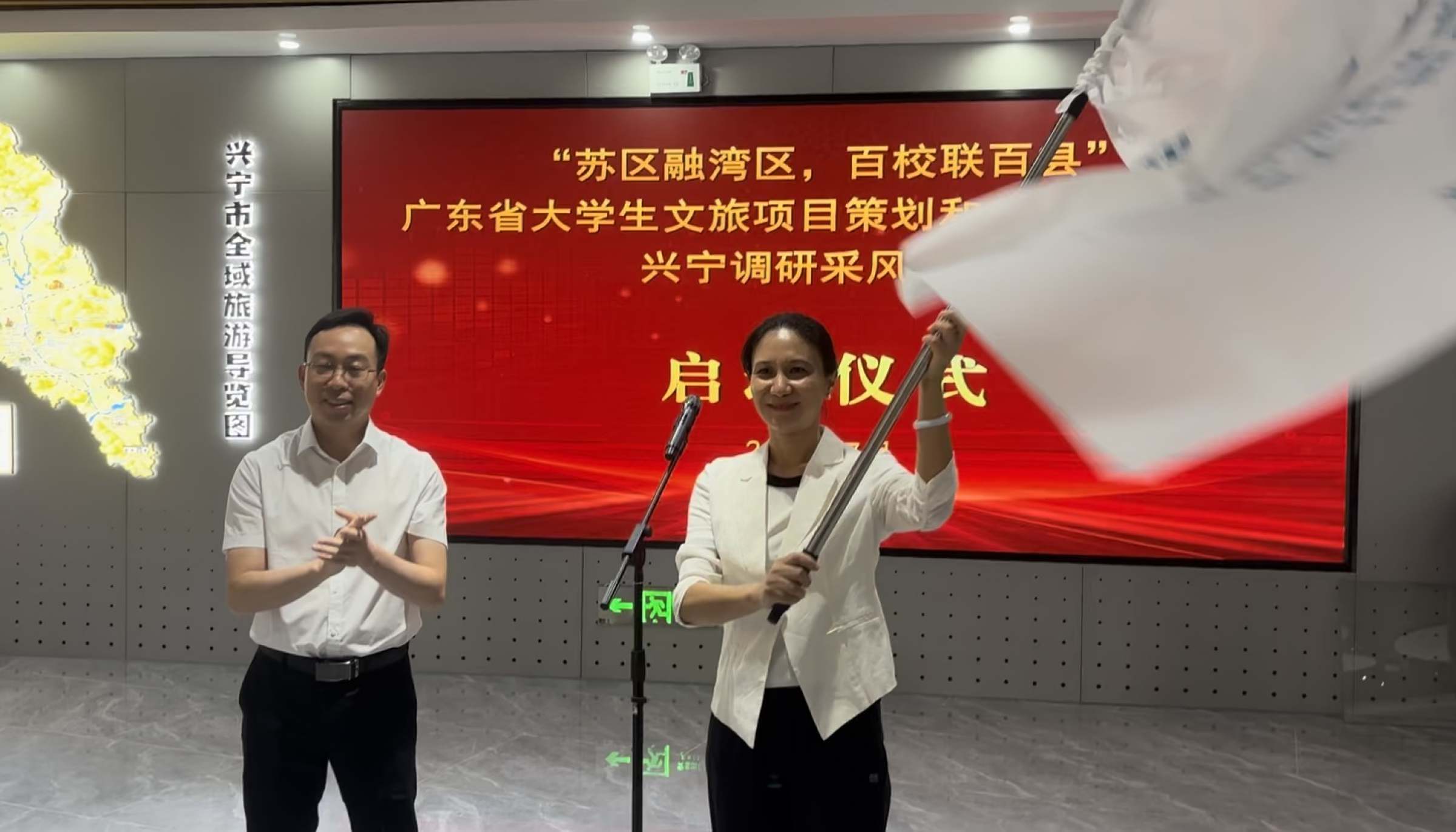 7月16日上午,在兴宁调研采风团正式出发前,全体队员到兴宁旅游集散中心参加了简单又隆重的启动仪式。兴宁市委副书记、省纵向帮扶驻兴宁工作队队长麦东阳,广东财经大学、兴宁市文广旅体局相关负责人,以及决赛学生团队等参加活动。在启动仪式上,兴宁市文化广电旅游体育局副局长朱碧峰发表了讲话,他期望调研团队创作出既具有深度又富有内涵的优秀作品,充分展示兴宁的独特魅力,生动讲述兴宁故事。我校文化旅游学院党委副书记陈蓉详细介绍了大赛的发起背景及组织过程,公布了初赛的获奖名单。最后,麦东阳宣布采风活动正式启动,并向采风团队代表陈蓉授予活动旗帜。