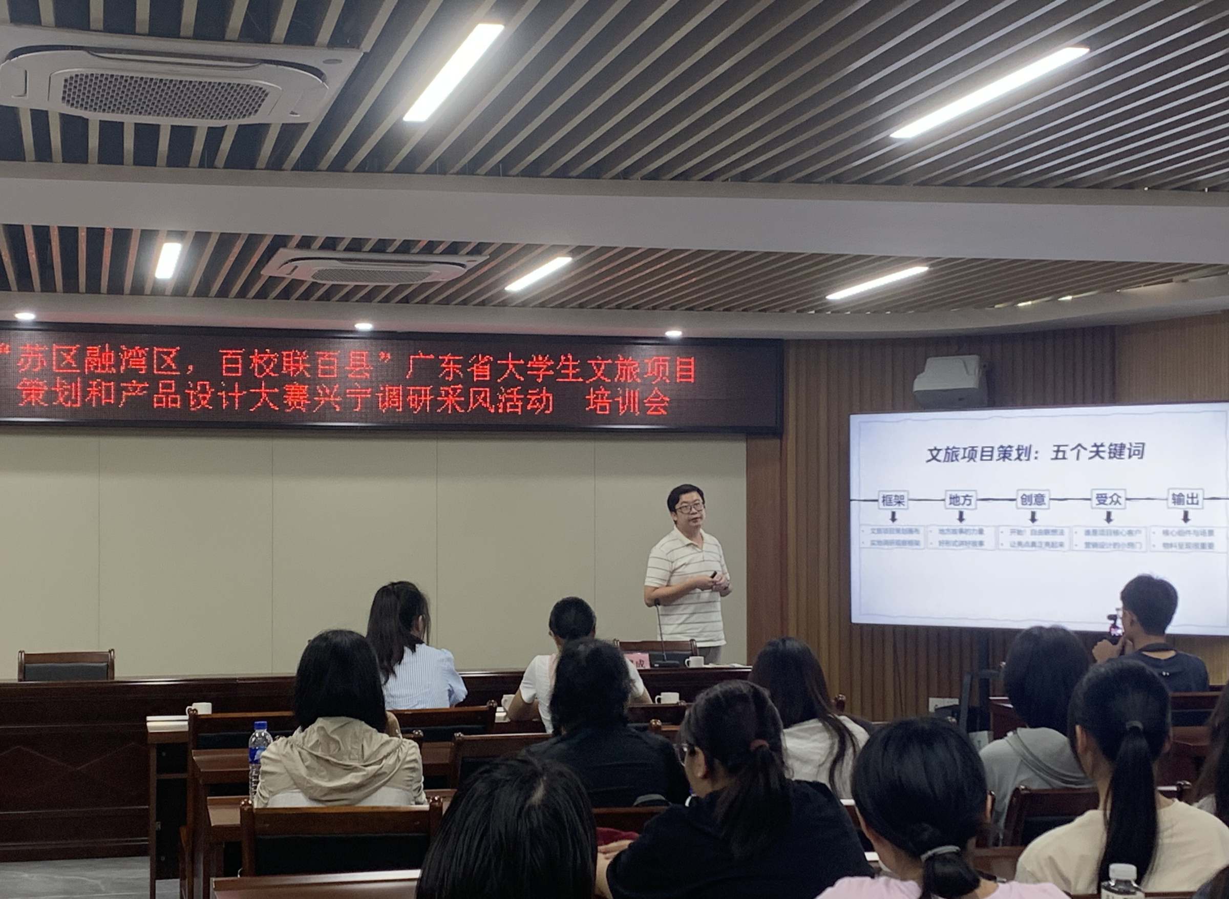 启动仪式前,大赛组委会组织开展了活动培训,兴宁市文广旅体局相关负责人介绍了兴宁的主要旅游资源及文化历史,广东财经大学文化旅游学院潘博成老师为同学们做了《文旅项目策划:五个关键词》的讲座。潘博成老师就“框架”、“地方”、“创意”、“受众”、“输出”五个关键词为核心,为同学们梳理了文旅项目策划和产品设计的思路框架,生动的培训令同学们受益良多。