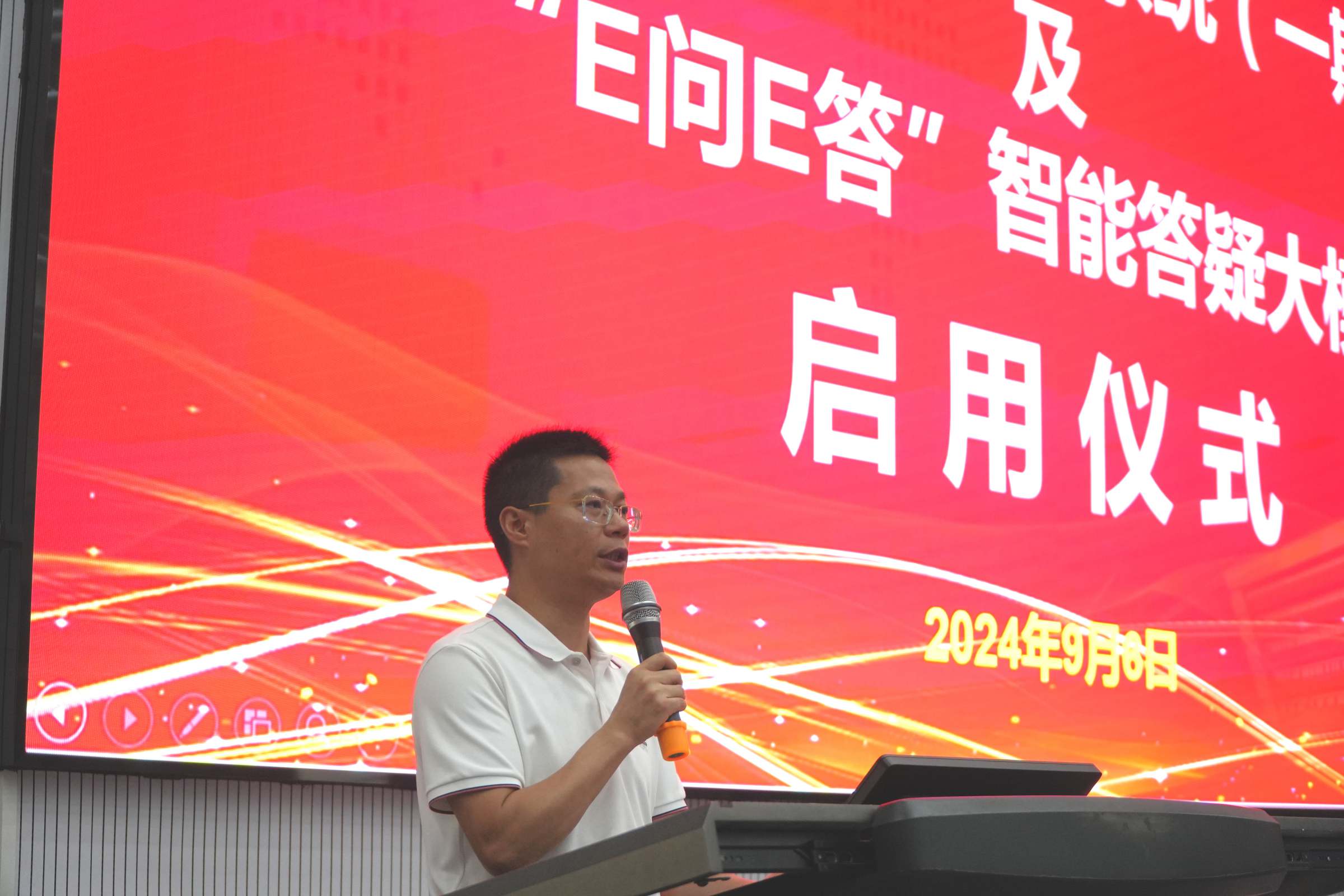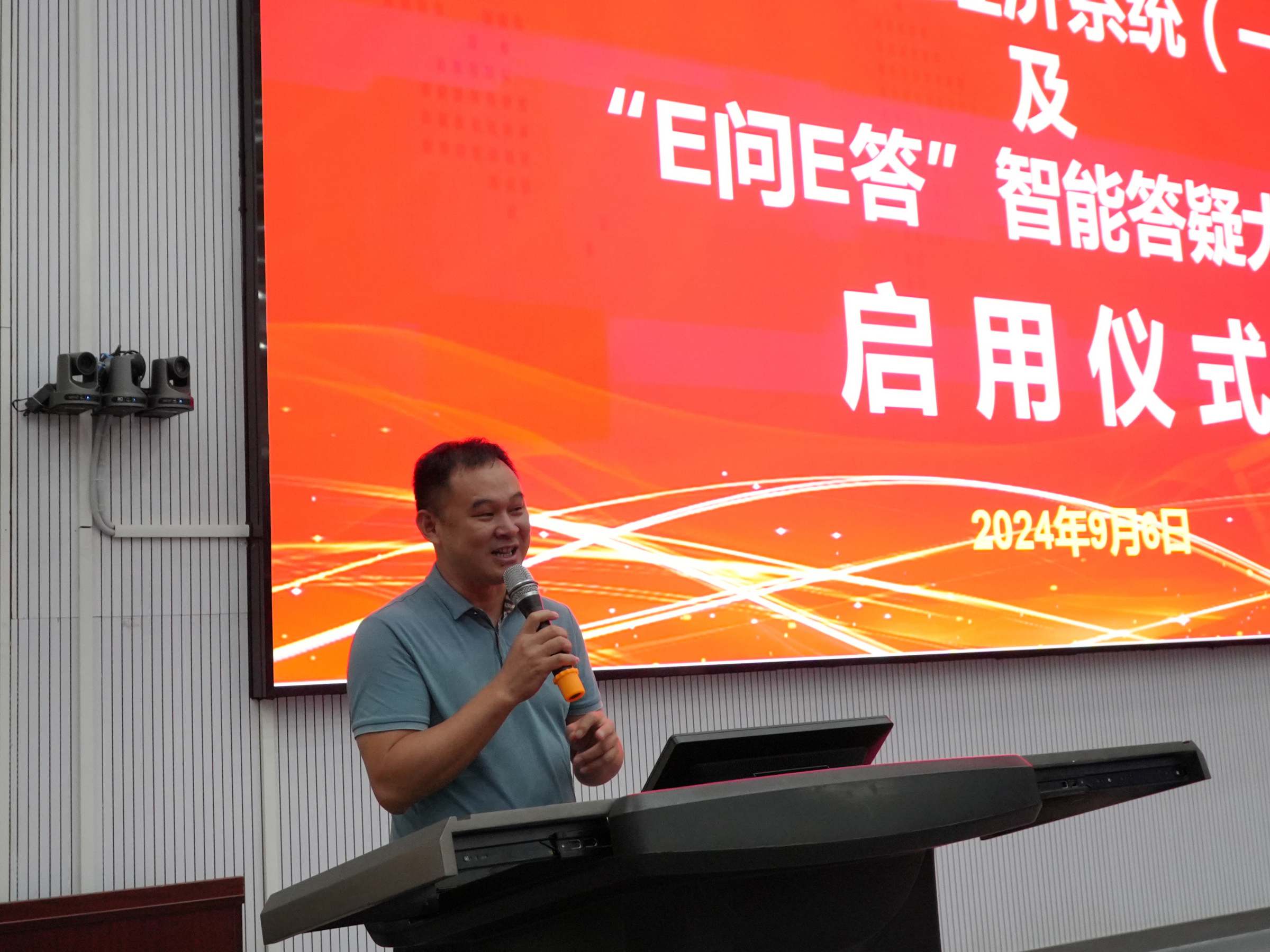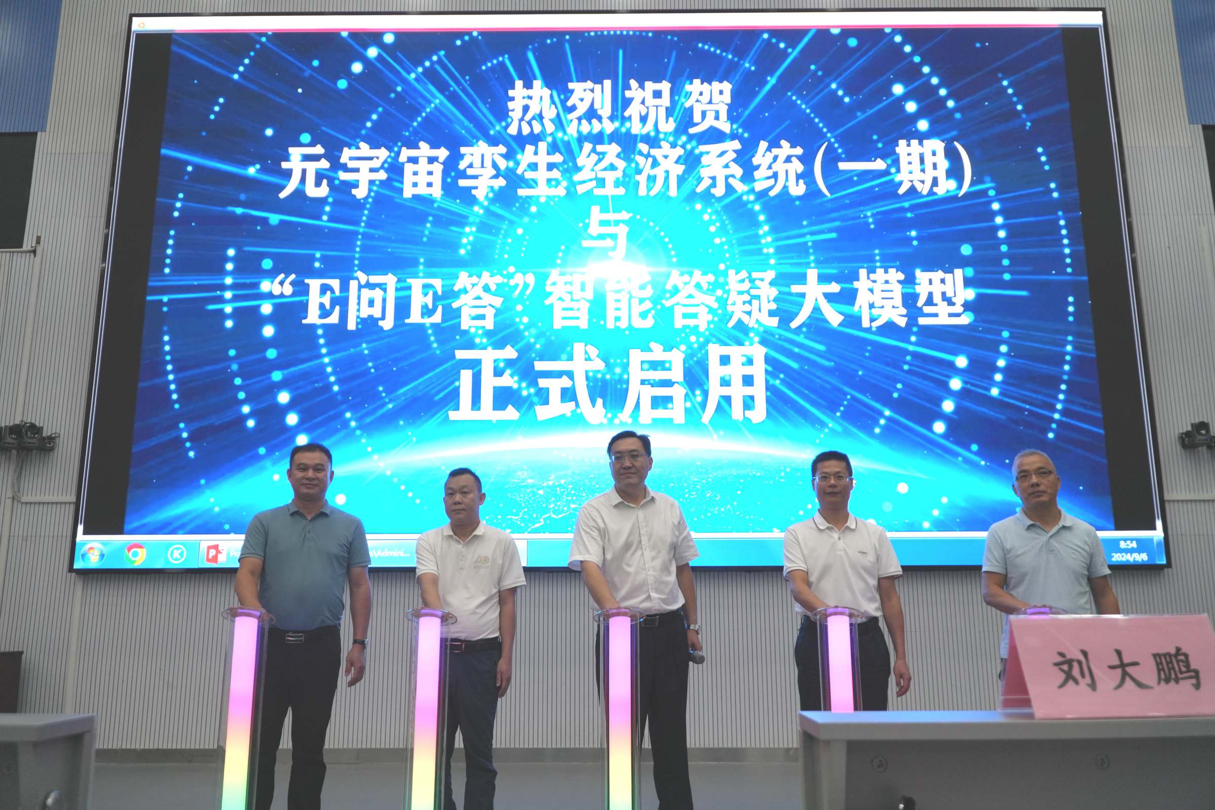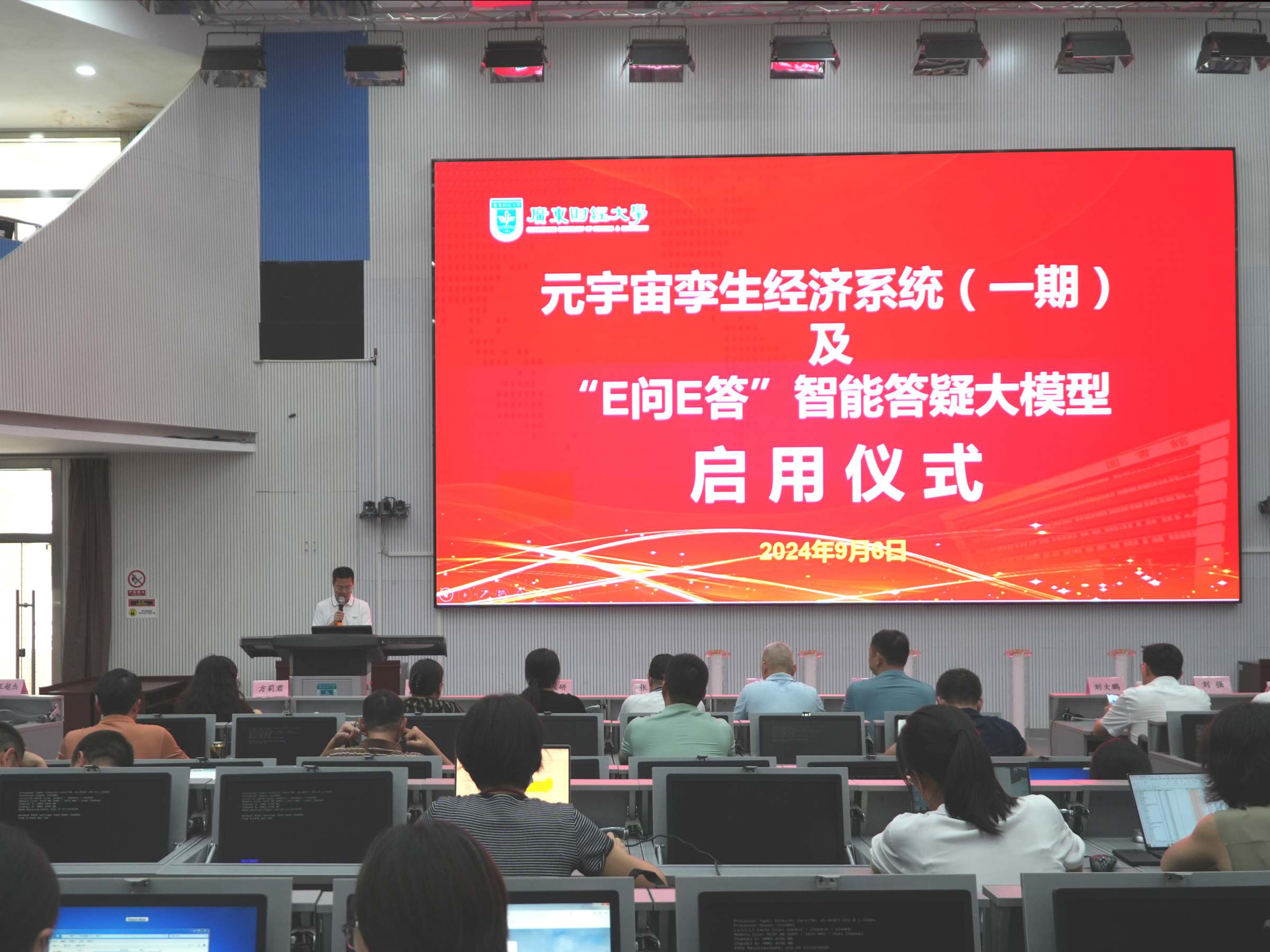 9月6日上午,元宇宙孪生经济系统(一期)及“E问E答”智能答疑大模型启用仪式在经济与管理国家级实验教学示范中心(简称:经管中心)举行。党办校办主任刘大鹏、教务处副处长刘强、经管中心主任姚维保、副主任王超杰、李立君、德胜科技实业发展(深圳)有限公司董事长杨文辉、科伟达(广州)智能科技有限公司执行董事郑先国、校内仿真综合实习总指导、实验教学全体教师出席了启用仪式。