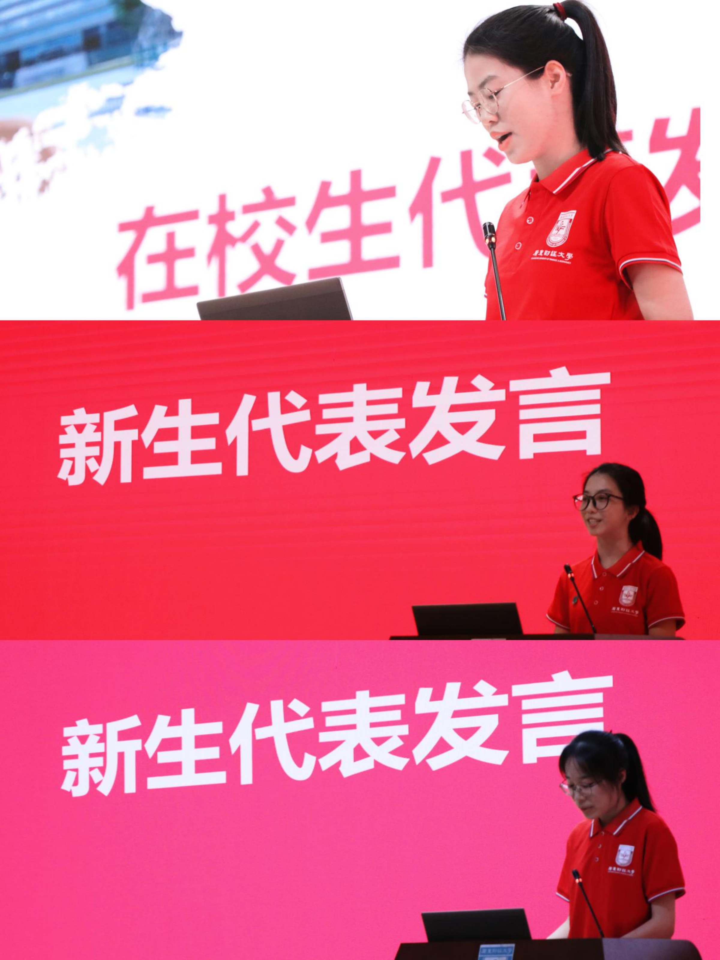 在校生代表林冠钰、本科新生代表林晓云和研究生新生代表王静茹分别上台发言。林冠钰分享了她的大学心路历程,鼓励新生树立目标、勇于探索,并强调脚踏实地、厚积薄发的重要性。她提到在逆境中坚持与成长,呼吁同学们以家国情怀为己任,努力成为有担当、有追求的新时代青年。随后,林晓云和王静茹分别表达了对大学生活的憧憬和期待,并分享了自己的入学感受和未来规划。