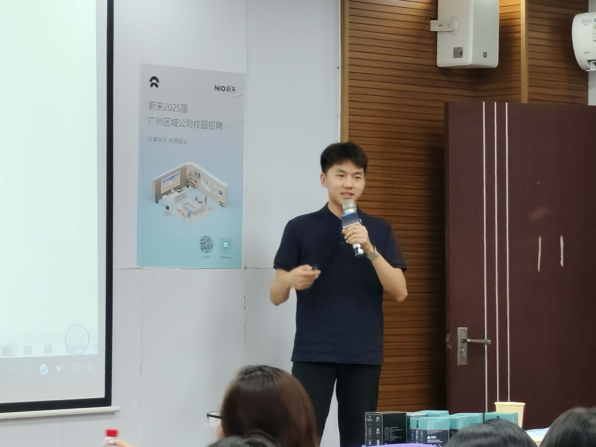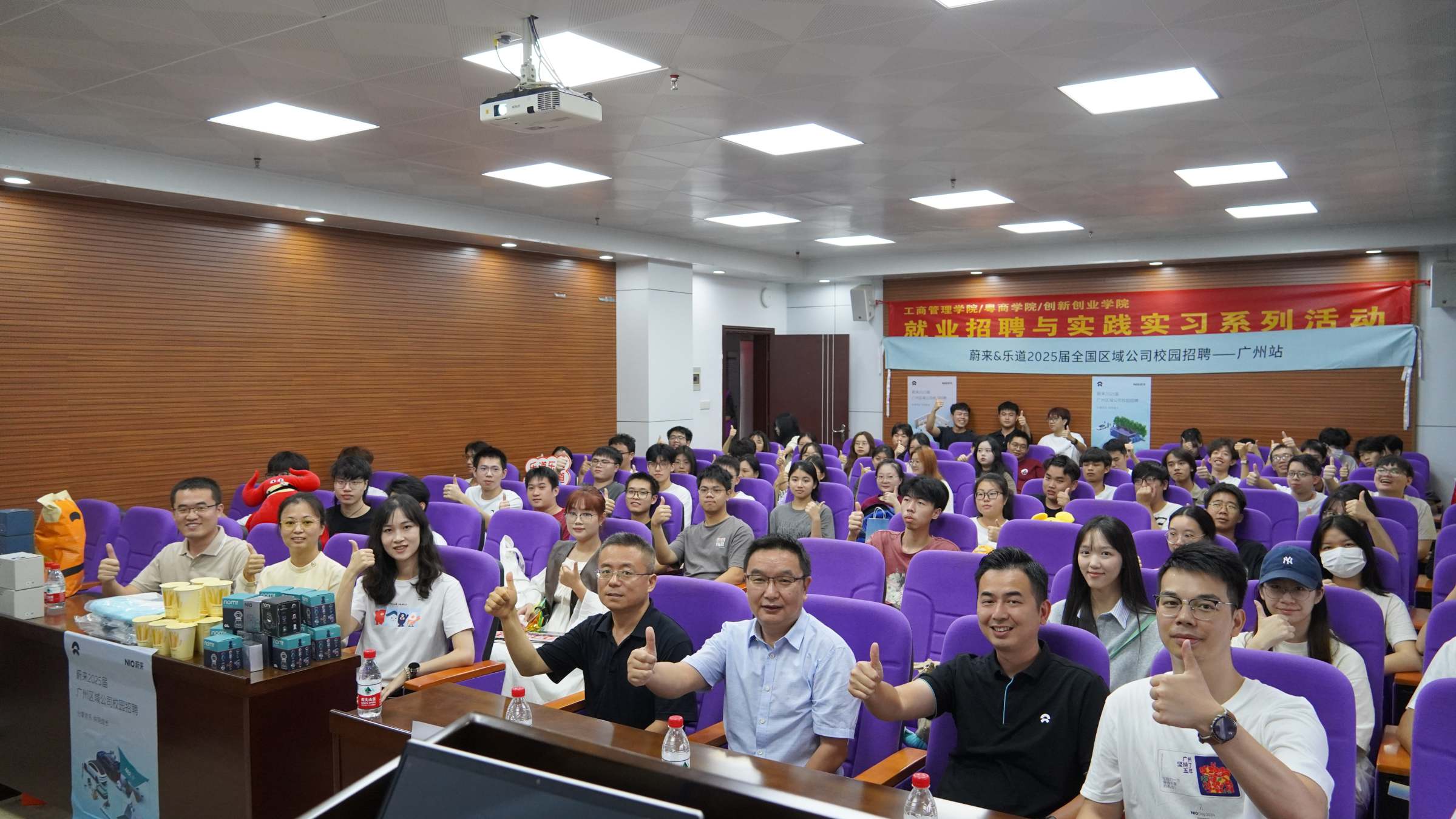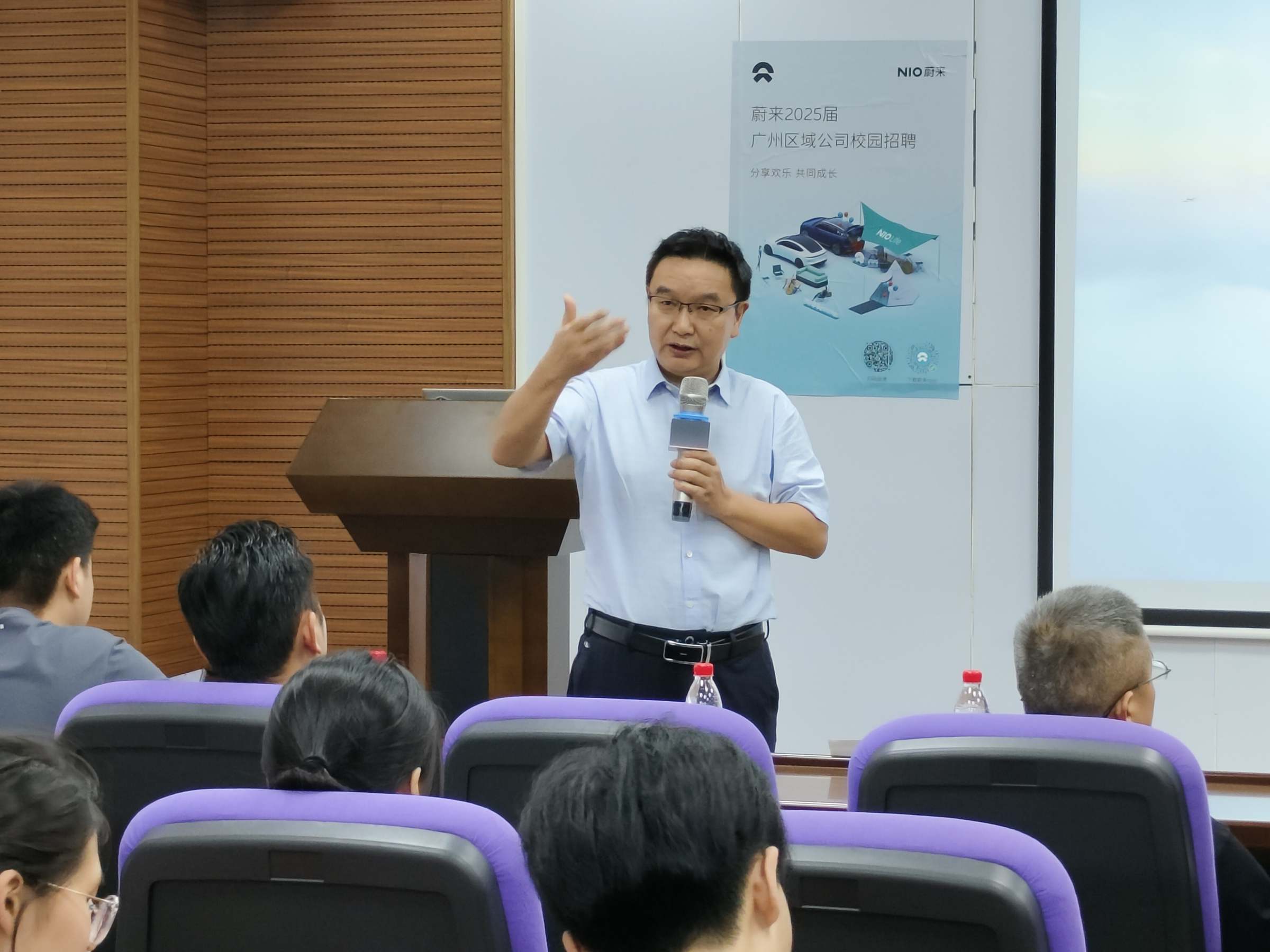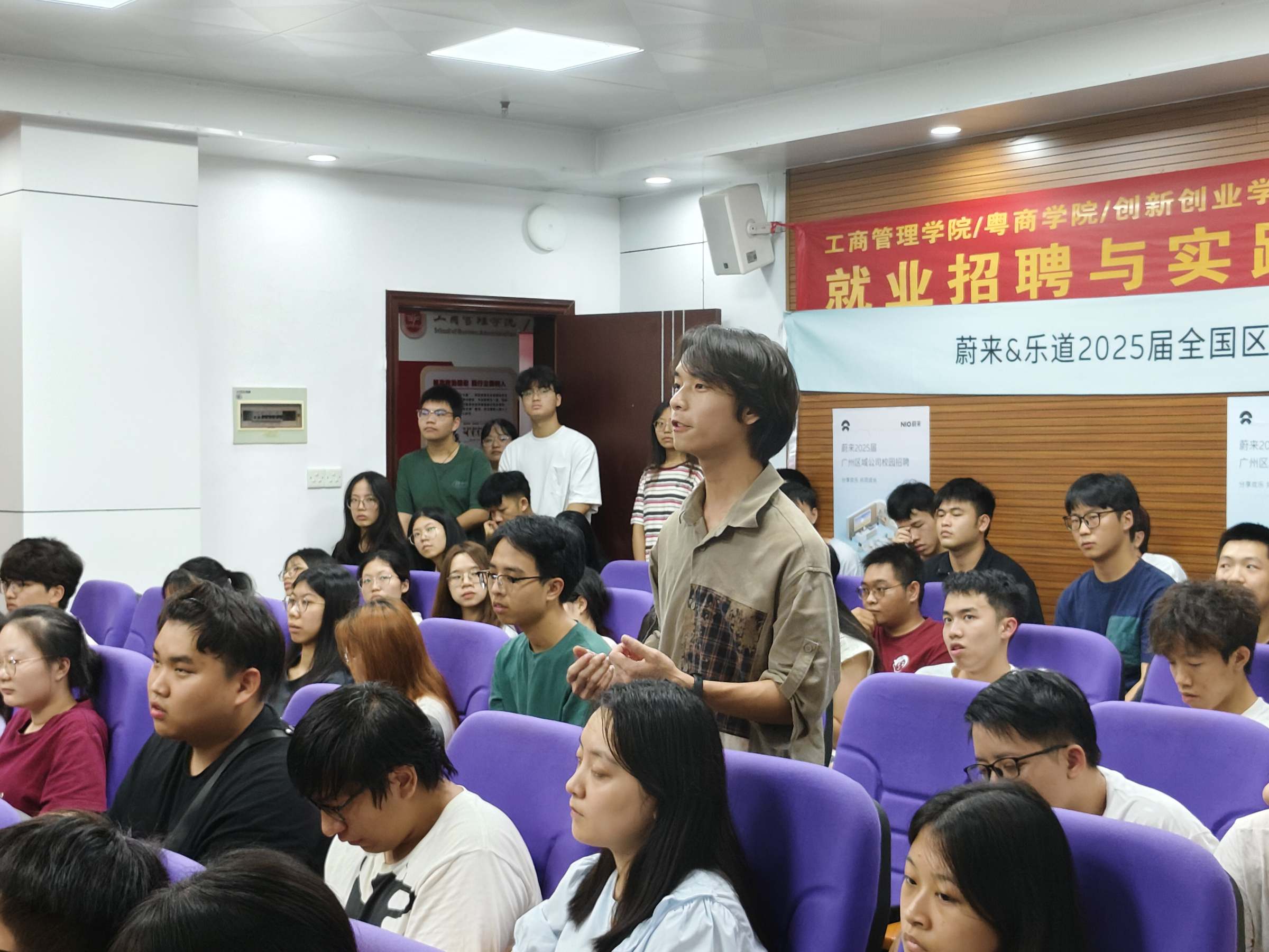 为深入学习贯彻党的二十大和党二十届三中全会精神,全面落实教育部、省教育厅和学校党委对高校毕业生就业工作的决策部署,9月24日下午,工商管理学院/粤商学院/创新创业学院邀请蔚来汽车在广州校区举办蔚来汽车专场招聘宣讲会。蔚来汽车人才招募团队顾问邝国权、广州蔚来市场部负责人李志扬、广州蔚来人力资源负责人郑敏等一行,学院党委书记王德斌、副书记张自广、毕业班辅导员王亮、郭宇睿以及2021级毕业班学生120余人参加了本次招聘宣讲会。