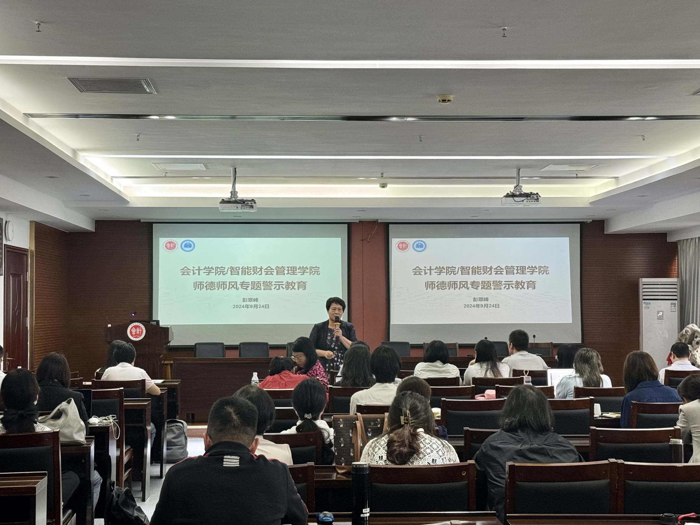 为深入学习贯彻习近平总书记关于加强教师队伍建设重要论述,聚焦落实师德师风第一标准要求,加强师德师风建设,9月24日下午,会计学院/智能财会管理学院在广州校区立德楼543会议室开展师德师风专题警示教育,由学院党委书记彭翠峰主讲,全体教职工参加。