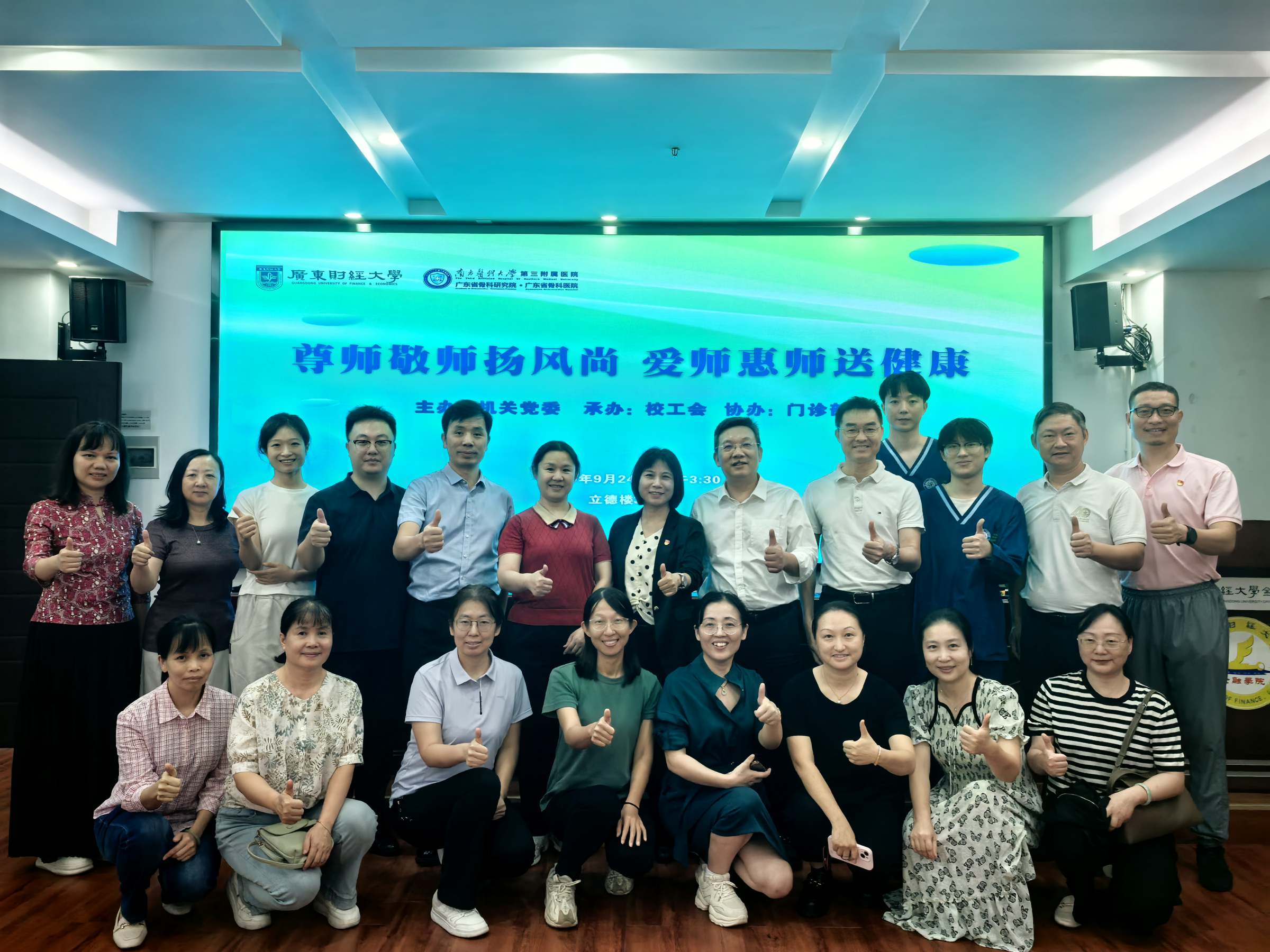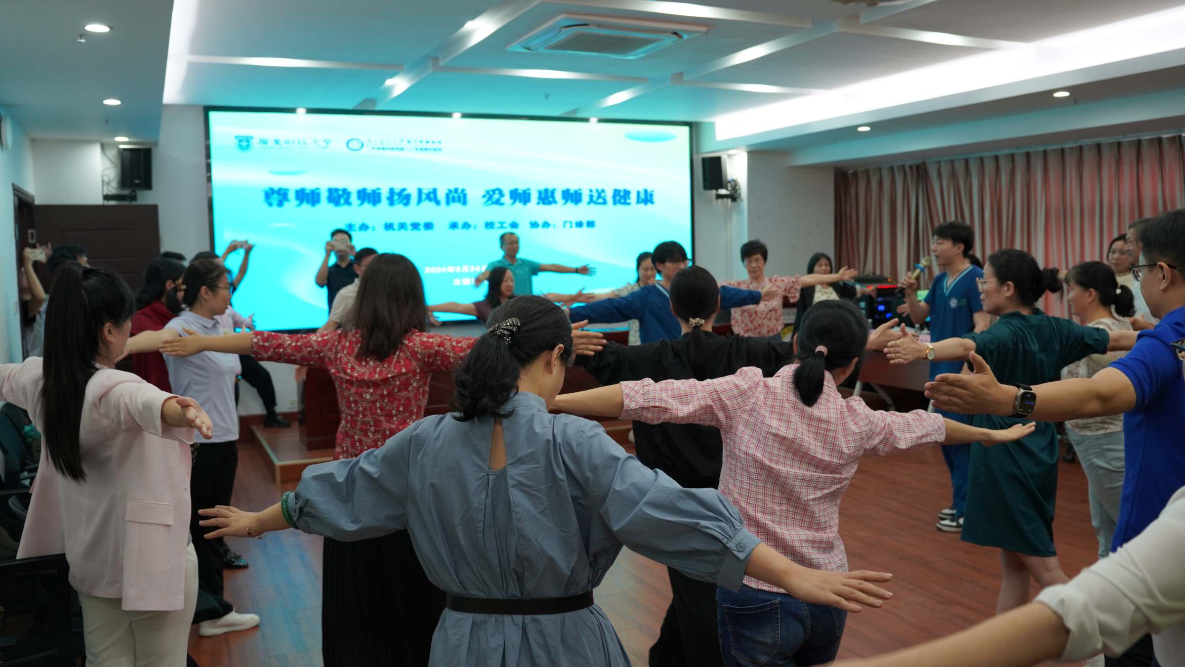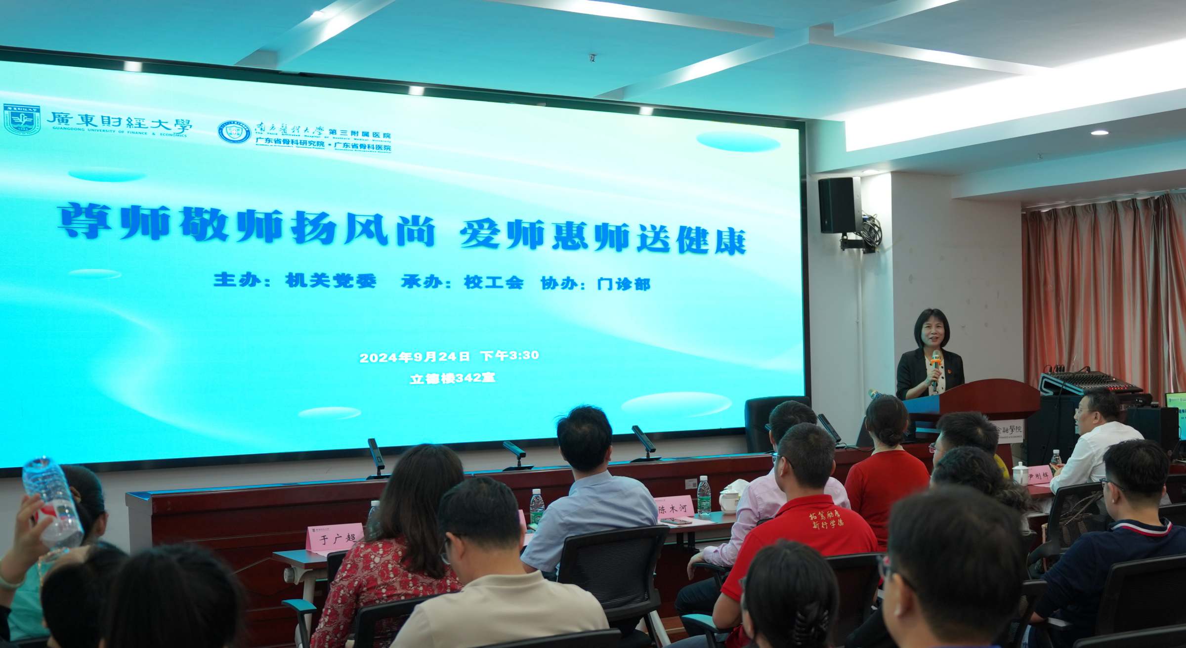 9月24日,由机关党委主办、校工会承办、门诊部协办的“尊师敬师扬风尚,爱师惠师送健康”活动在广州校区开展。机关党委专职副书记陈木河,校工会常务副主席陈红丽,门诊部副主任李超威,南方医科大学第三附属医院康复医学科主任姜丽、中医科主任谢国平、脊柱外科一科主任医师尹刚辉和学校在职教职工约60人参加,活动由陈红丽主持。