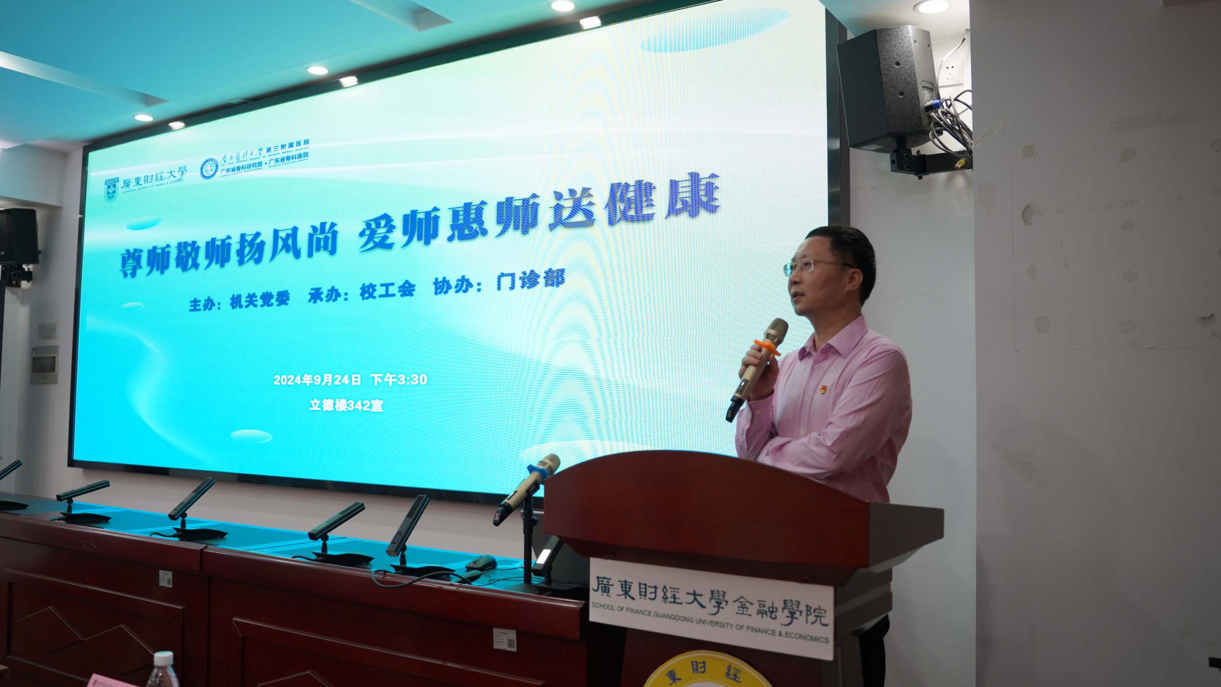 陈木河致词。他指出,在新中国成立75周年之际,在全国上下学习贯彻党的二十届三中全会精神和全国教育大会精神的热潮中,开展“尊师敬师扬风尚,爱师惠师送健康”活动可谓恰逢其时、意义重大。他强调,建设教育强国、推进中国式现代化关键在人才,高校是教育、科技、人才的交汇点,高校教育工作者是培养人才的重要力量,教师们要保障好自身健康,才能更好承担为党育人、为国育才的使命。他希望,学校教职工树牢健康第一的意识,持续为党和国家培养优秀人才,持久为建设大湾区一流财经大学贡献力量。