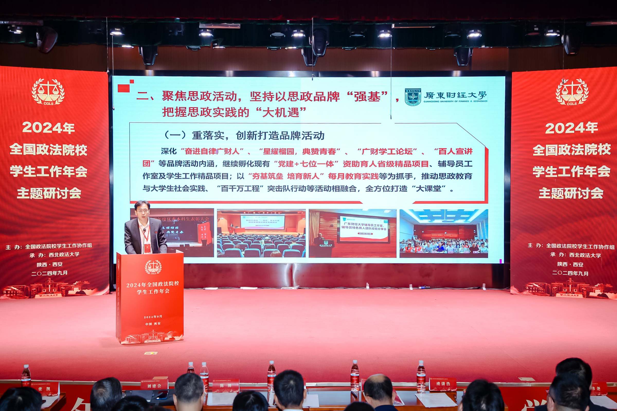 9月23-25日,全国政法院校2024年学生工作年会在西北政法大学召开。本次年会以“挺膺时代担当,书写青春篇章,努力培养高素质法治人才”为主题,围绕“新中国成立以来高校立德树人的机制探索与方法研究”“数字化教育背景下学生工作的新态势、新路径、新方法”等内容,以专家解读、主题发言、经验介绍、分组讨论等方式进行。来自全国政法院校学生工作协作组成员单位的11所院校100余名代表参会。我校副校长张凯带领学工部部长苏明华、副部长李愿方、研工部副部长孙桃丽、人力资源学院党委副书记阮方明、学工部学生管理科李林一行6人参加了会议。